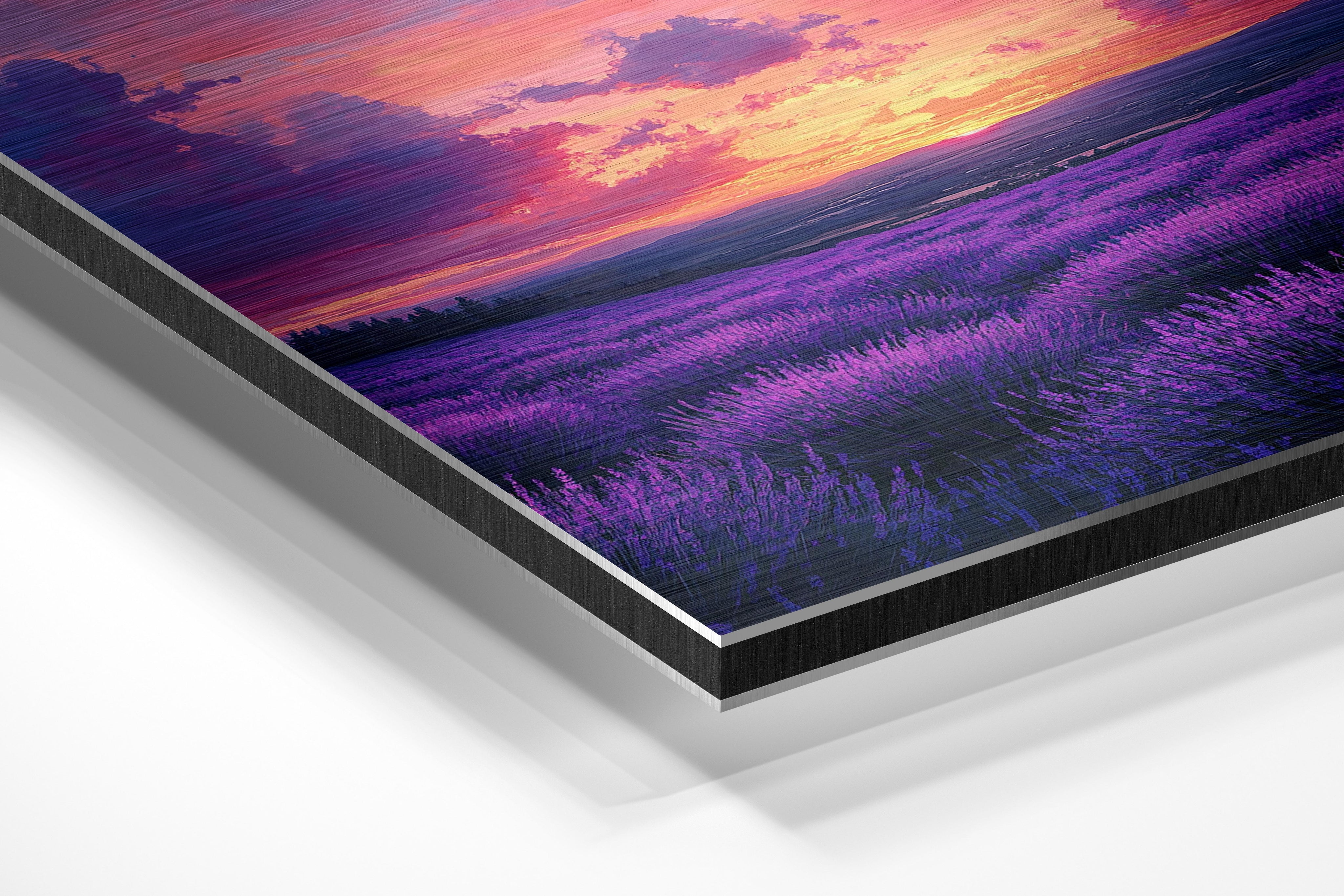 A stunning field of lavender illuminated by a vibrant sunset. The rich purples and fiery hues of the sky create a mesmerizing contrast, offering a serene and captivating view perfect for celebrating nature's elegance.
