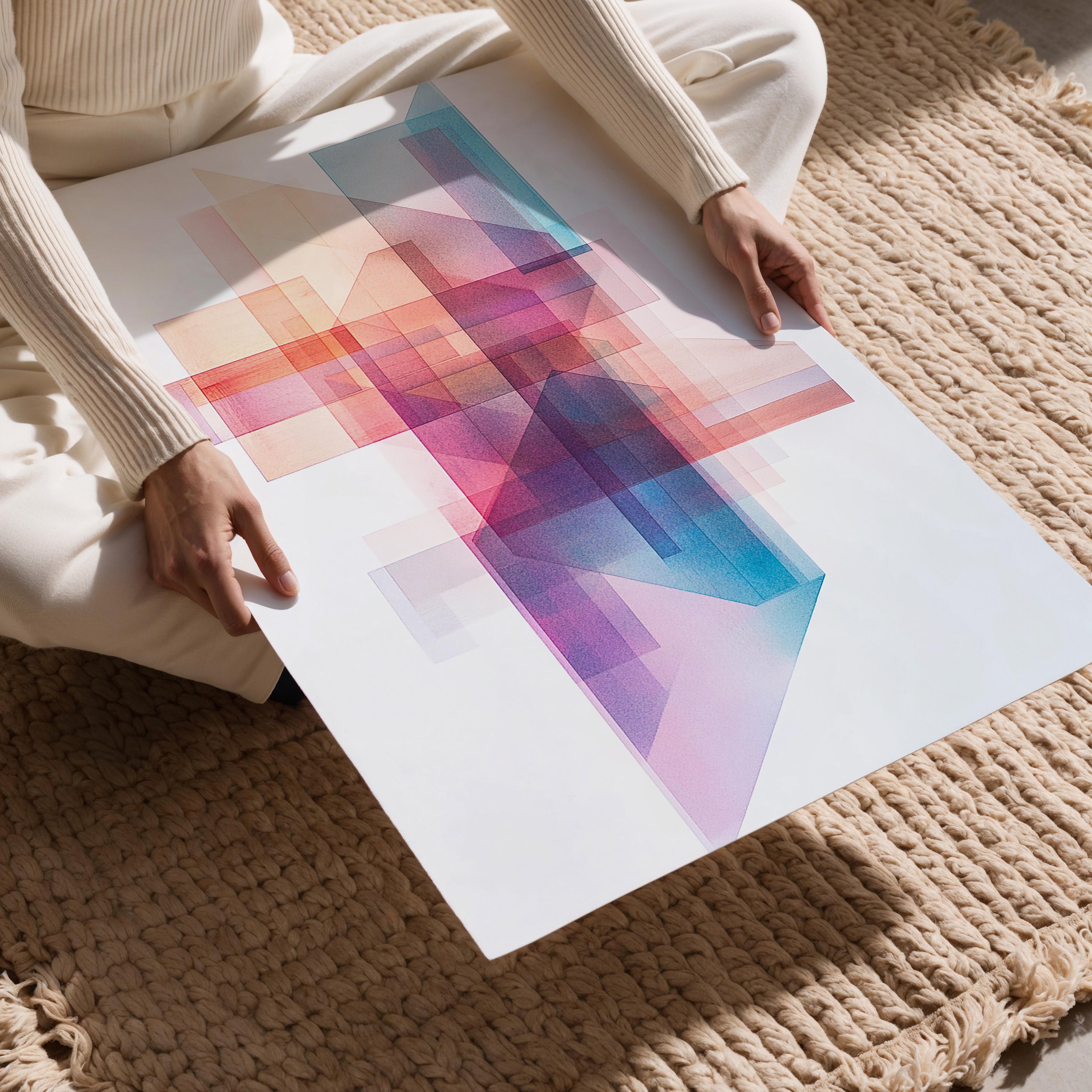 Featuring layered geometric shapes in pinks, blues, and peach tones, this piece achieves a perfect balance of flow and structure. Its translucent, harmonious design adds sophistication to creative or modern interiors. Ideal for offices or gallery walls, it blends energy and refinement. The dynamic yet balanced composition makes it a captivating centerpiece, elevating spaces with a unique, artistic aesthetic. Perfect for enhancing creative, inspiring environments.