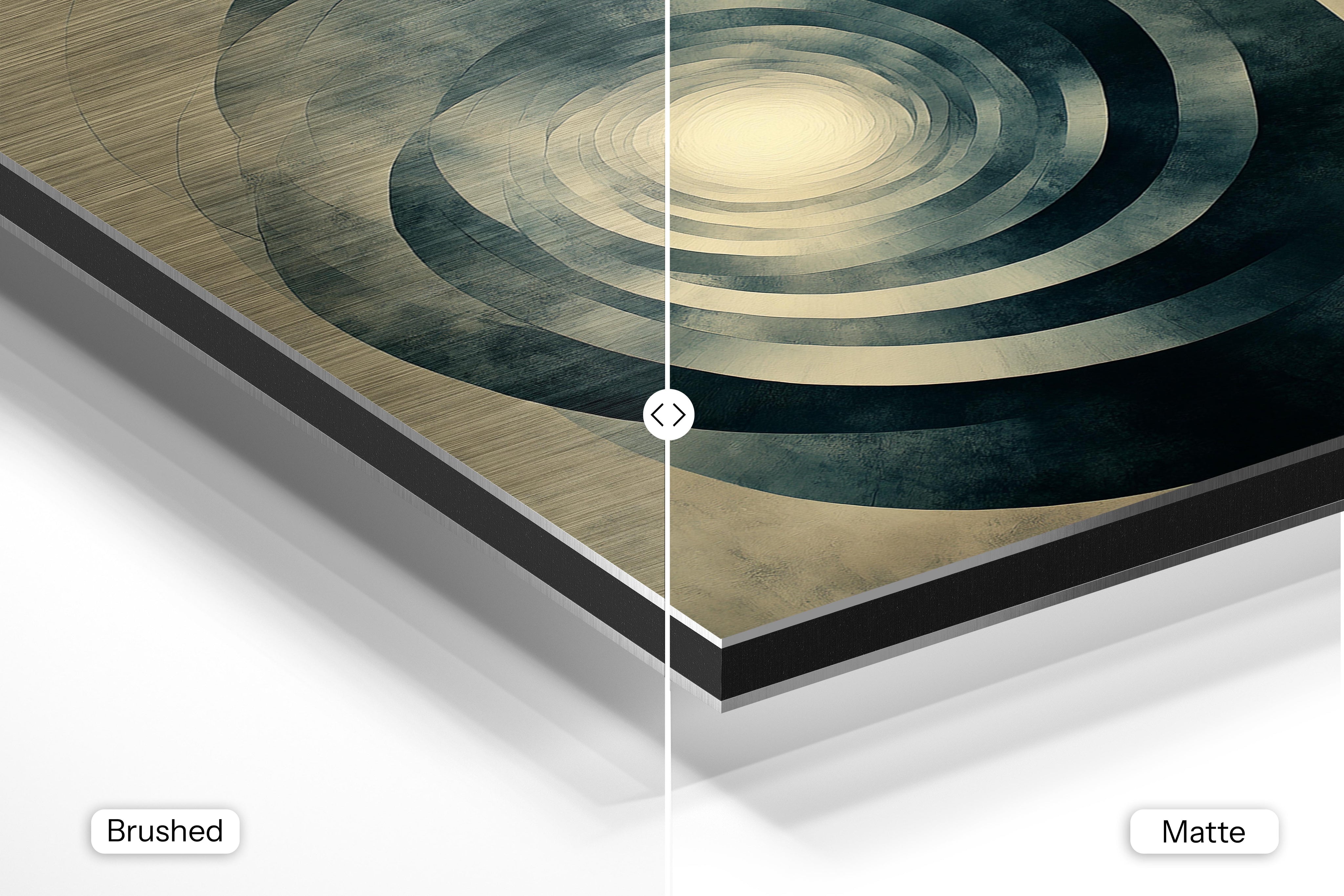 - Brushed Aluminum, on the other hand, features a raw metallic texture with visible brush strokes. Whites and highlights in your image let the silver surface show through, adding a dramatic, shimmering effect. Ideal for black-and-white images, minimalist designs, or abstract art, it creates a bold, industrial vibe with a modern edge.