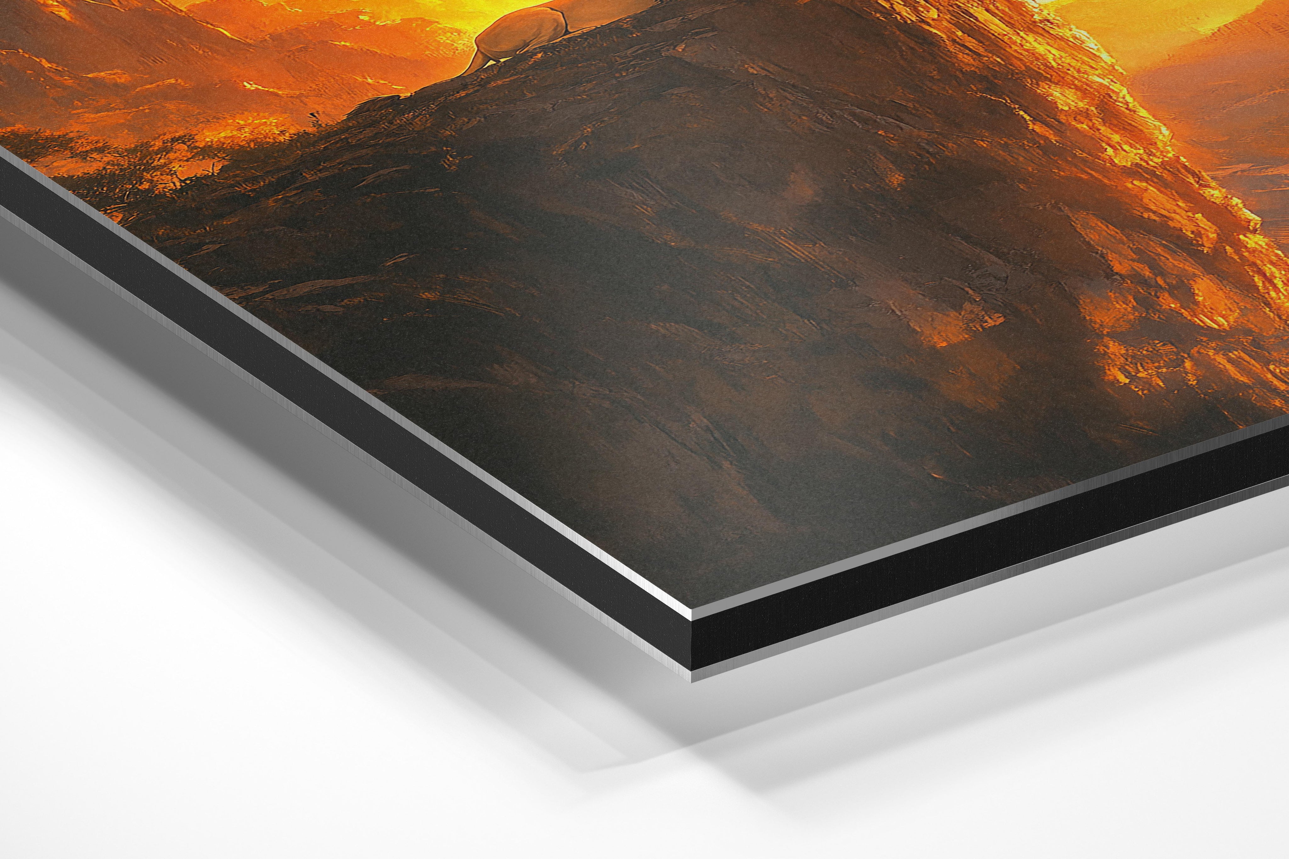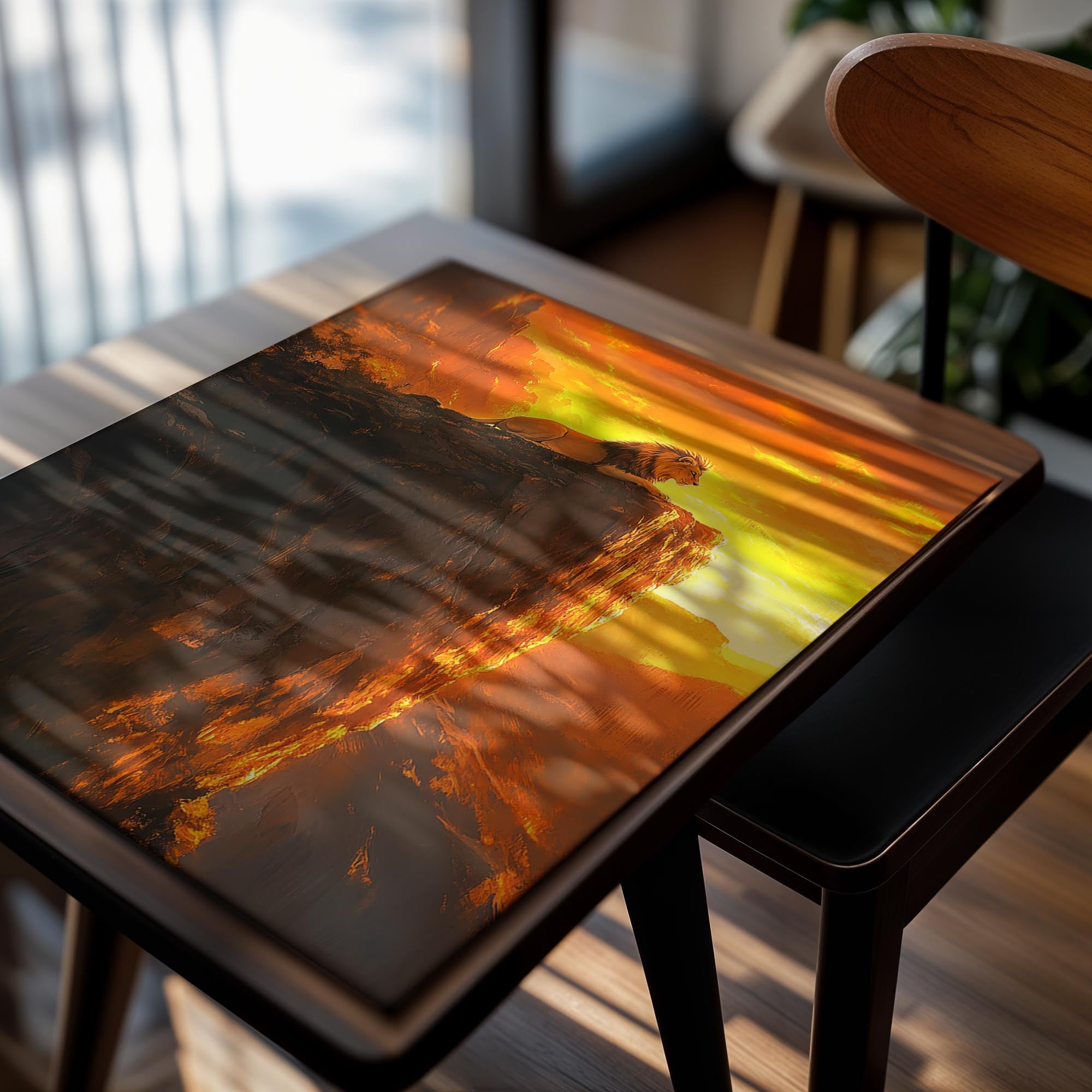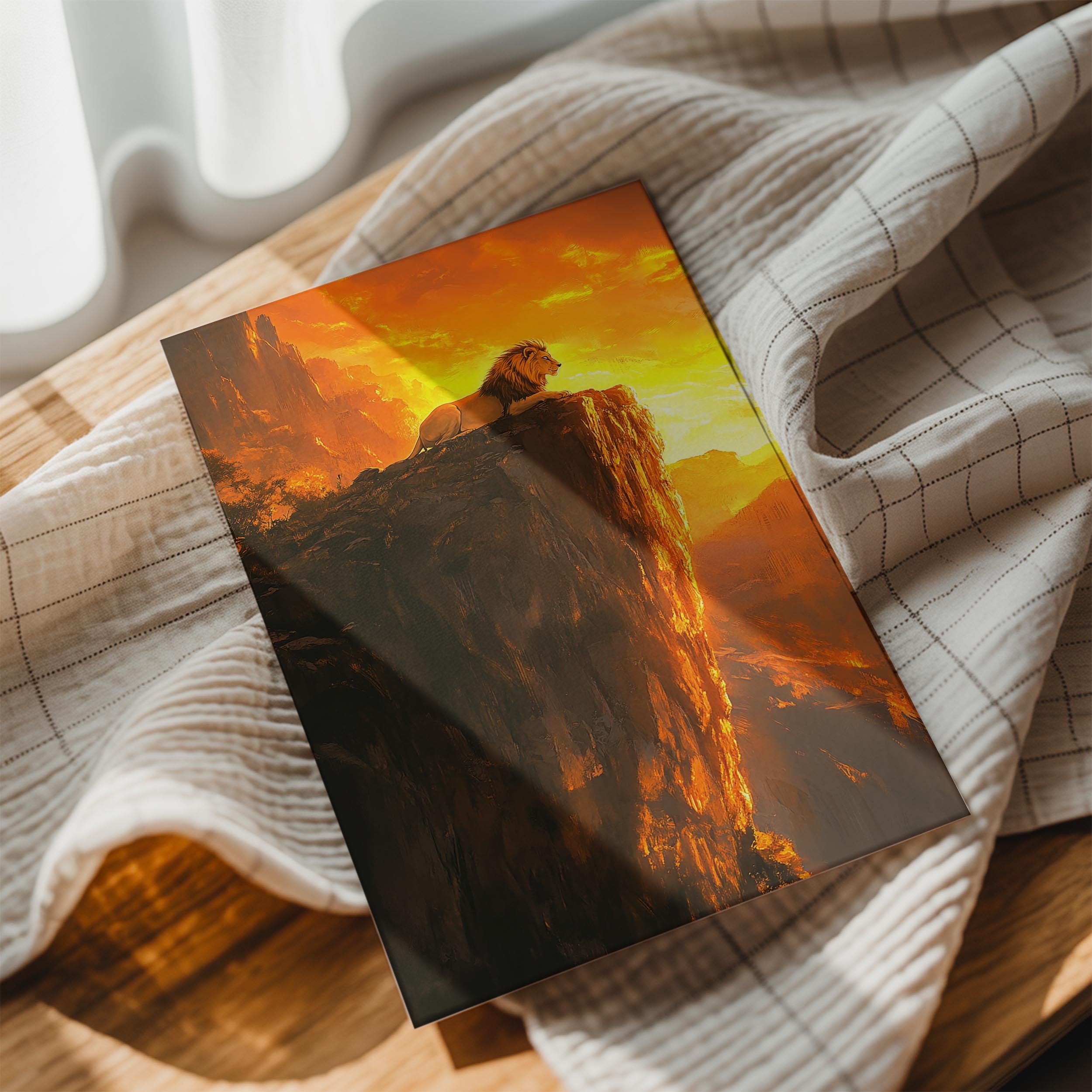 This majestic artwork captures a regal lion overlooking a golden sunset from a towering cliff. The warm hues of orange and yellow create a dramatic and powerful atmosphere, emphasizing the lion's dominance and grace. The painting radiates strength, making it a perfect addition to spaces where motivation and inspiration are key themes, such as home offices, living rooms, or even creative spaces. The grandeur of this scene would complement modern, bold interior decor or serve as a centerpiece in a wildlife-themed collection.