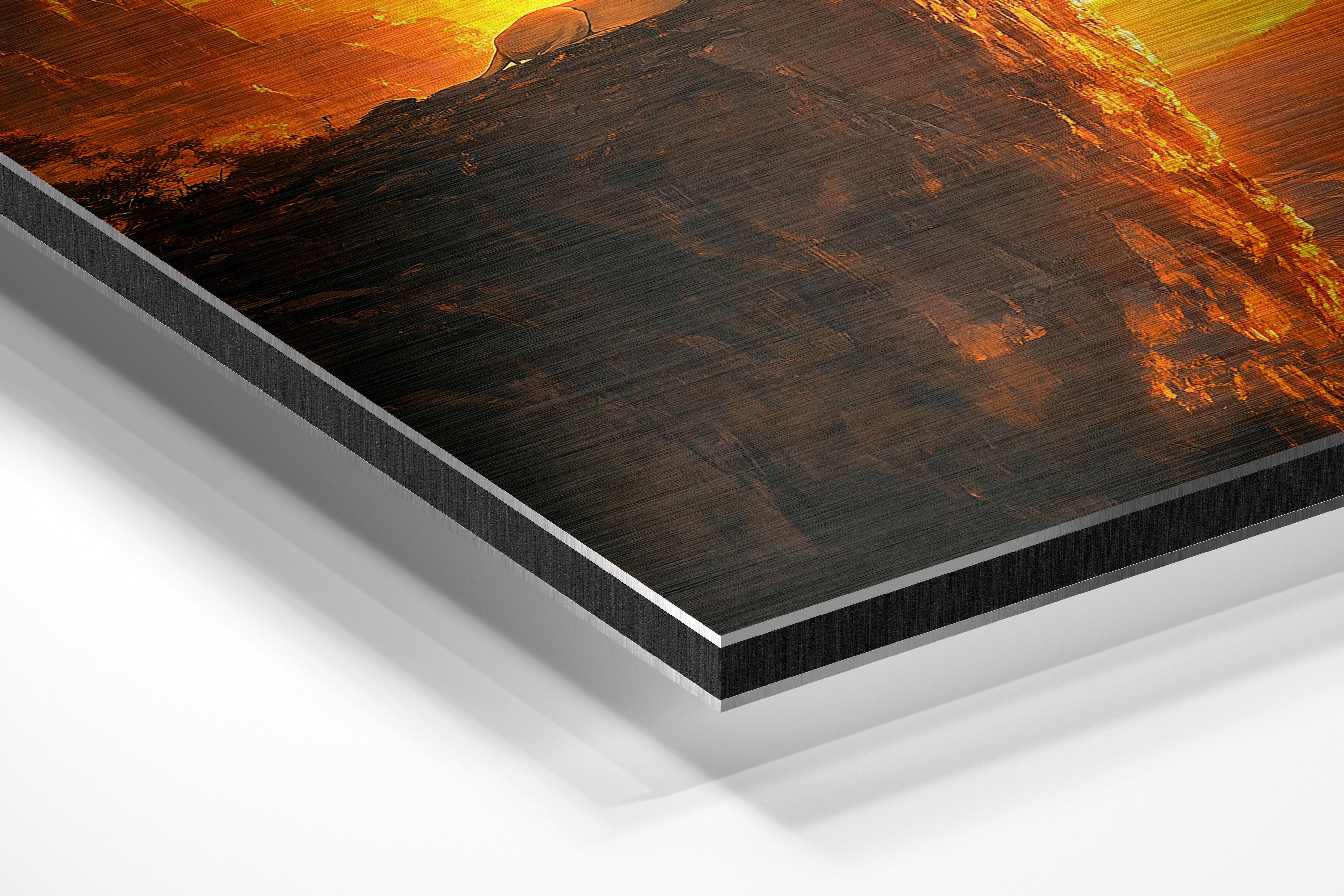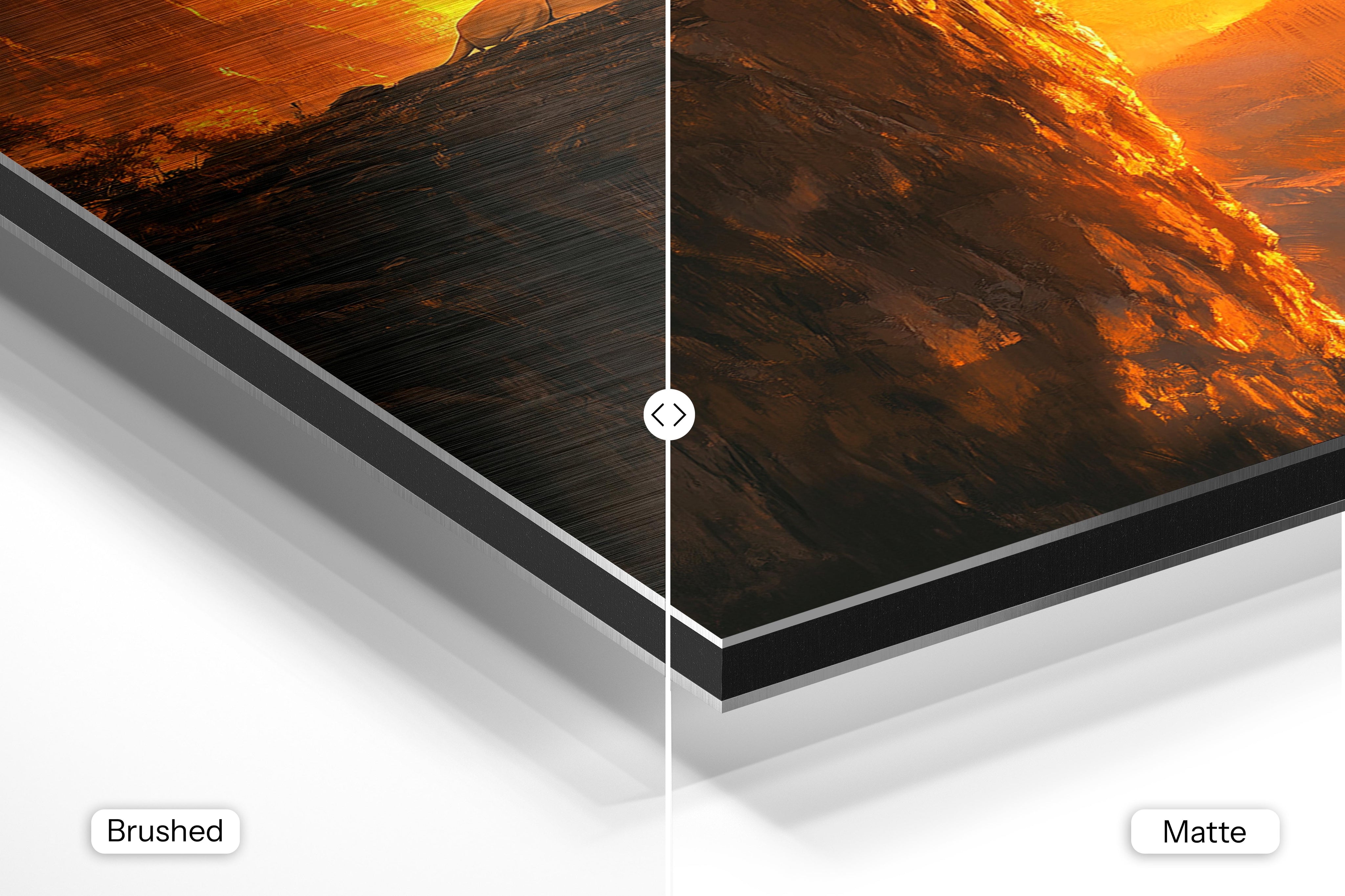- Brushed Aluminum, on the other hand, features a raw metallic texture with visible brush strokes. Whites and highlights in your image let the silver surface show through, adding a dramatic, shimmering effect. Ideal for black-and-white images, minimalist designs, or abstract art, it creates a bold, industrial vibe with a modern edge.