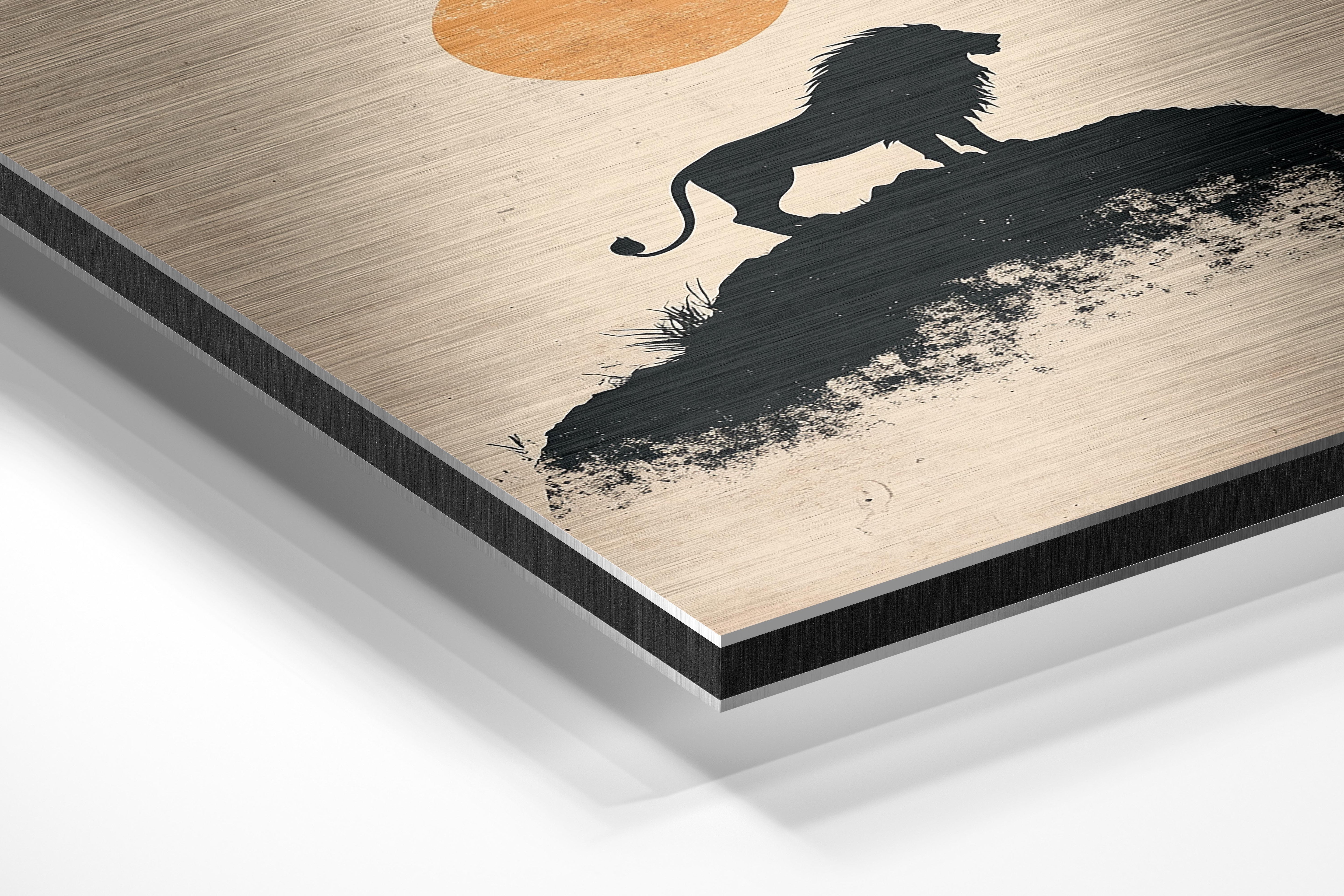 This minimalist yet powerful artwork presents a lion standing on a hilltop against a glowing sunset, rendered in a bold silhouette style. The deep black of the lion and rocky terrain contrasts strikingly with the warm hues of the setting sun, creating a timeless and commanding visual. This piece conveys strength, leadership, and resilience, making it an excellent choice for motivational spaces, masculine interiors, or modern decor that values bold simplicity. Perfect for offices, studies, or wildlife-themed collections.