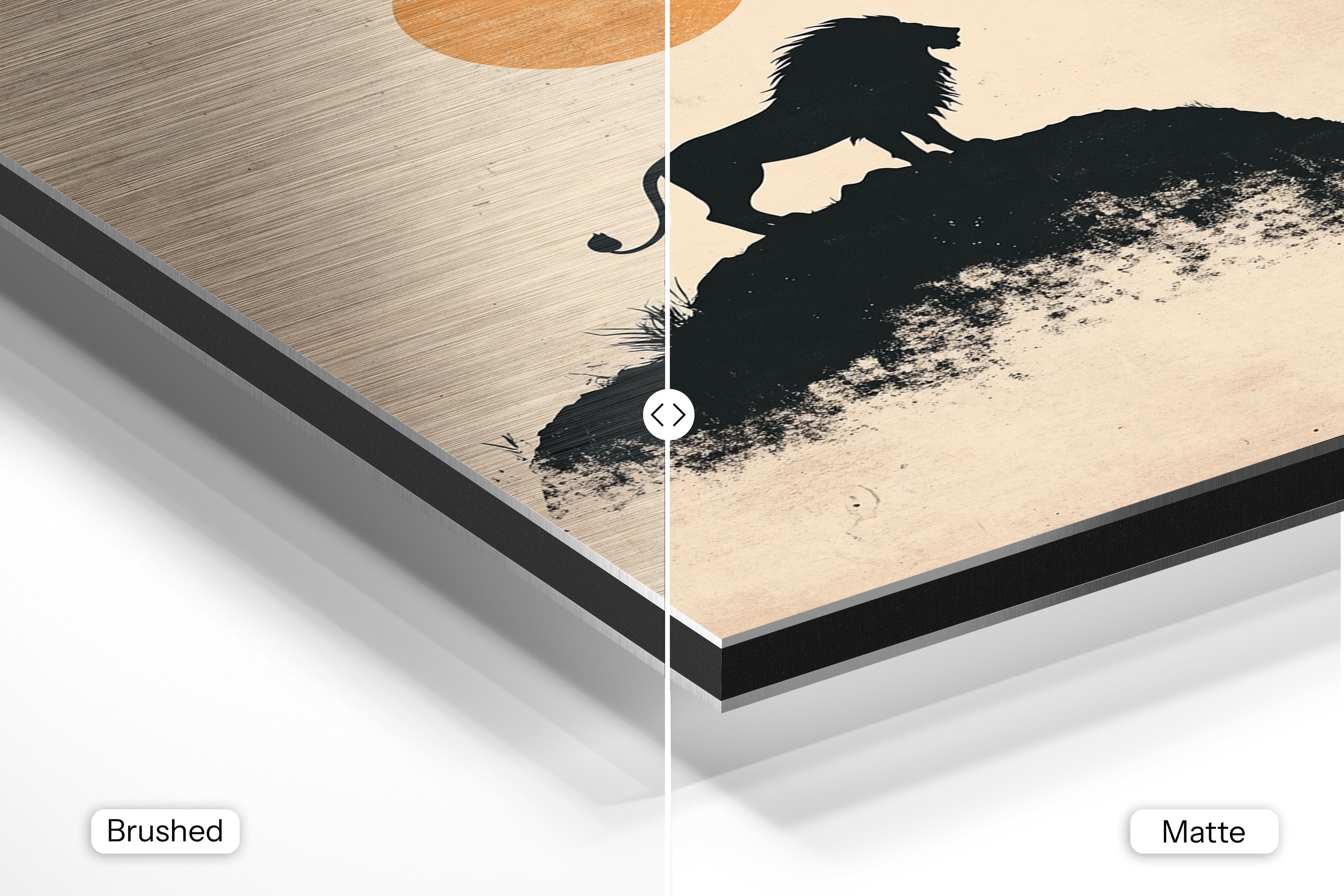 - Brushed Aluminum, on the other hand, features a raw metallic texture with visible brush strokes. Whites and highlights in your image let the silver surface show through, adding a dramatic, shimmering effect. Ideal for black-and-white images, minimalist designs, or abstract art, it creates a bold, industrial vibe with a modern edge.