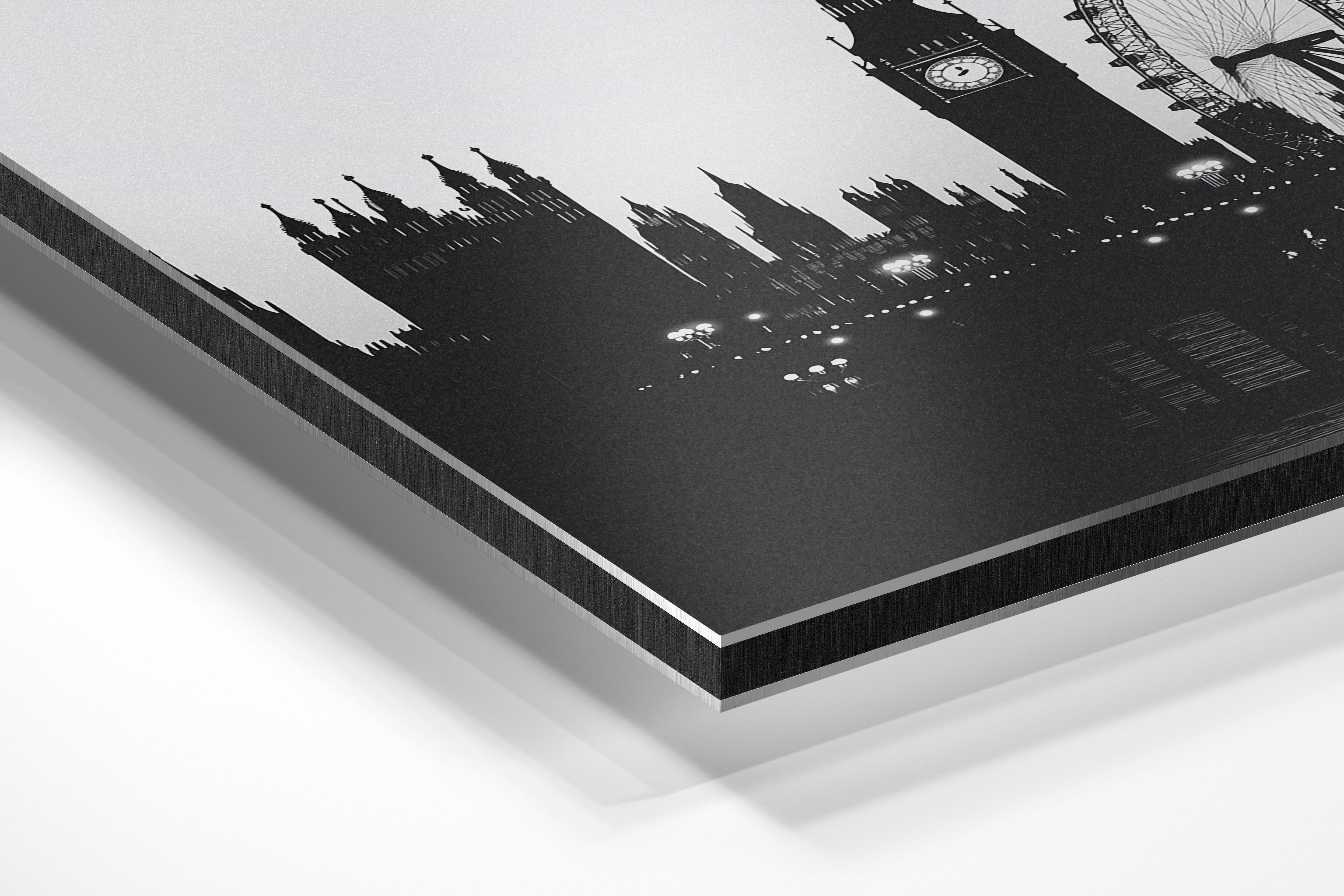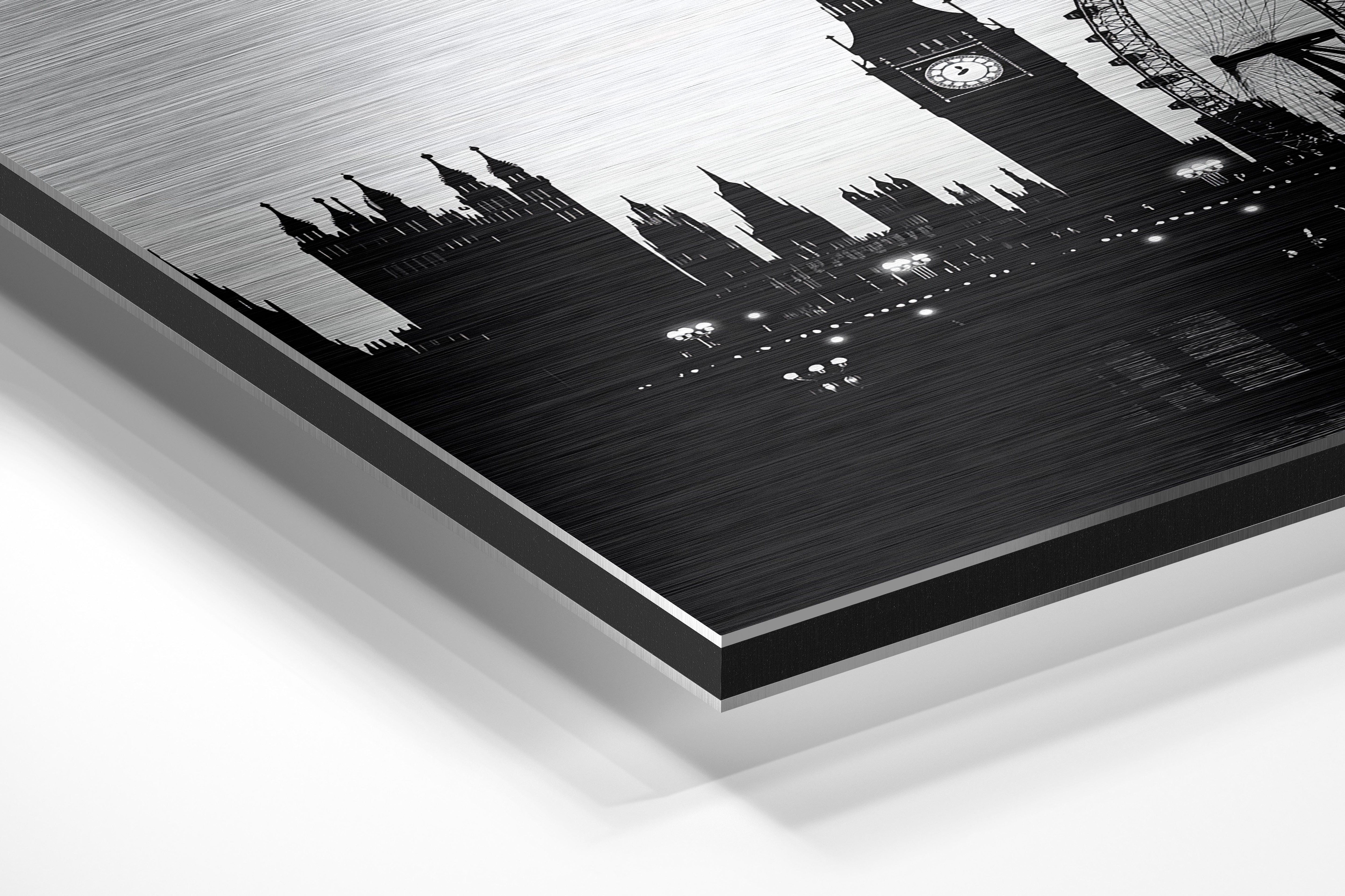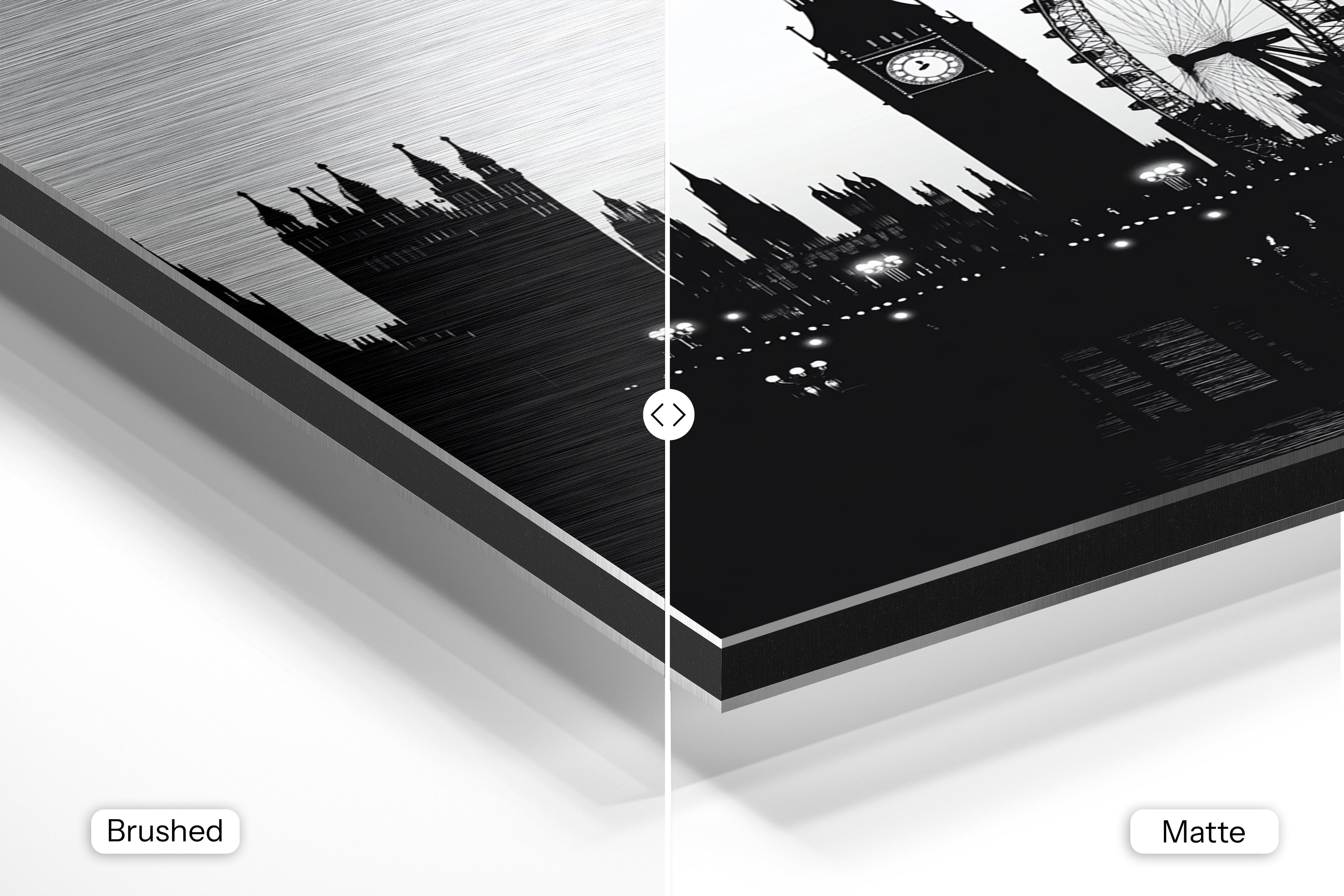 - Brushed Aluminum, on the other hand, features a raw metallic texture with visible brush strokes. Whites and highlights in your image let the silver surface show through, adding a dramatic, shimmering effect. Ideal for black-and-white images, minimalist designs, or abstract art, it creates a bold, industrial vibe with a modern edge.