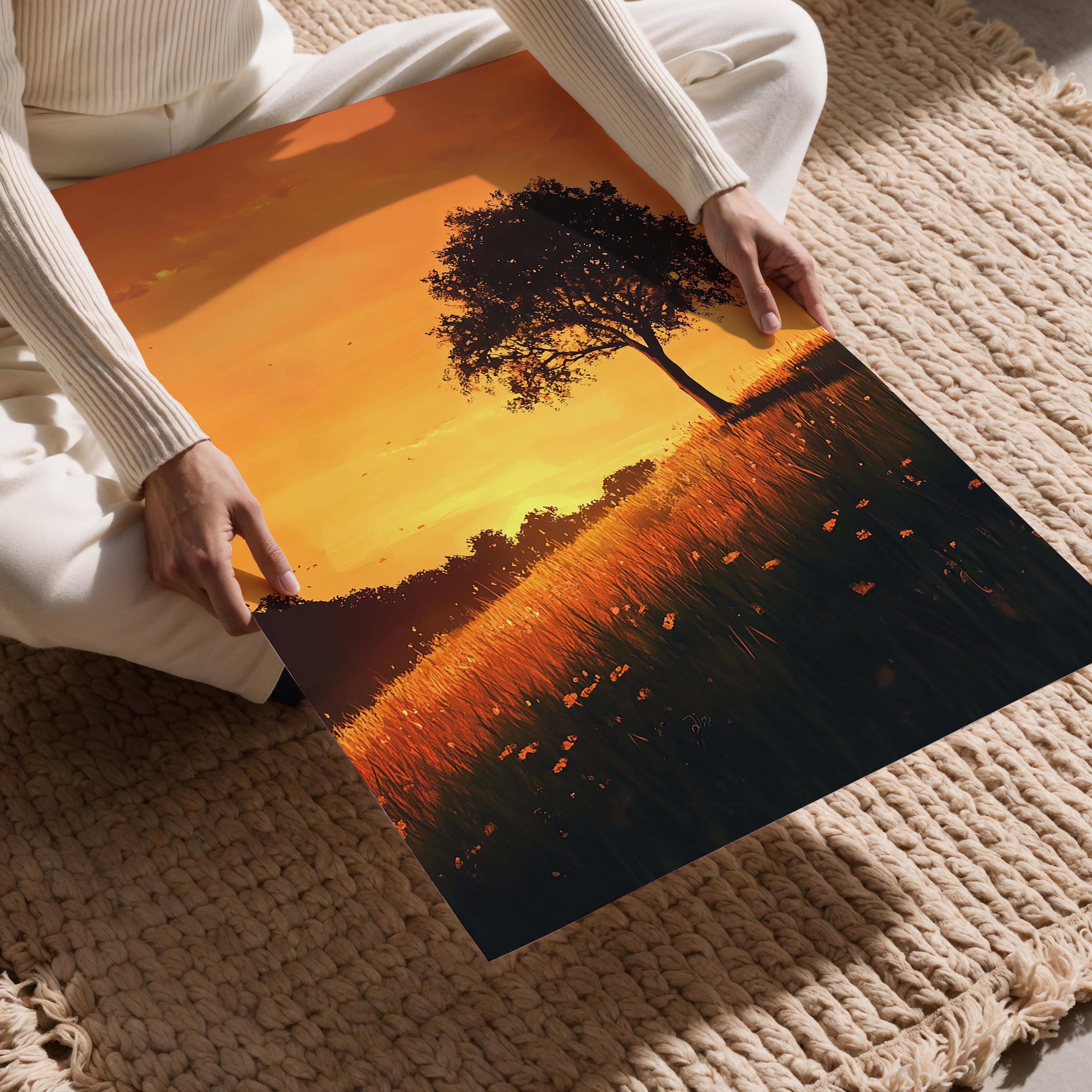 A solitary tree silhouetted against a golden sunset, standing in a field of glowing grass. This iconic image captures the timeless beauty of solitude in nature, inspiring reflections on serenity and resilience. The warm hues of the sunset create a calming atmosphere, making it ideal for mindfulness campaigns, inspirational visuals, or branding that celebrates the simple elegance of the natural world.