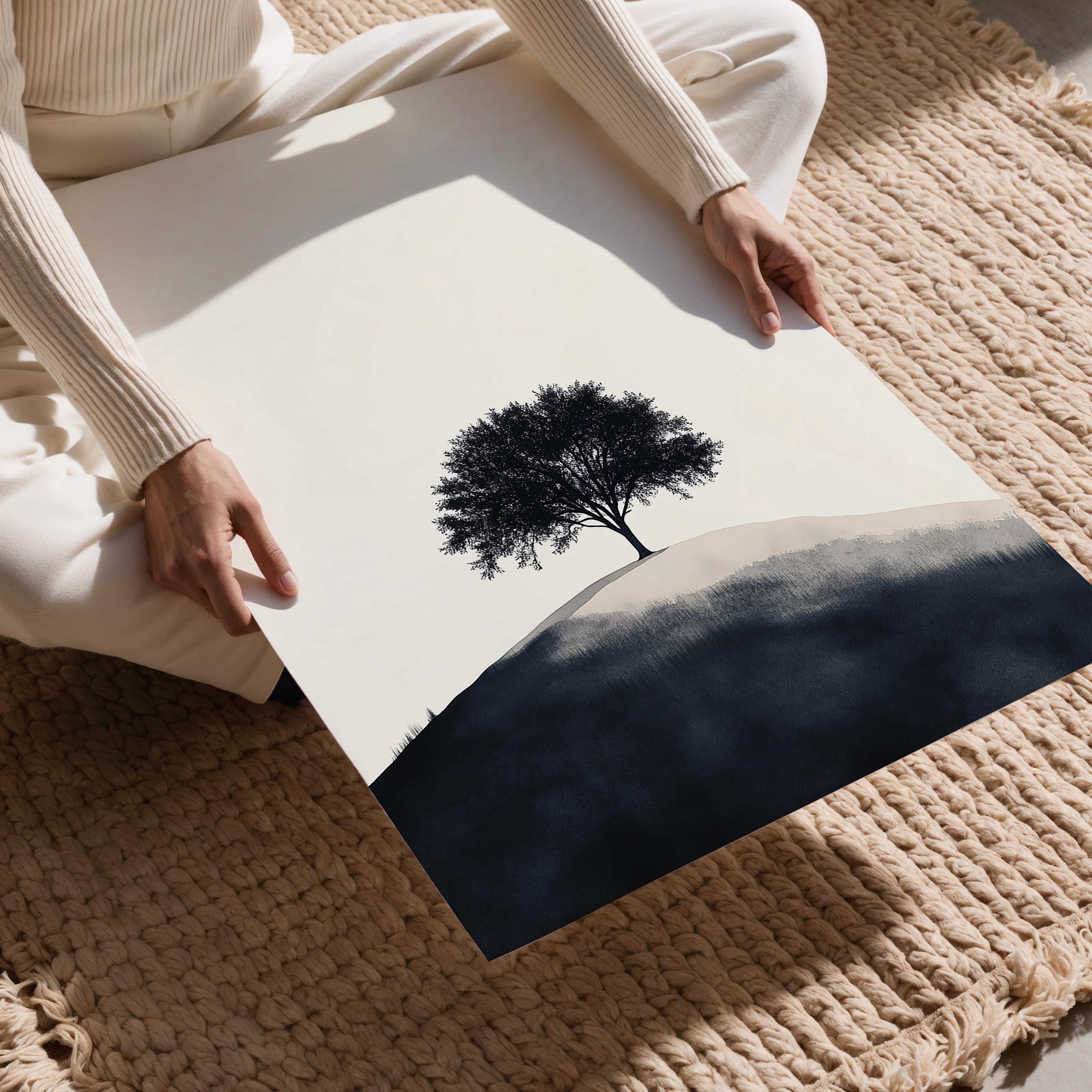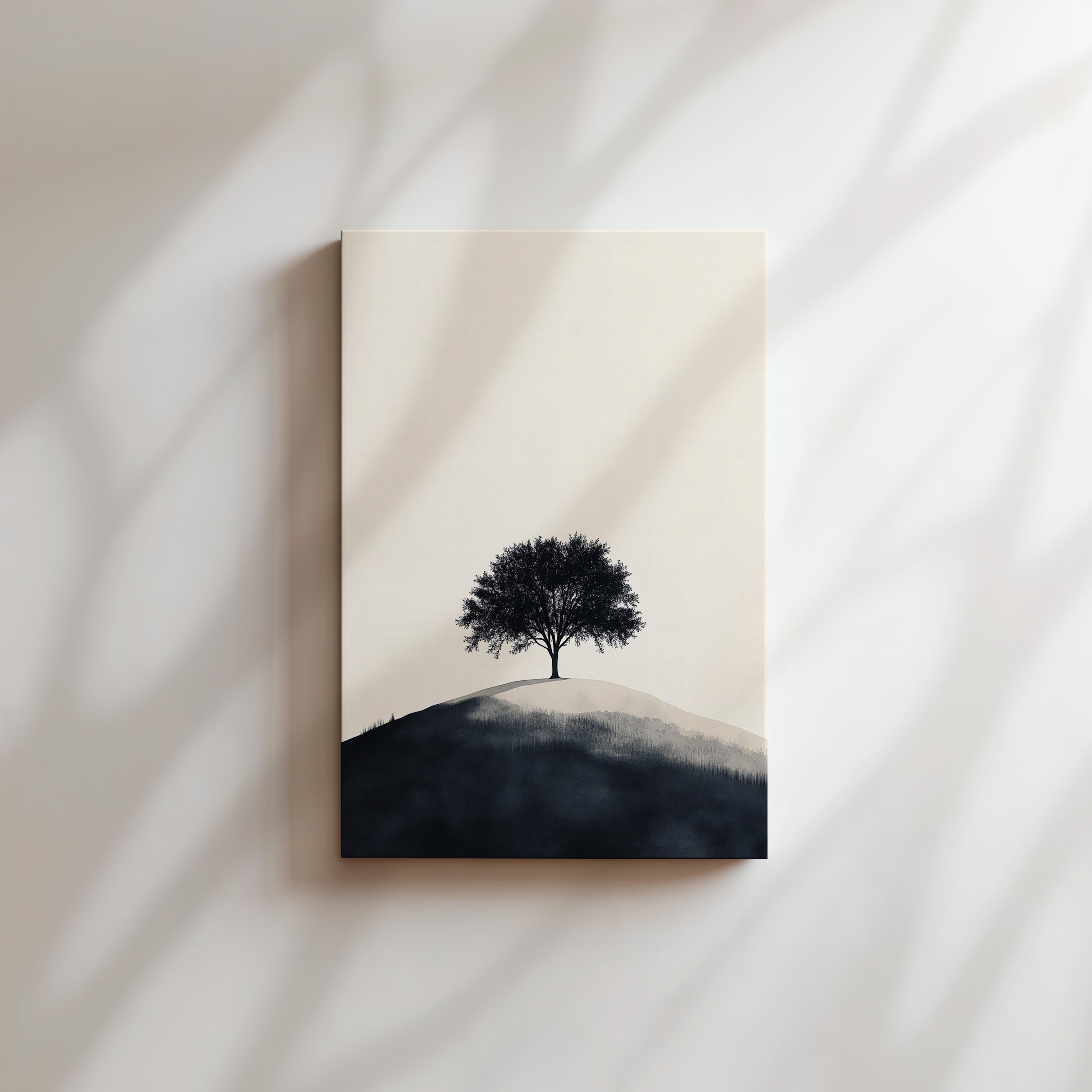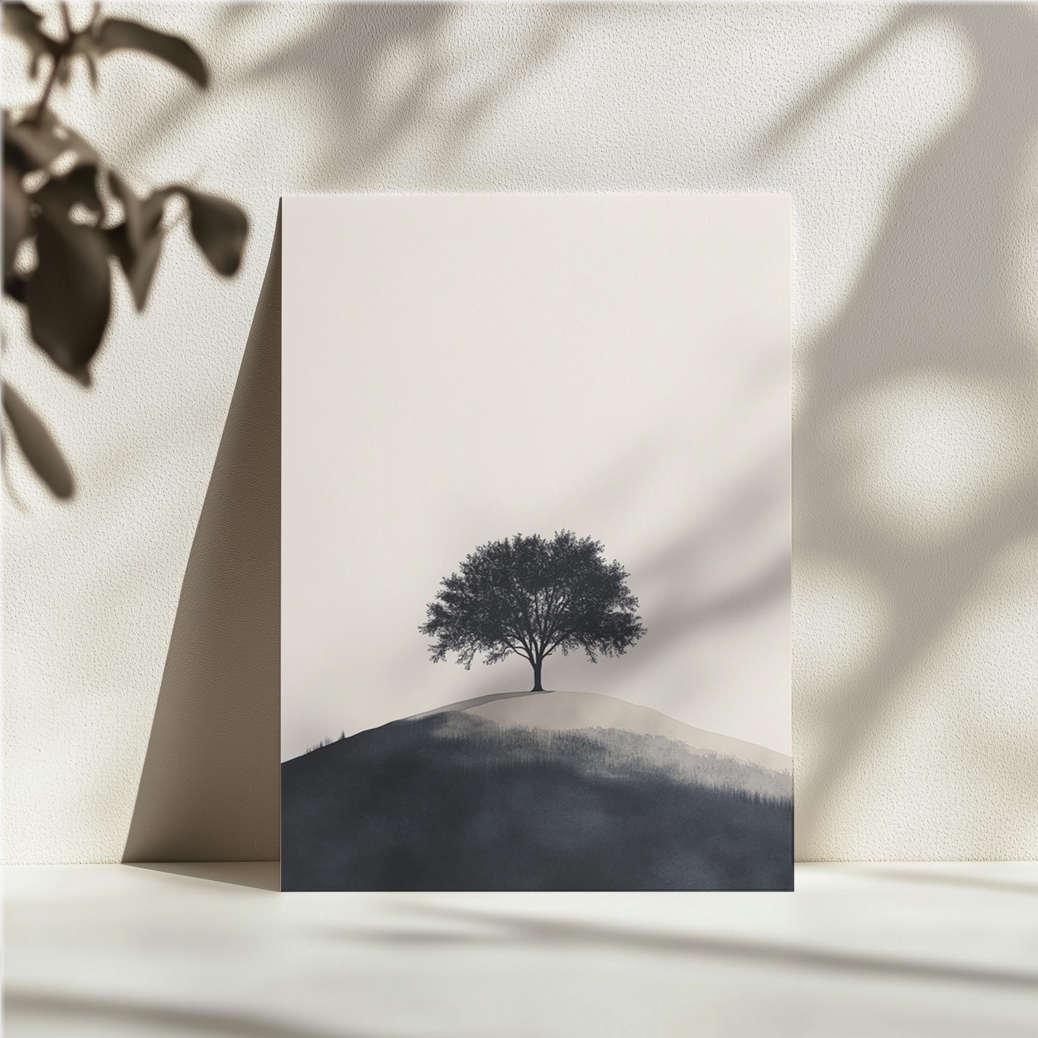 A minimalist and serene illustration of a single tree standing on a gentle hill, surrounded by a soft, atmospheric backdrop. This piece symbolizes solitude, resilience, and natural beauty, making it perfect for tranquil spaces like bedrooms, studies, or meditation areas. Its clean design and monochromatic palette allow it to blend seamlessly with modern or rustic decor, inviting viewers to reflect and find peace.