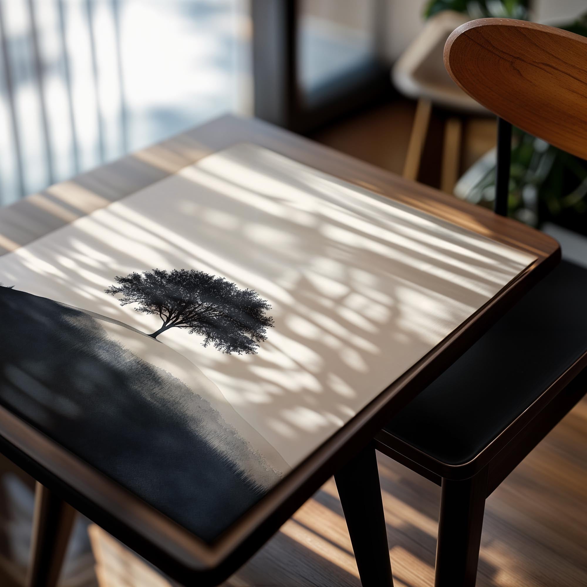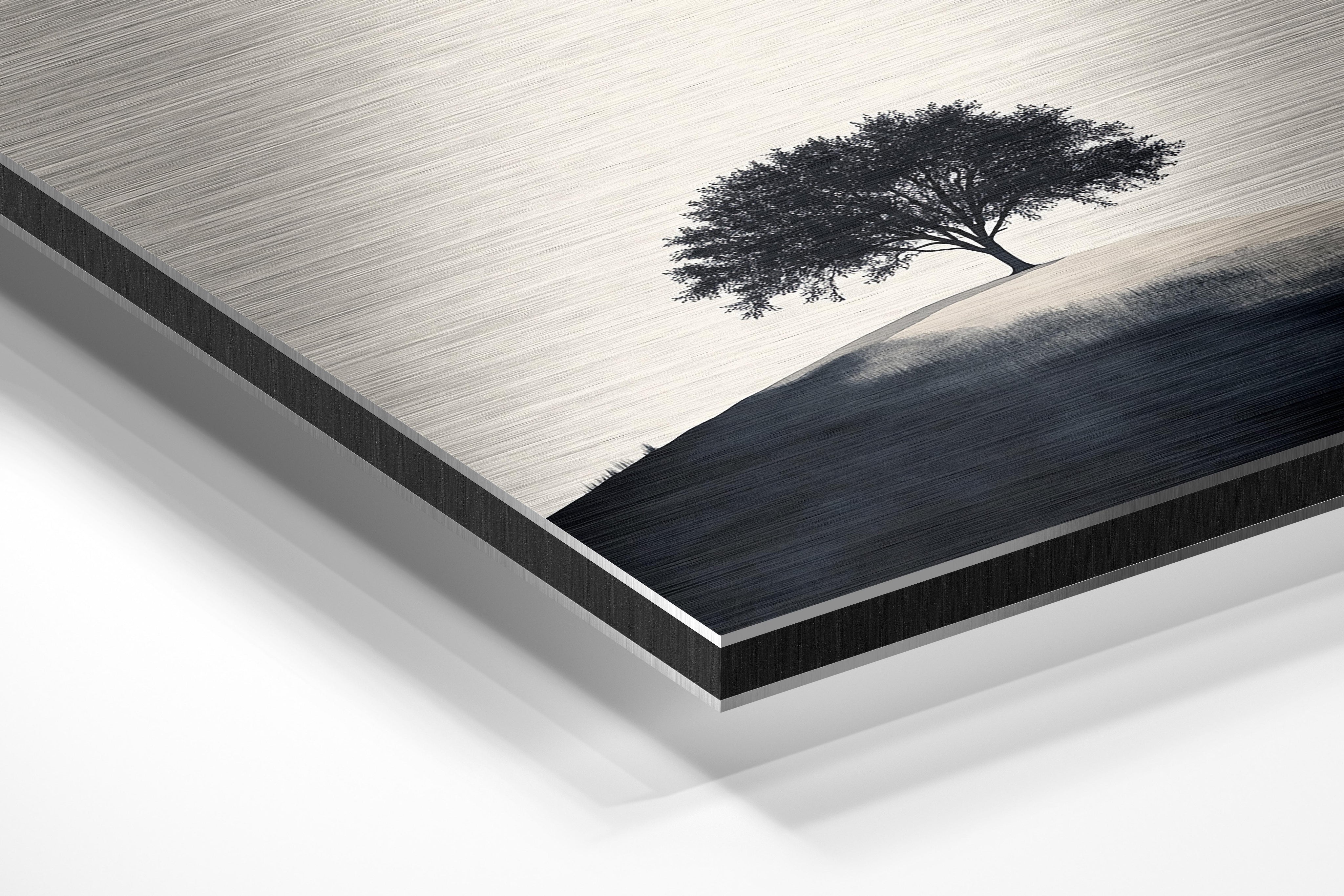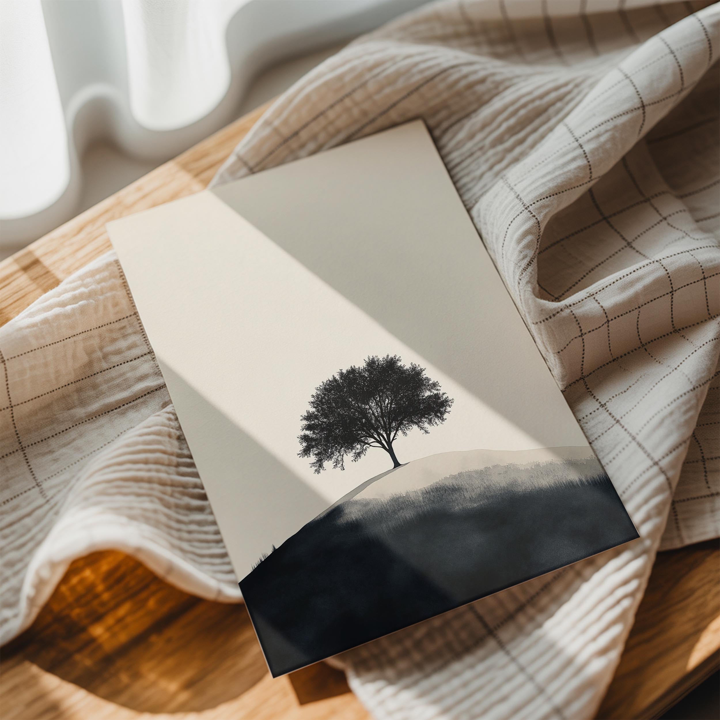 A minimalist and serene illustration of a single tree standing on a gentle hill, surrounded by a soft, atmospheric backdrop. This piece symbolizes solitude, resilience, and natural beauty, making it perfect for tranquil spaces like bedrooms, studies, or meditation areas. Its clean design and monochromatic palette allow it to blend seamlessly with modern or rustic decor, inviting viewers to reflect and find peace.