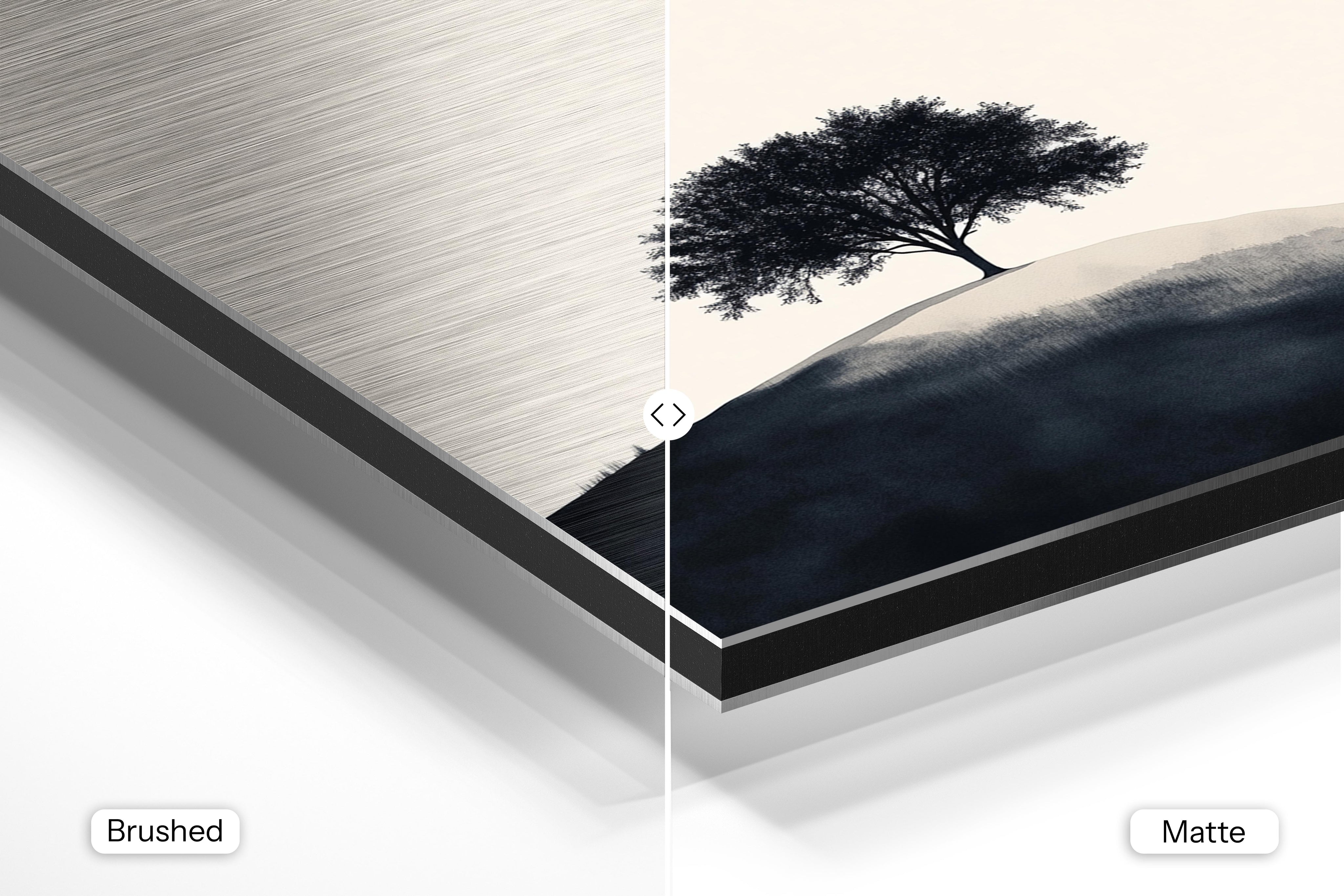 - Brushed Aluminum, on the other hand, features a raw metallic texture with visible brush strokes. Whites and highlights in your image let the silver surface show through, adding a dramatic, shimmering effect. Ideal for black-and-white images, minimalist designs, or abstract art, it creates a bold, industrial vibe with a modern edge.