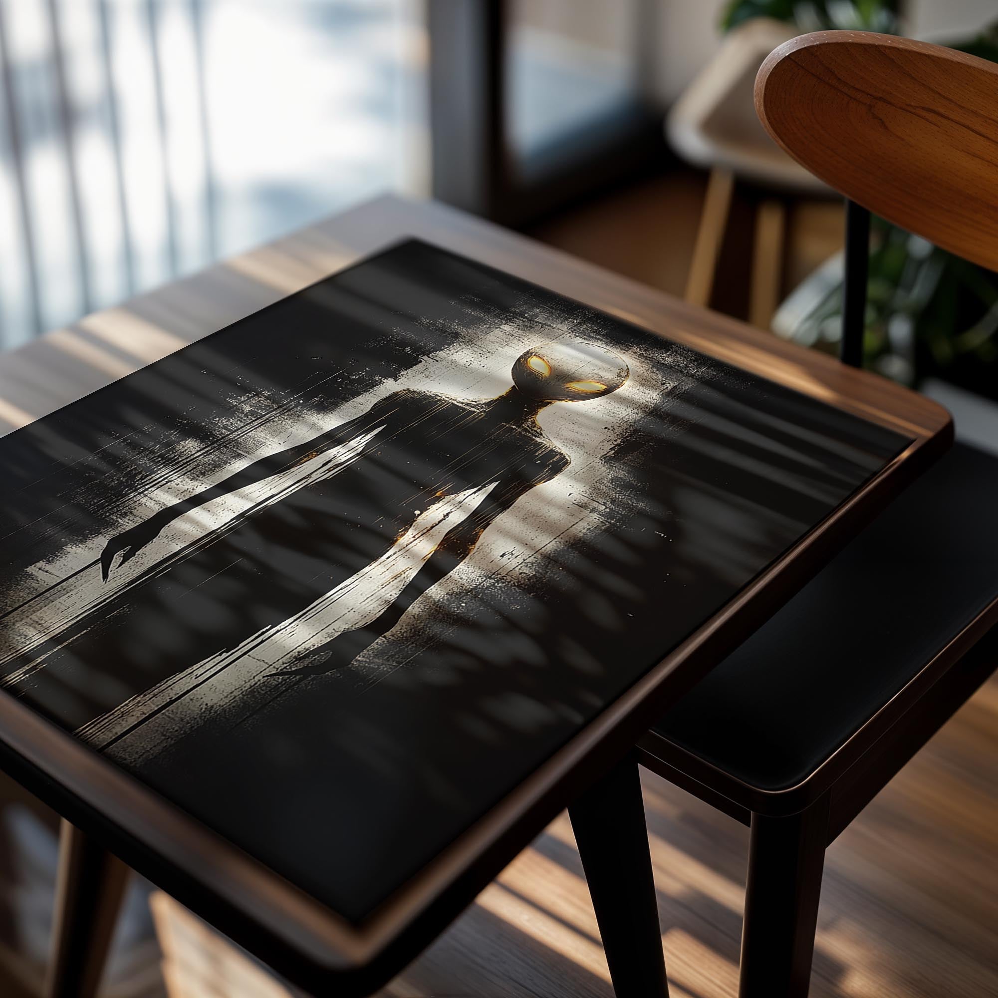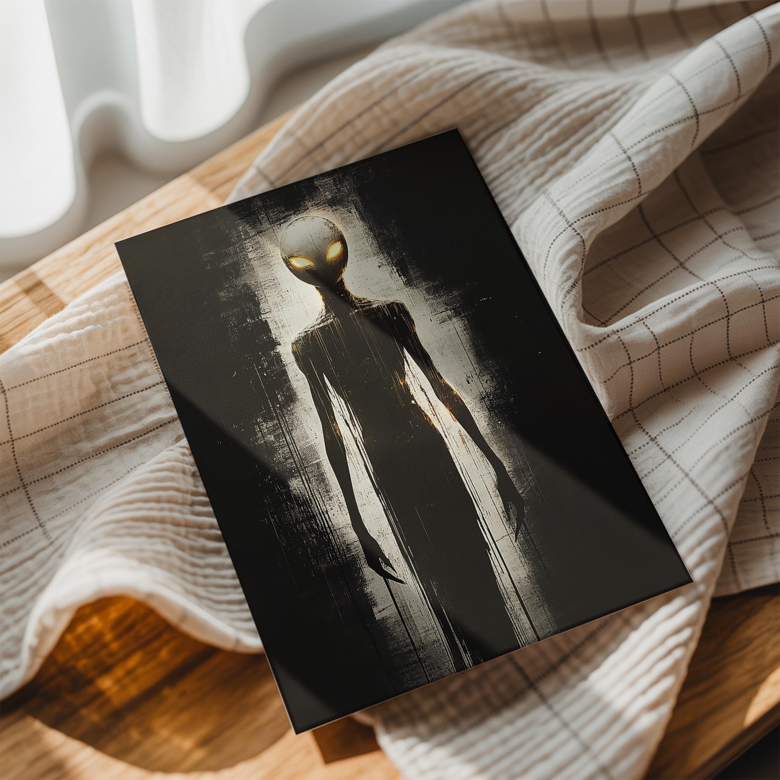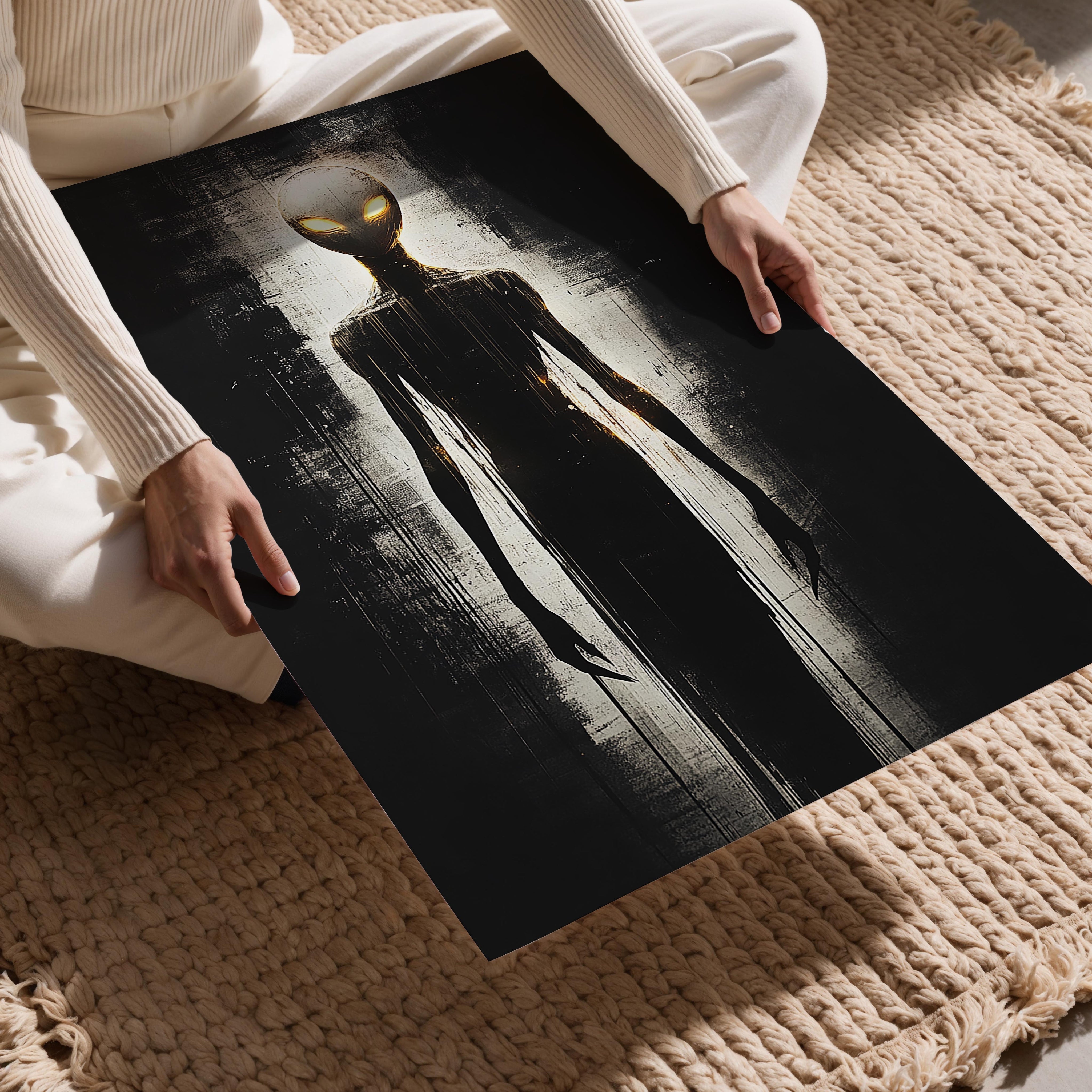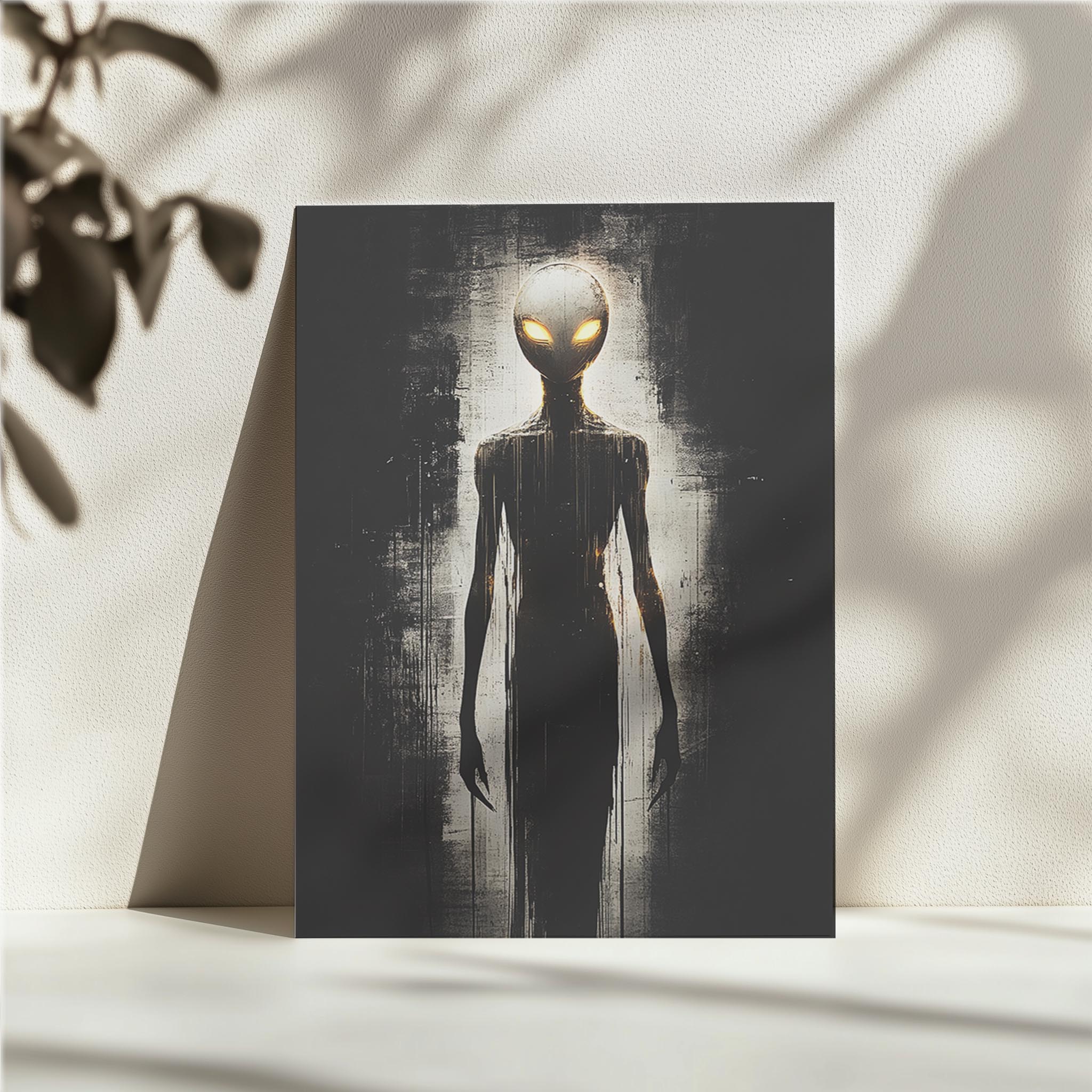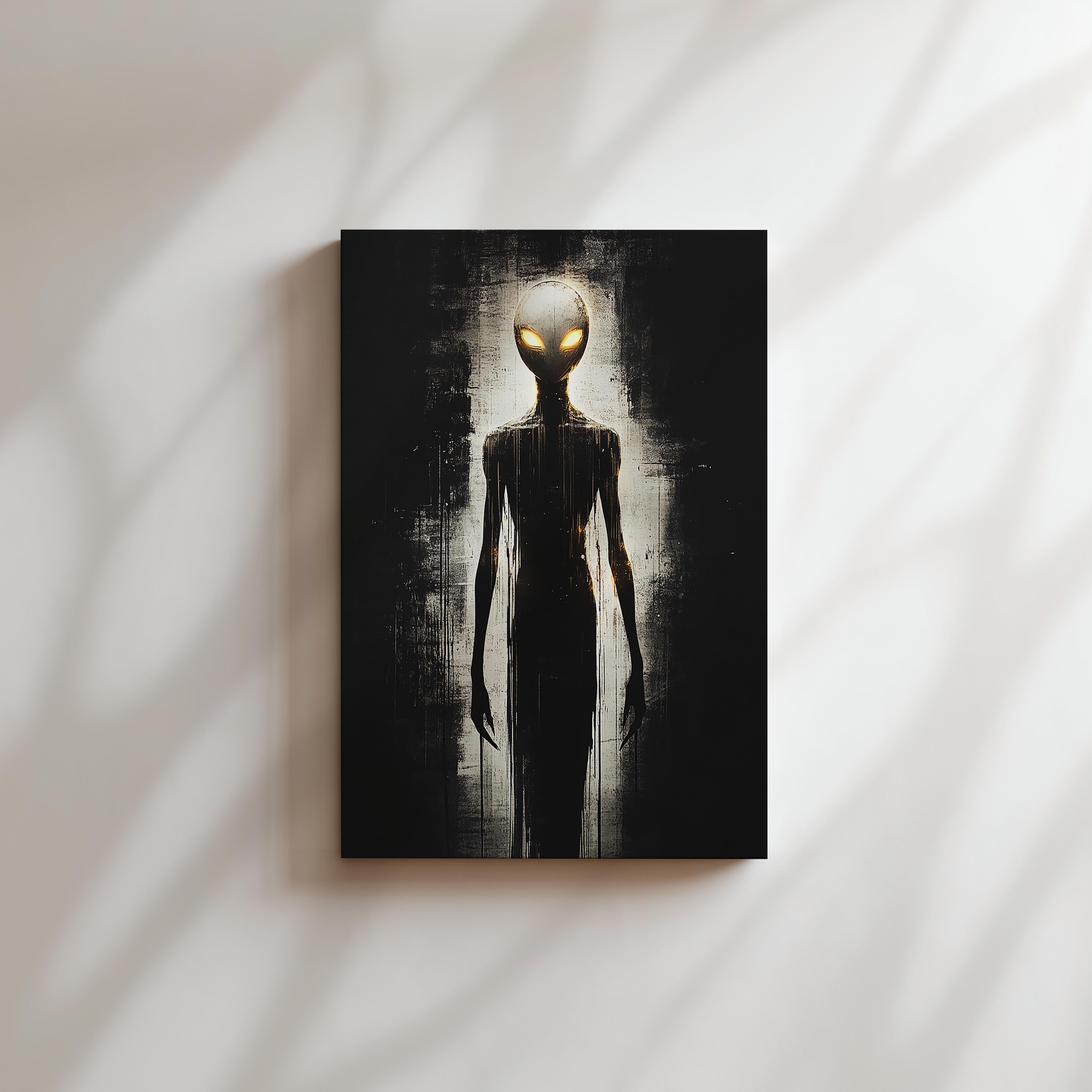 A luminous alien figure with glowing yellow eyes is the focal point of this dramatic piece. The intense lighting against a dark backdrop creates a haunting yet mesmerizing effect. Ideal for sci-fi-themed spaces or modern interiors looking for a bold statement piece.