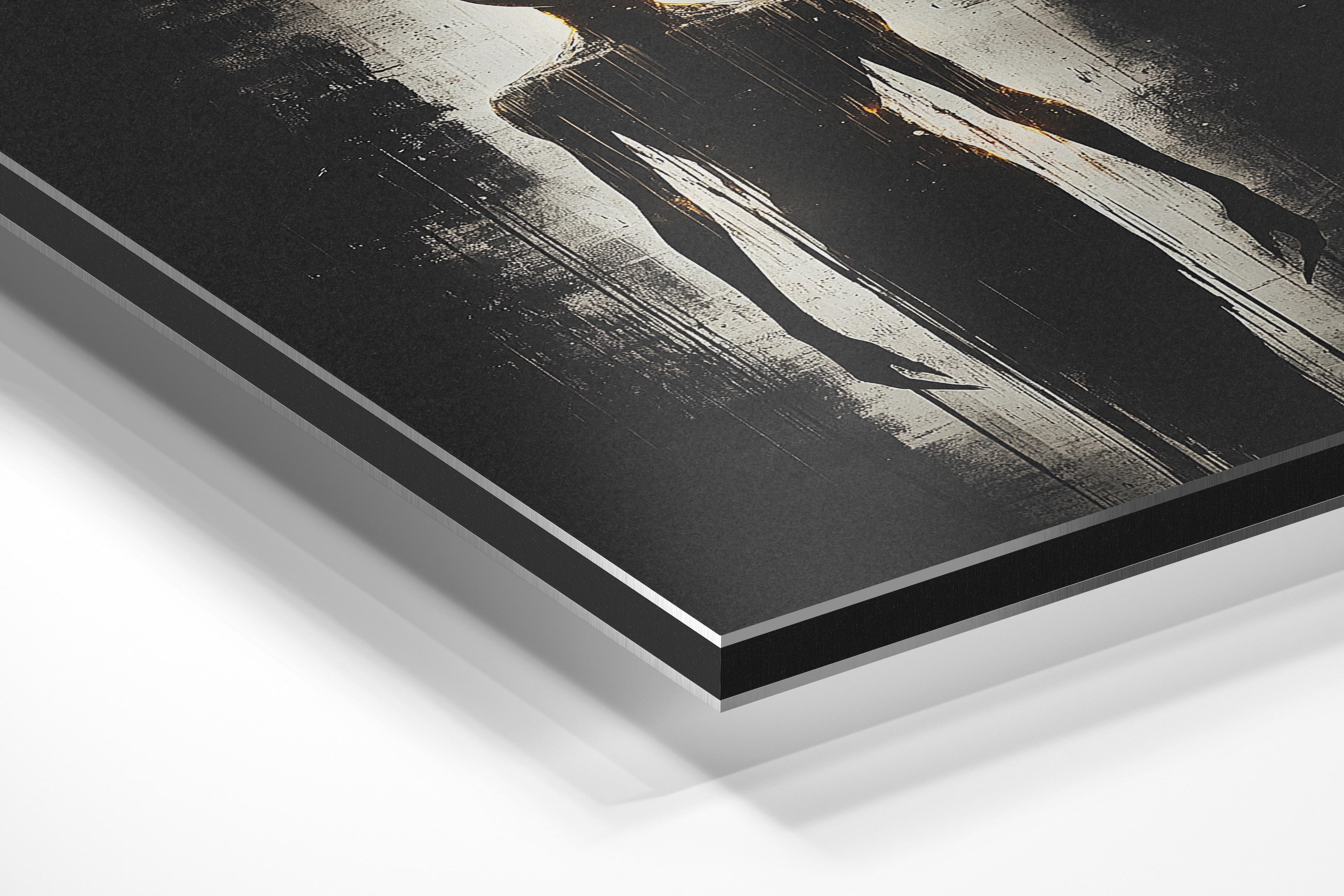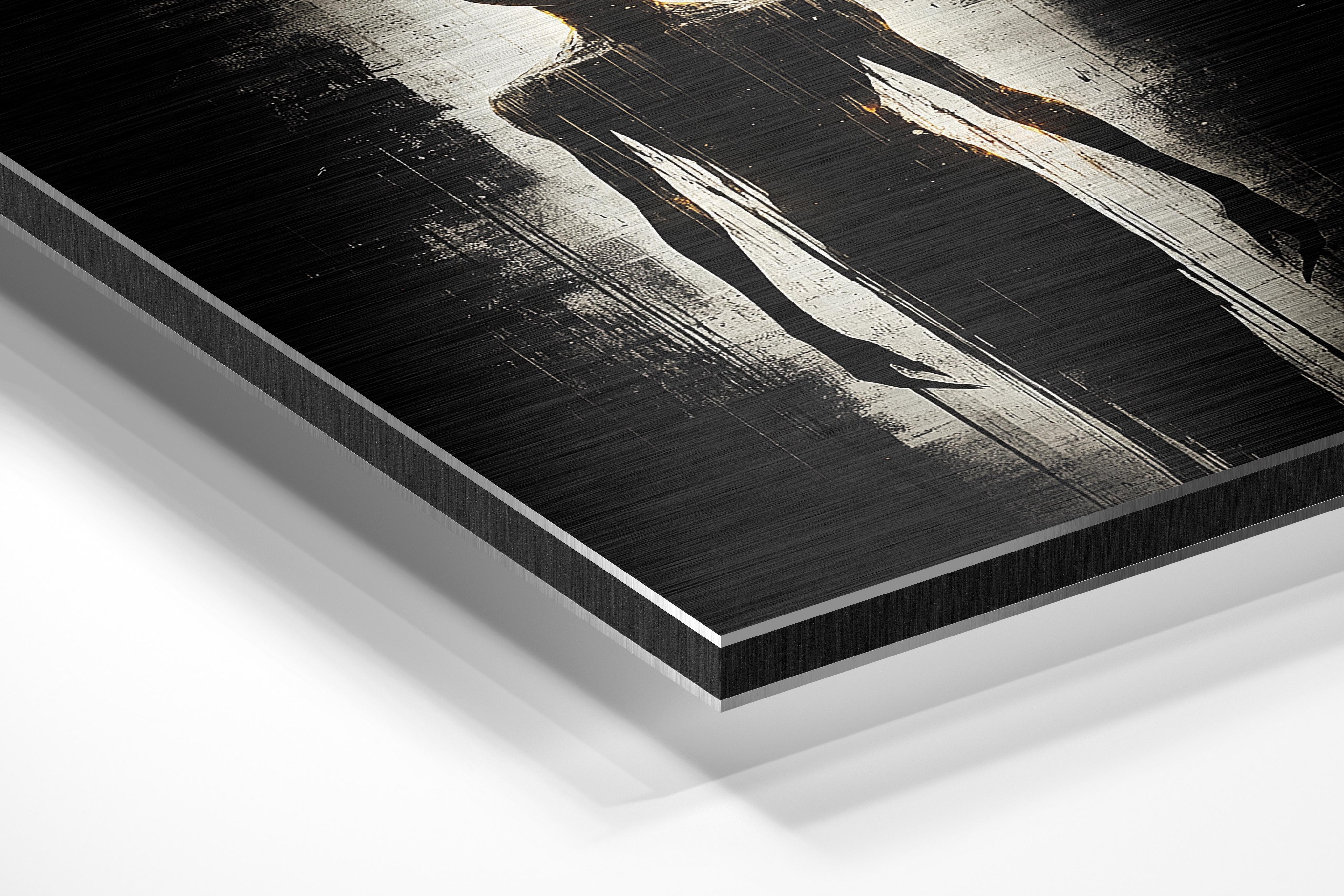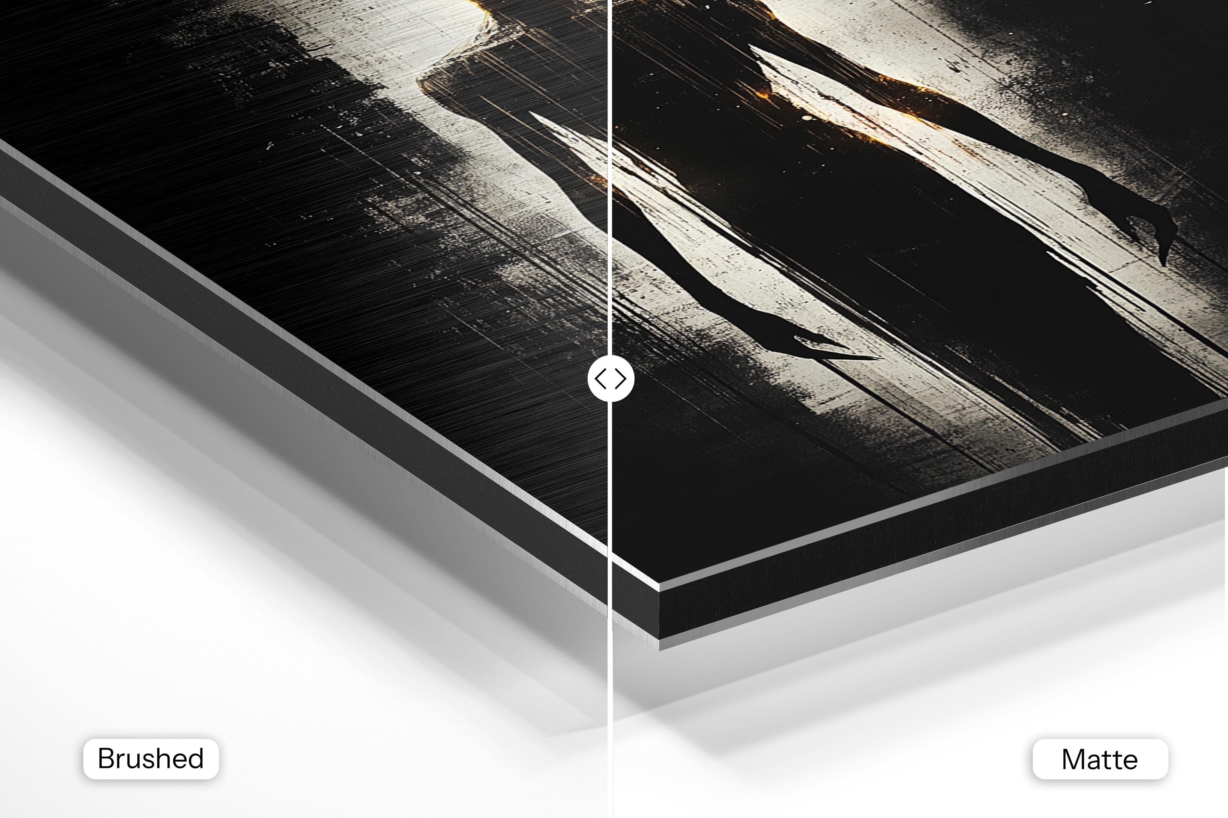 - Brushed Aluminum, on the other hand, features a raw metallic texture with visible brush strokes. Whites and highlights in your image let the silver surface show through, adding a dramatic, shimmering effect. Ideal for black-and-white images, minimalist designs, or abstract art, it creates a bold, industrial vibe with a modern edge.