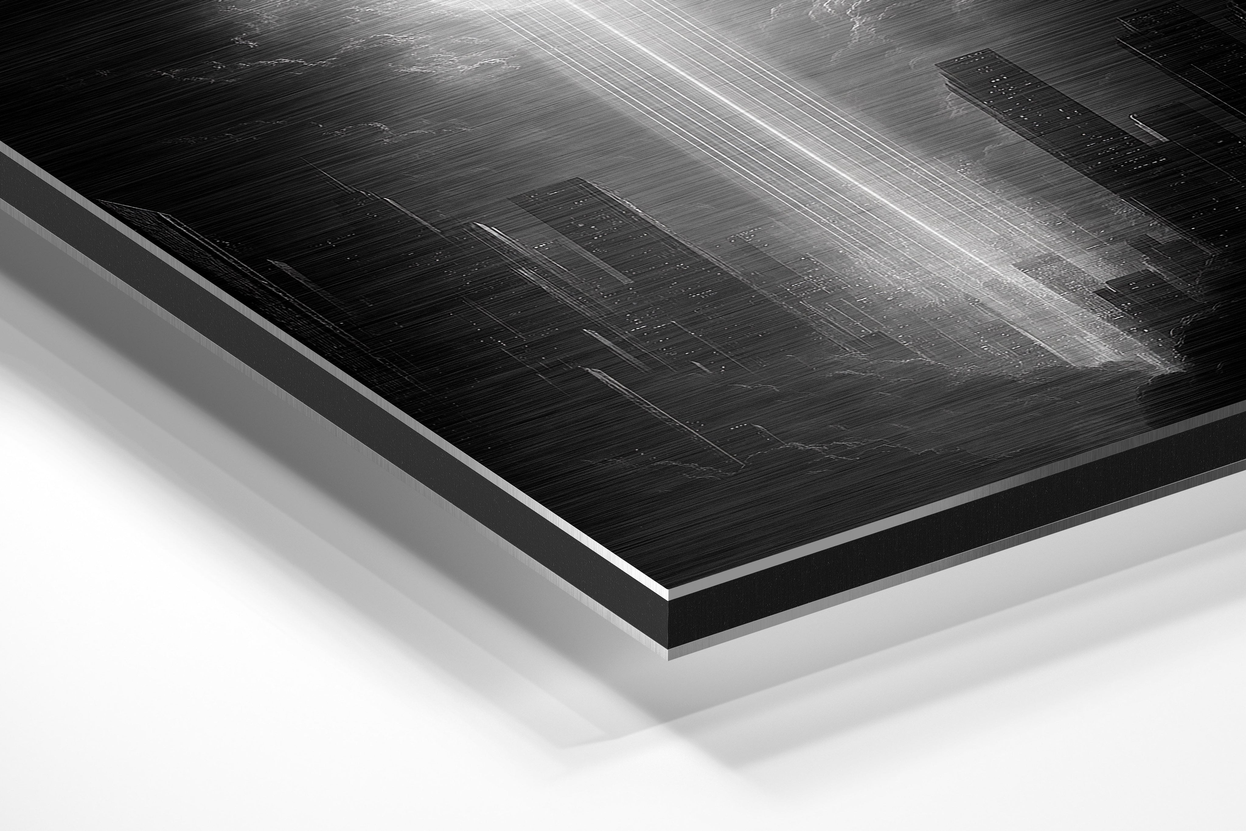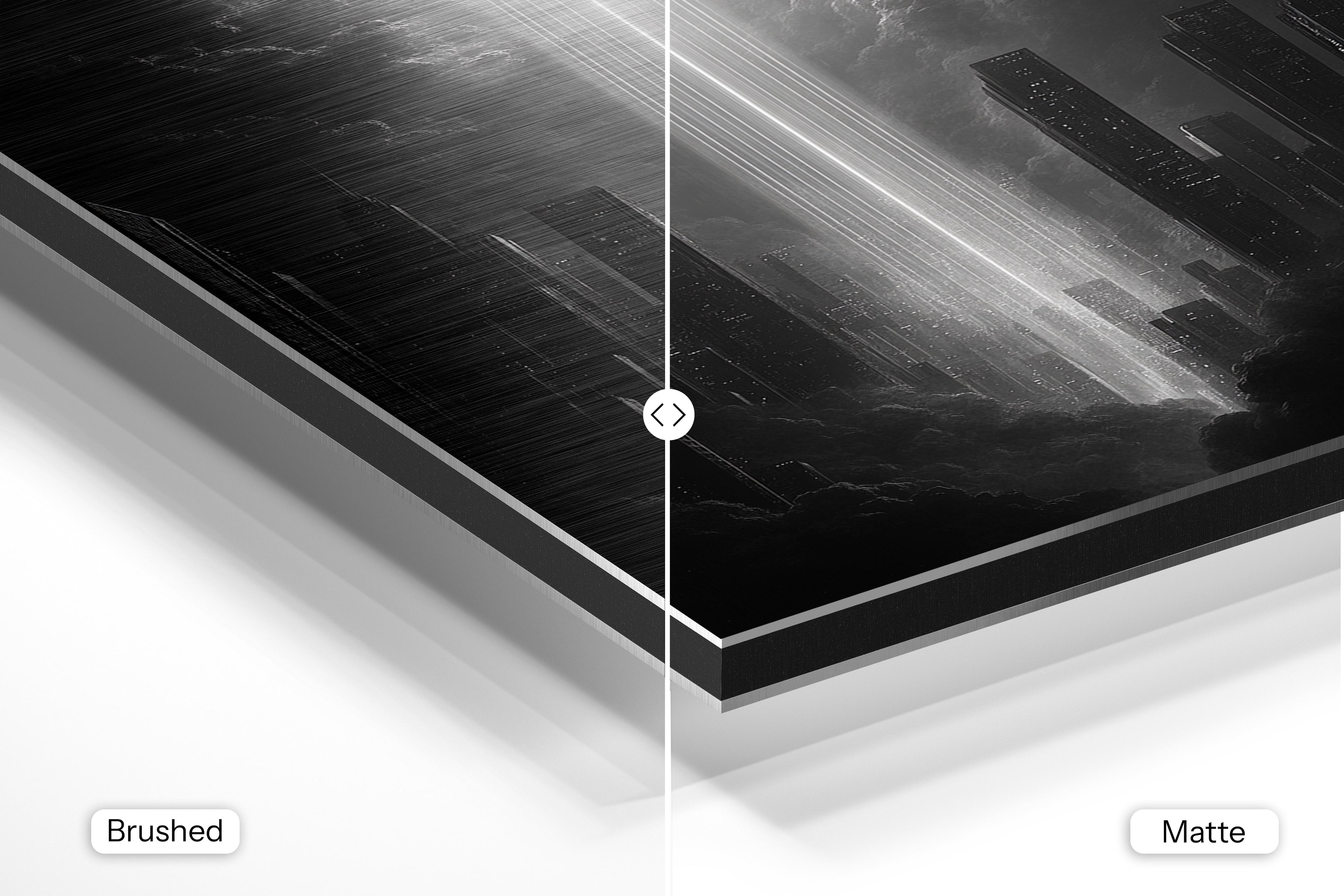 - Brushed Aluminum, on the other hand, features a raw metallic texture with visible brush strokes. Whites and highlights in your image let the silver surface show through, adding a dramatic, shimmering effect. Ideal for black-and-white images, minimalist designs, or abstract art, it creates a bold, industrial vibe with a modern edge.