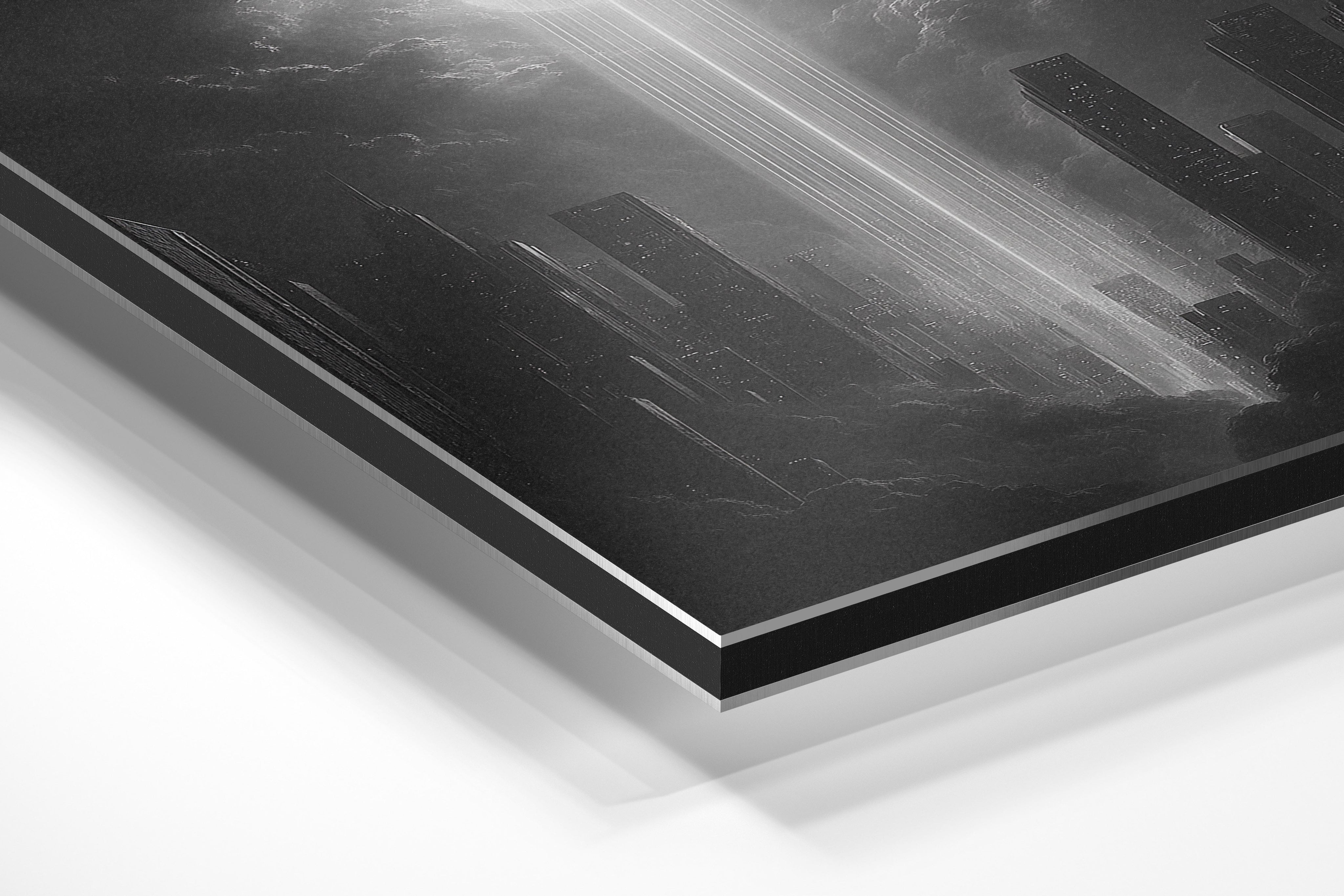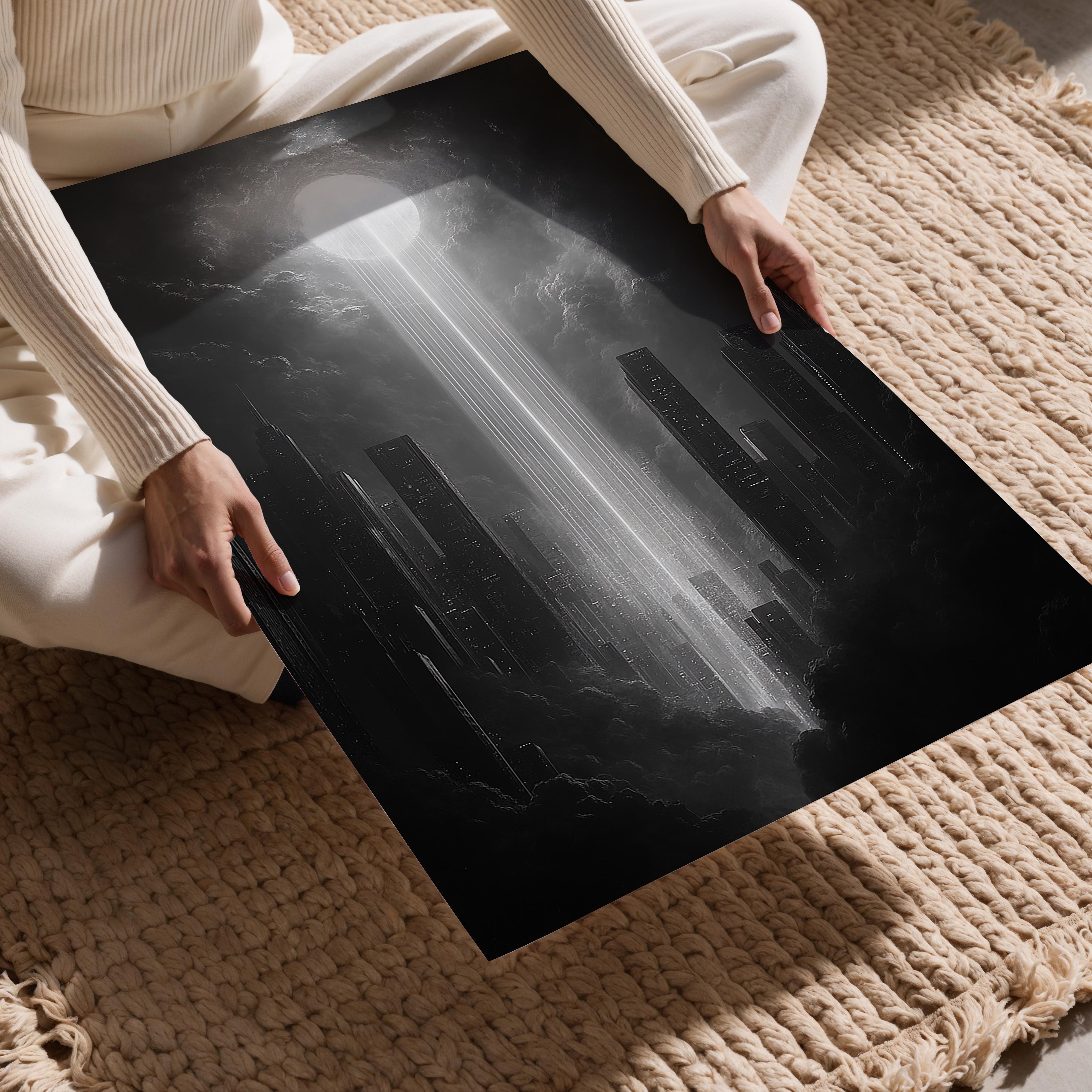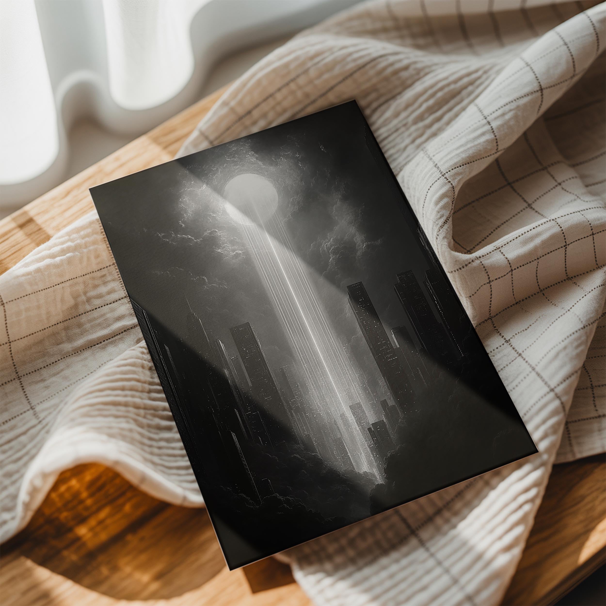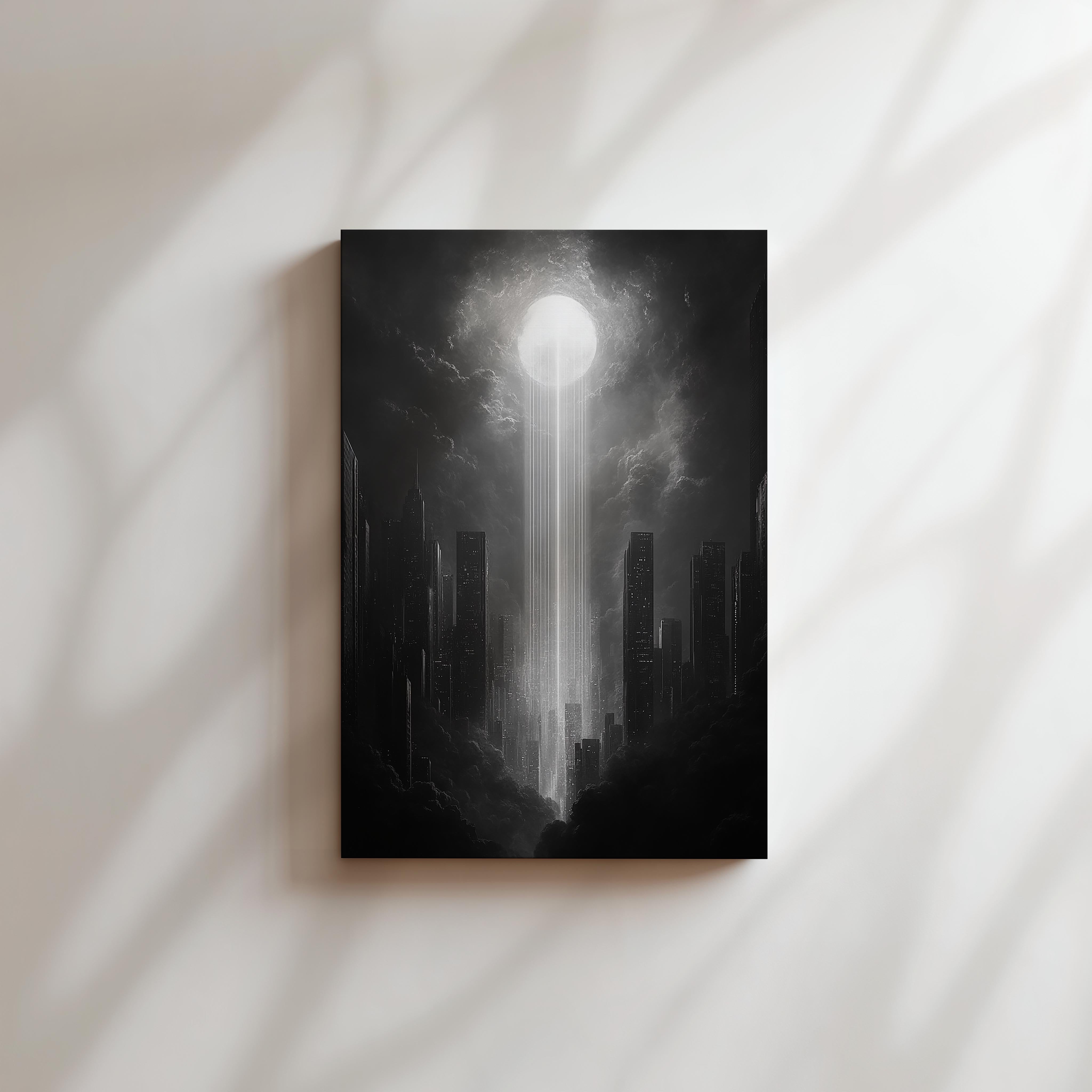 Depicting a glowing celestial beam that illuminates a dark, monochromatic cityscape, this image evokes feelings of wonder and ascension. The towering city buildings are dwarfed by the sheer intensity of the vertical light, creating a powerful juxtaposition between manmade structures and otherworldly forces. The grayscale palette enhances the drama, while the ethereal light provides a sense of hope and transcendence. This artwork is well-suited to industrial or monochrome interior themes, adding a focal point of mystery and sophistication. It would also appeal to those who appreciate futuristic or urban-inspired designs, serving as a stunning addition to modern wall decor.