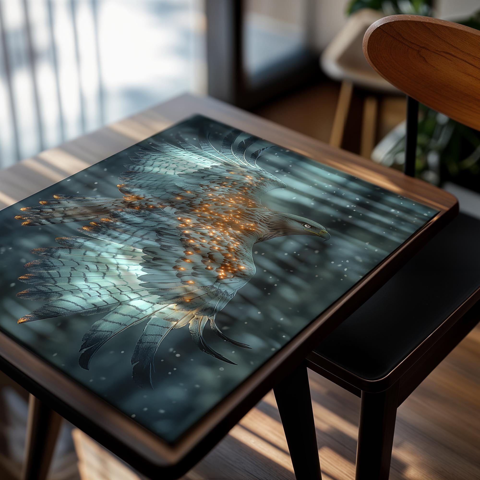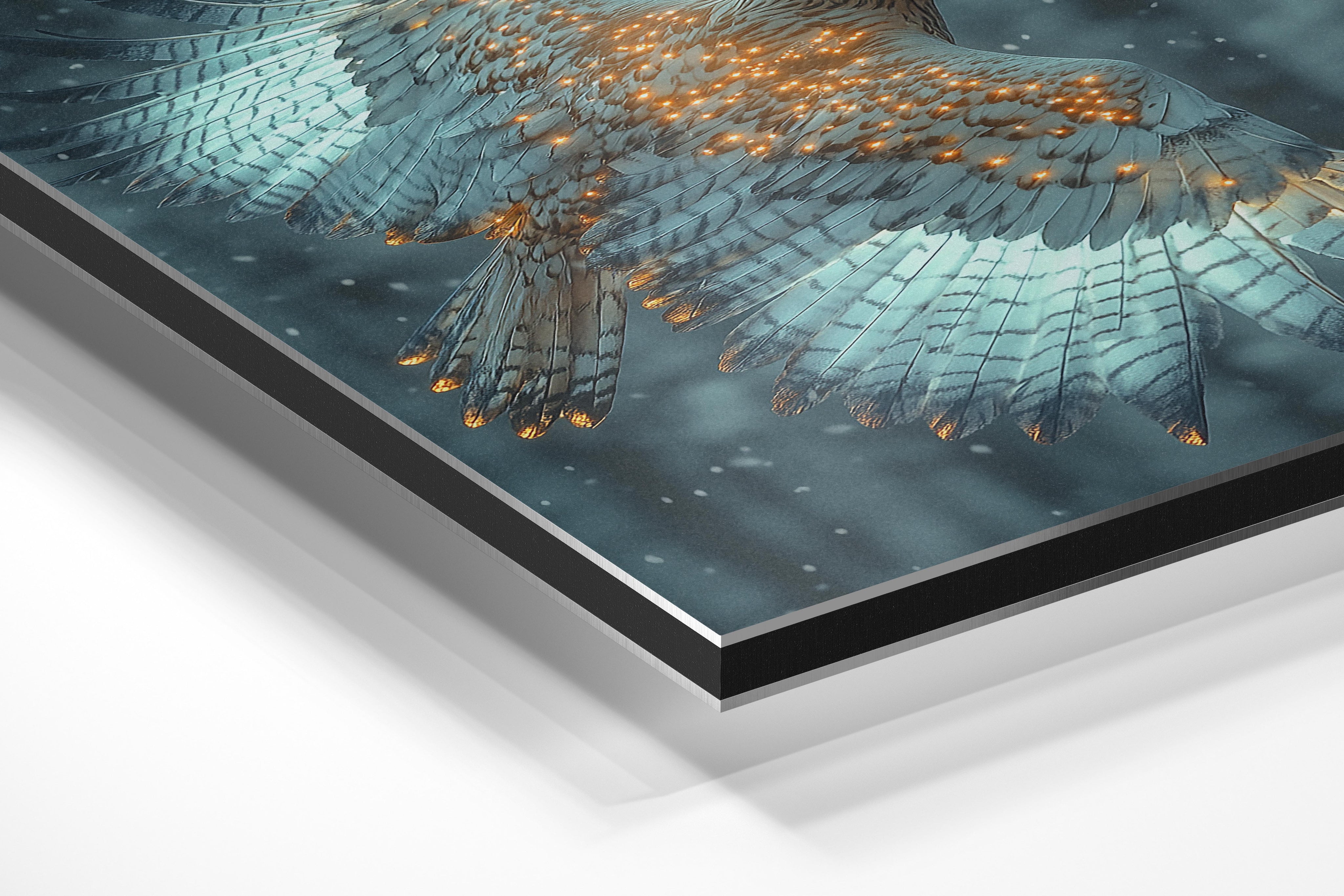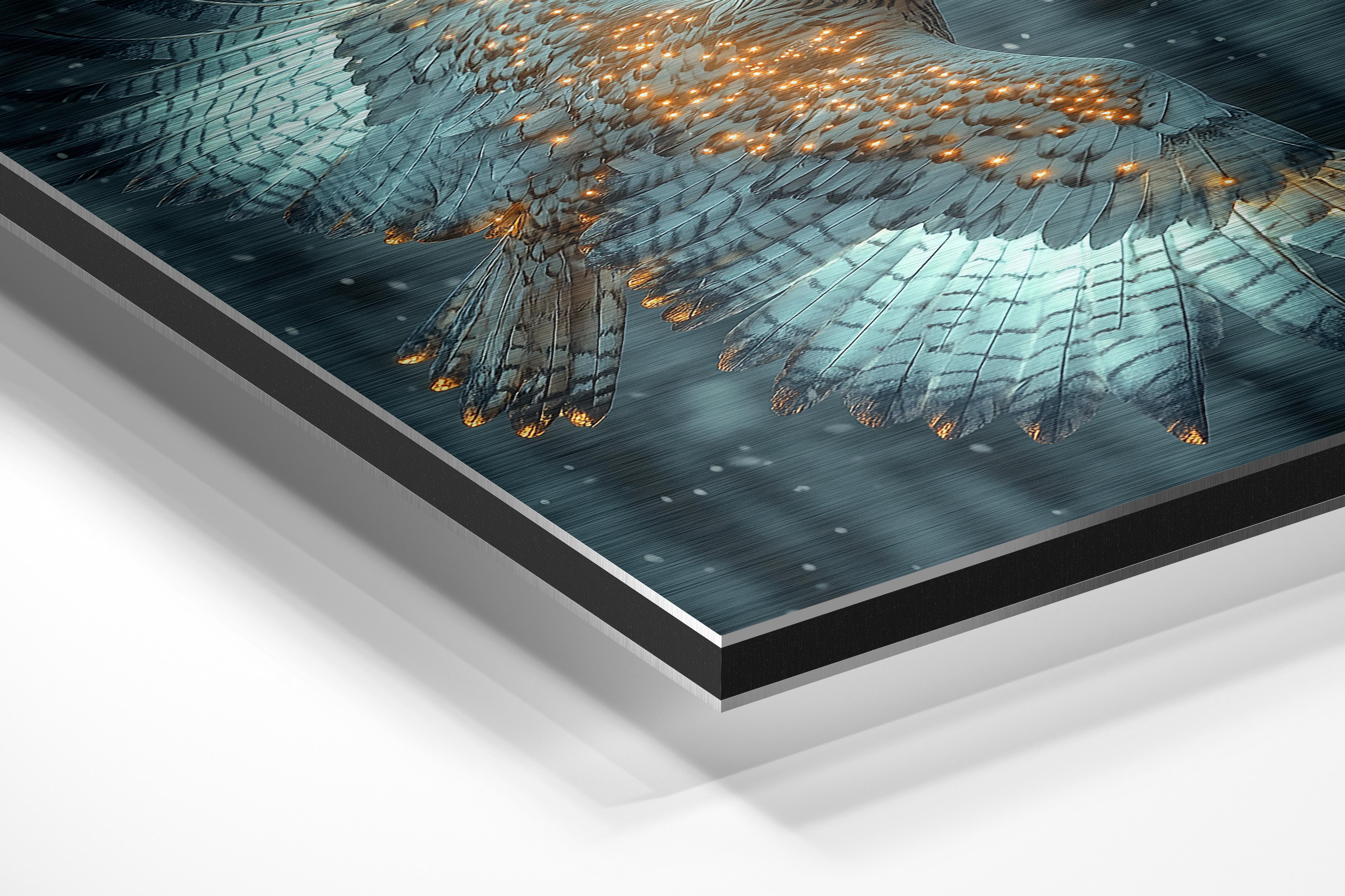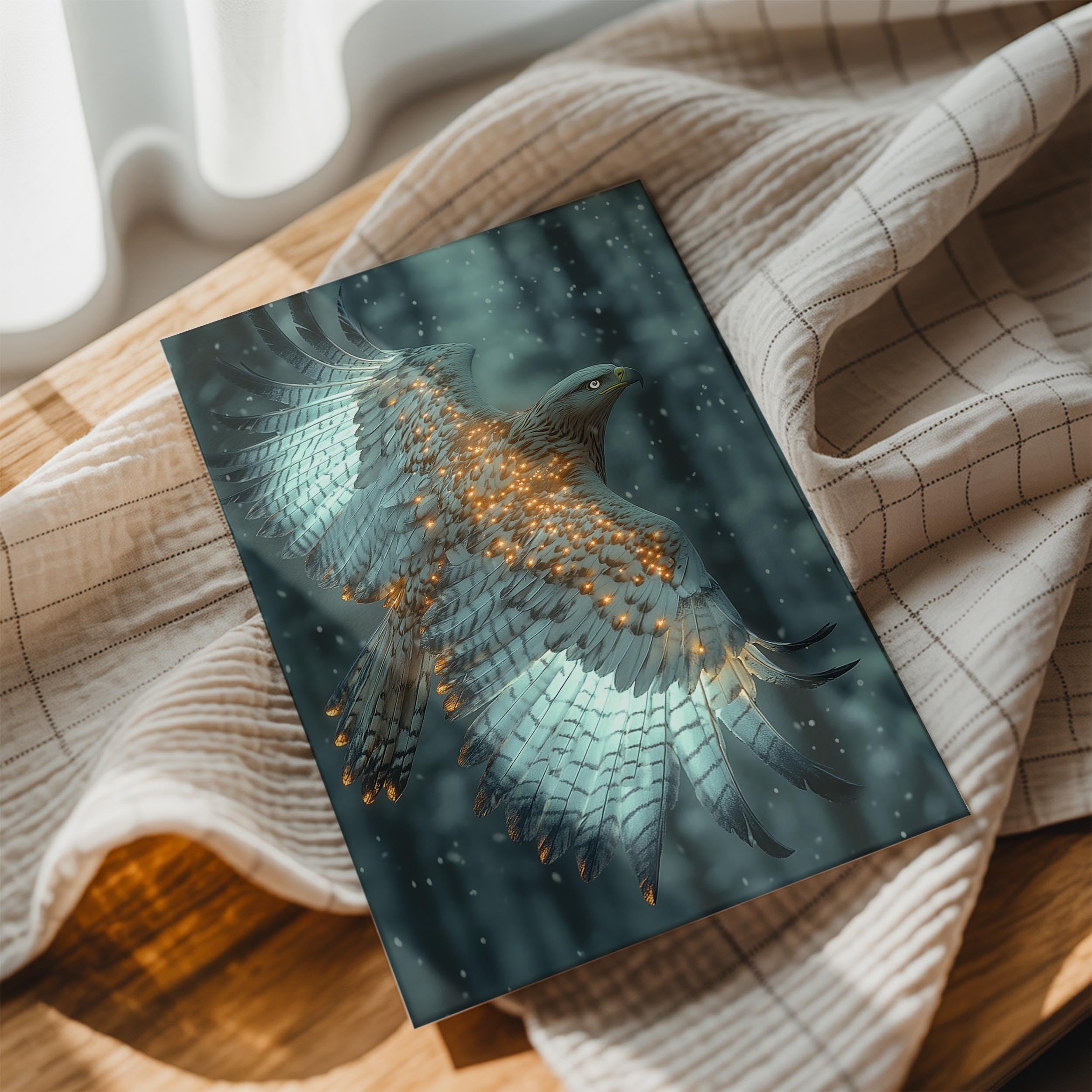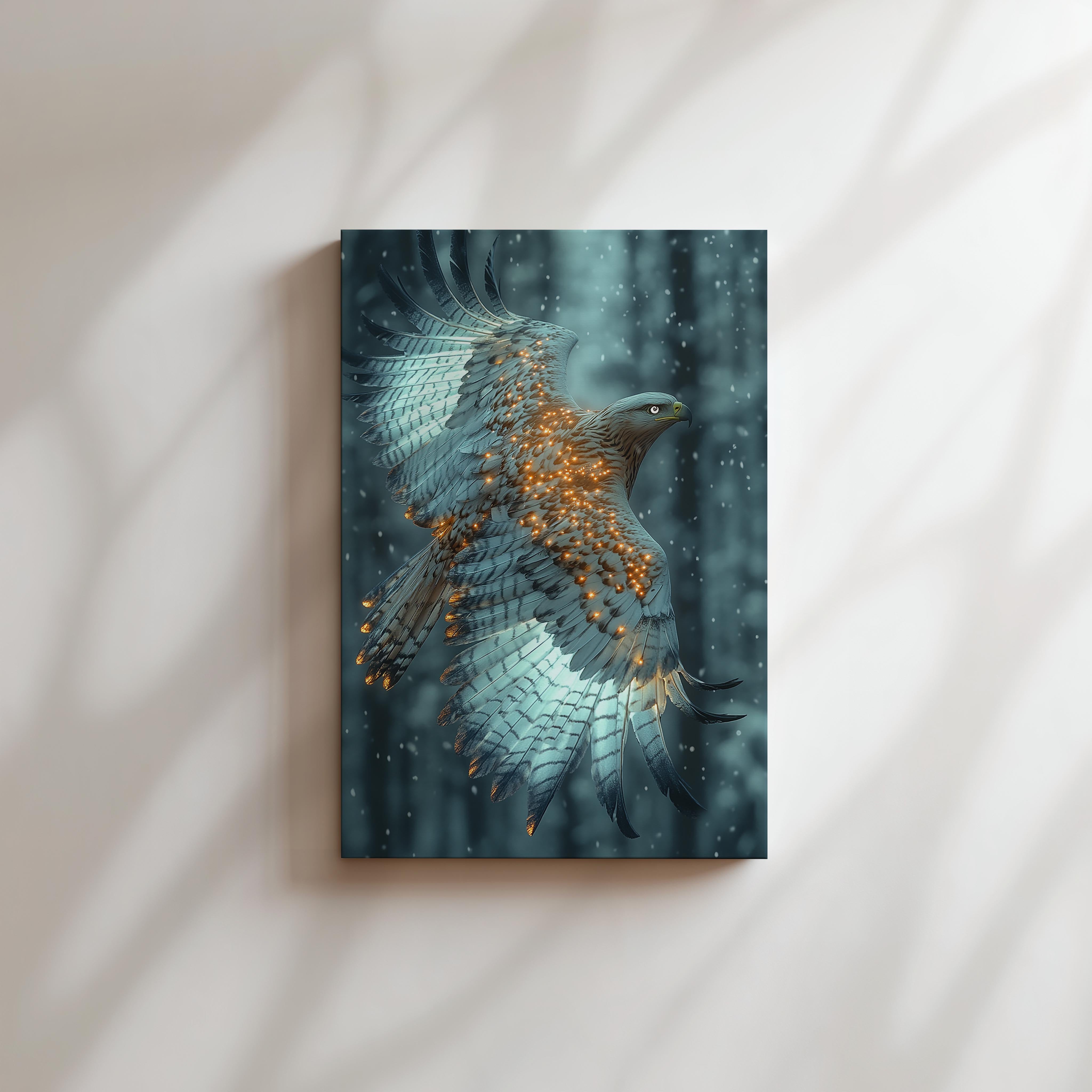 A striking depiction of an eagle with glowing feathers soaring through a snowy forest. The luminous highlights create a sense of power and mystique, evoking the majesty of nature paired with a touch of fantasy. This artwork is ideal for anyone who admires both natural beauty and creative interpretations of wildlife.