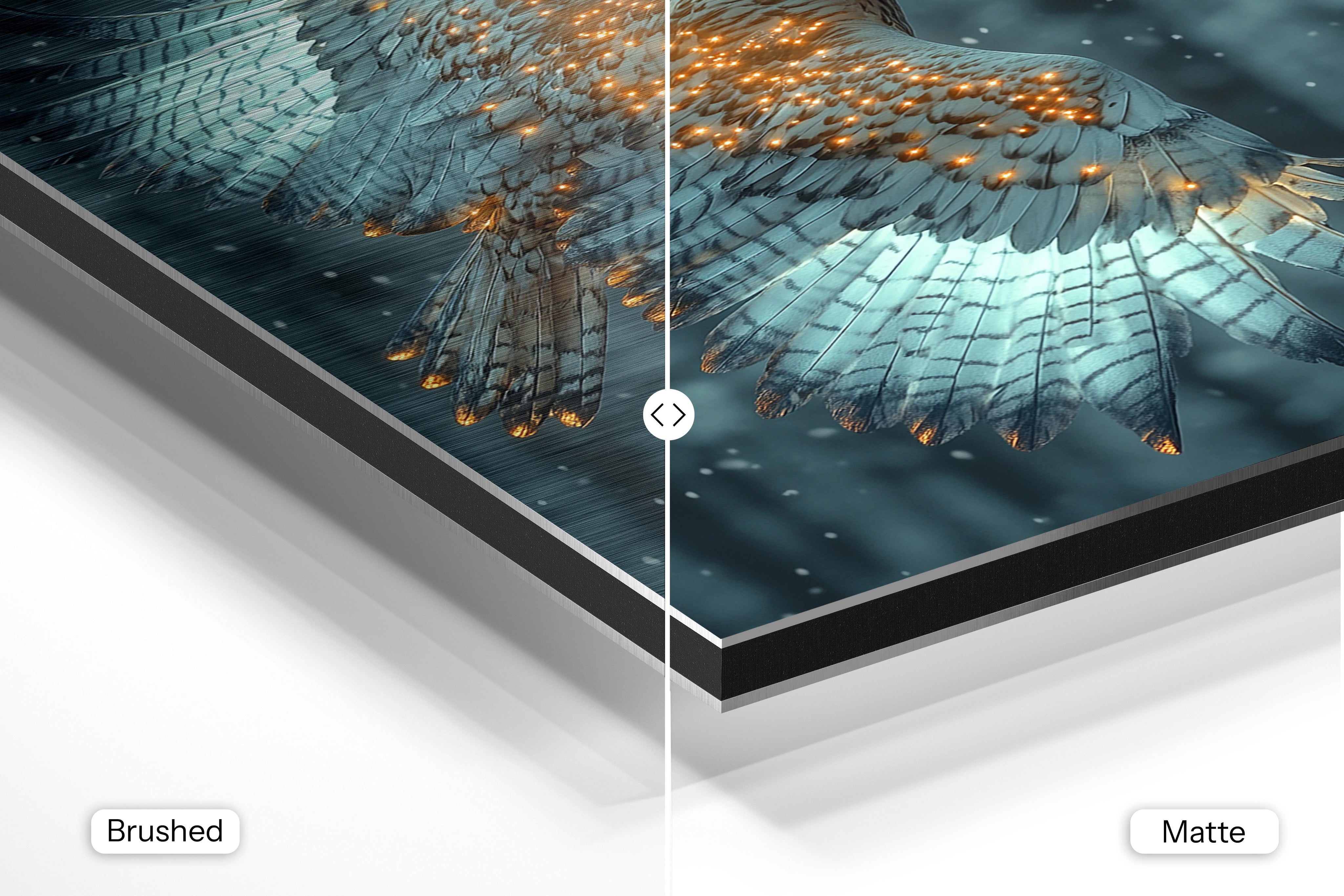 - Brushed Aluminum, on the other hand, features a raw metallic texture with visible brush strokes. Whites and highlights in your image let the silver surface show through, adding a dramatic, shimmering effect. Ideal for black-and-white images, minimalist designs, or abstract art, it creates a bold, industrial vibe with a modern edge.