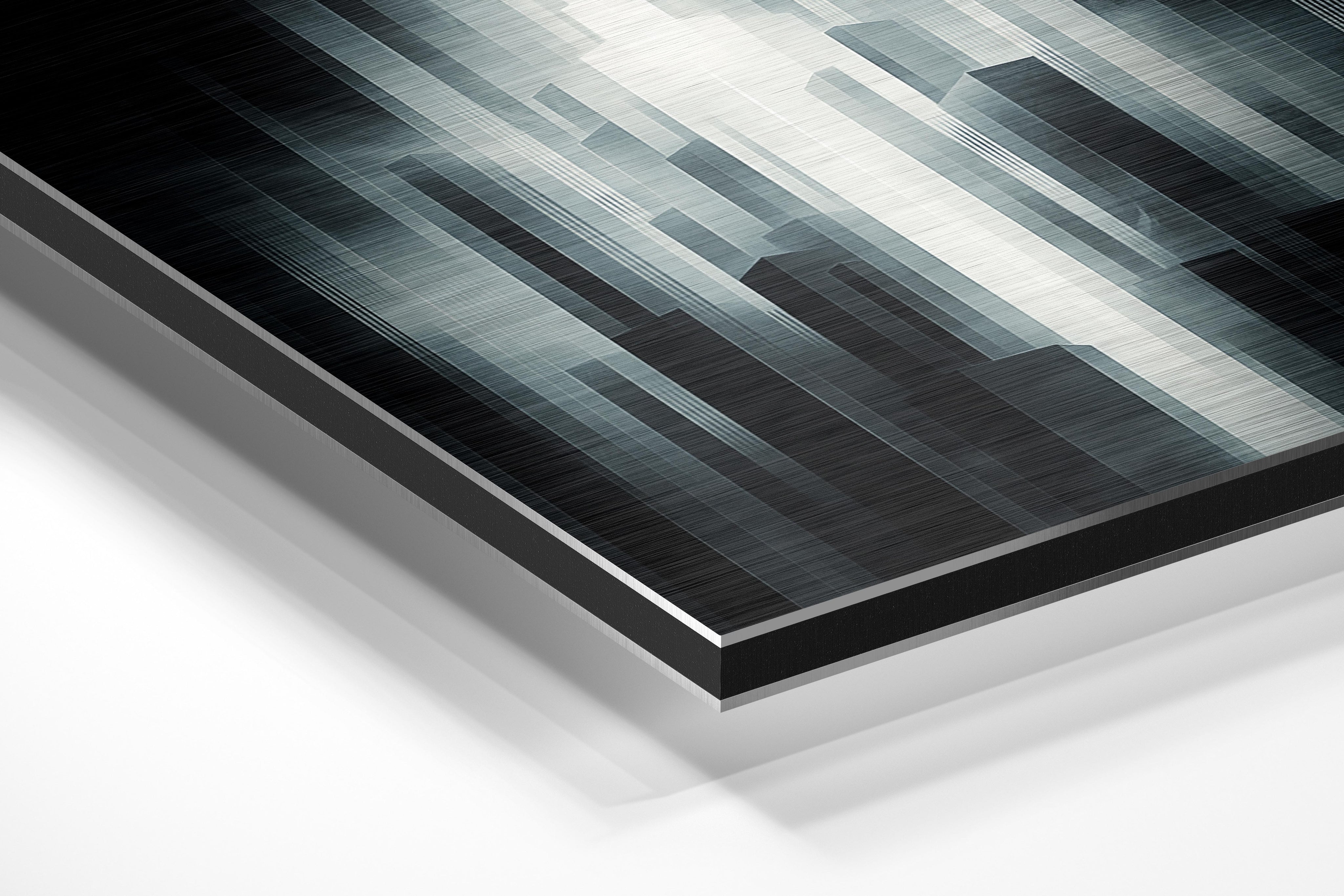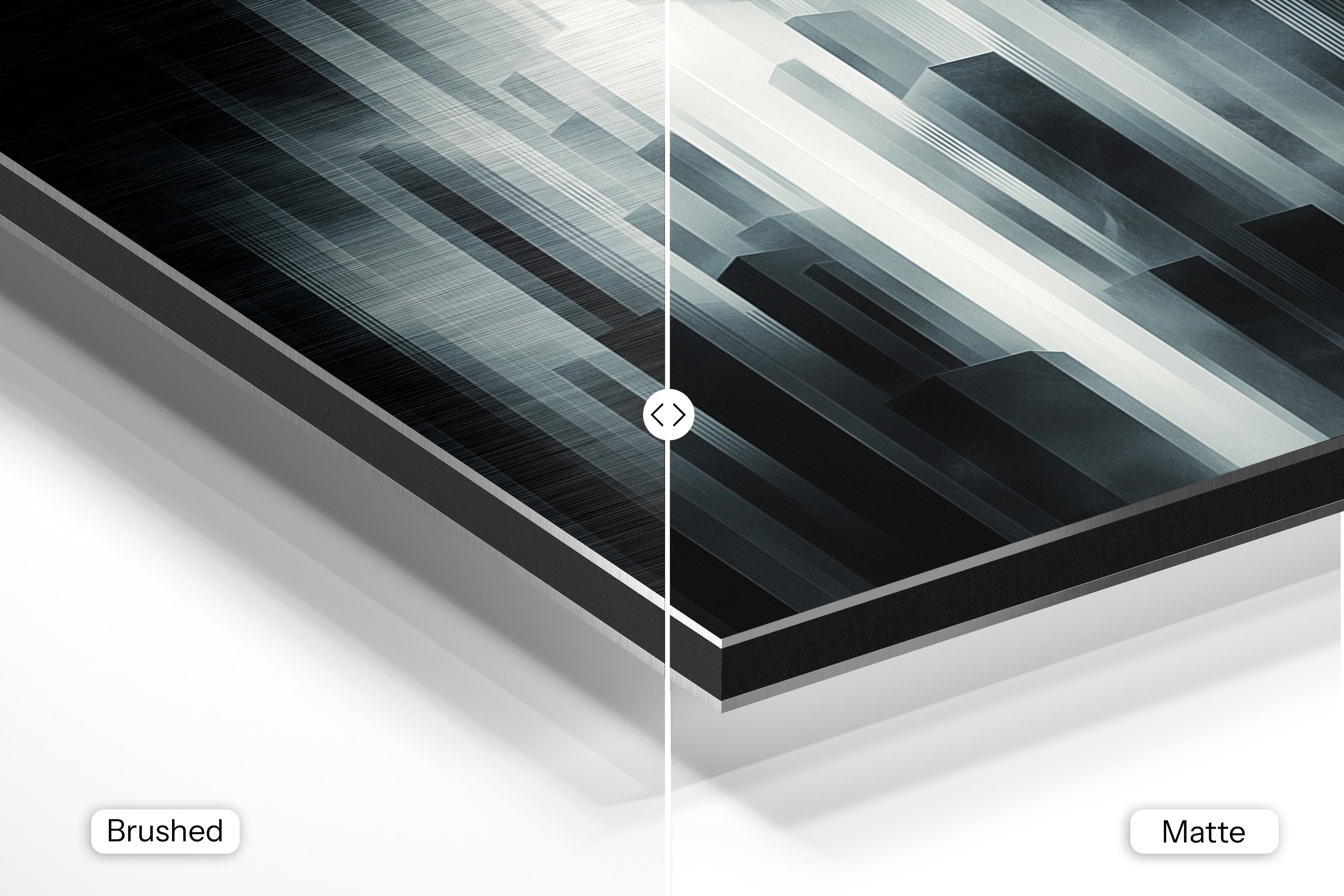 - Brushed Aluminum, on the other hand, features a raw metallic texture with visible brush strokes. Whites and highlights in your image let the silver surface show through, adding a dramatic, shimmering effect. Ideal for black-and-white images, minimalist designs, or abstract art, it creates a bold, industrial vibe with a modern edge.