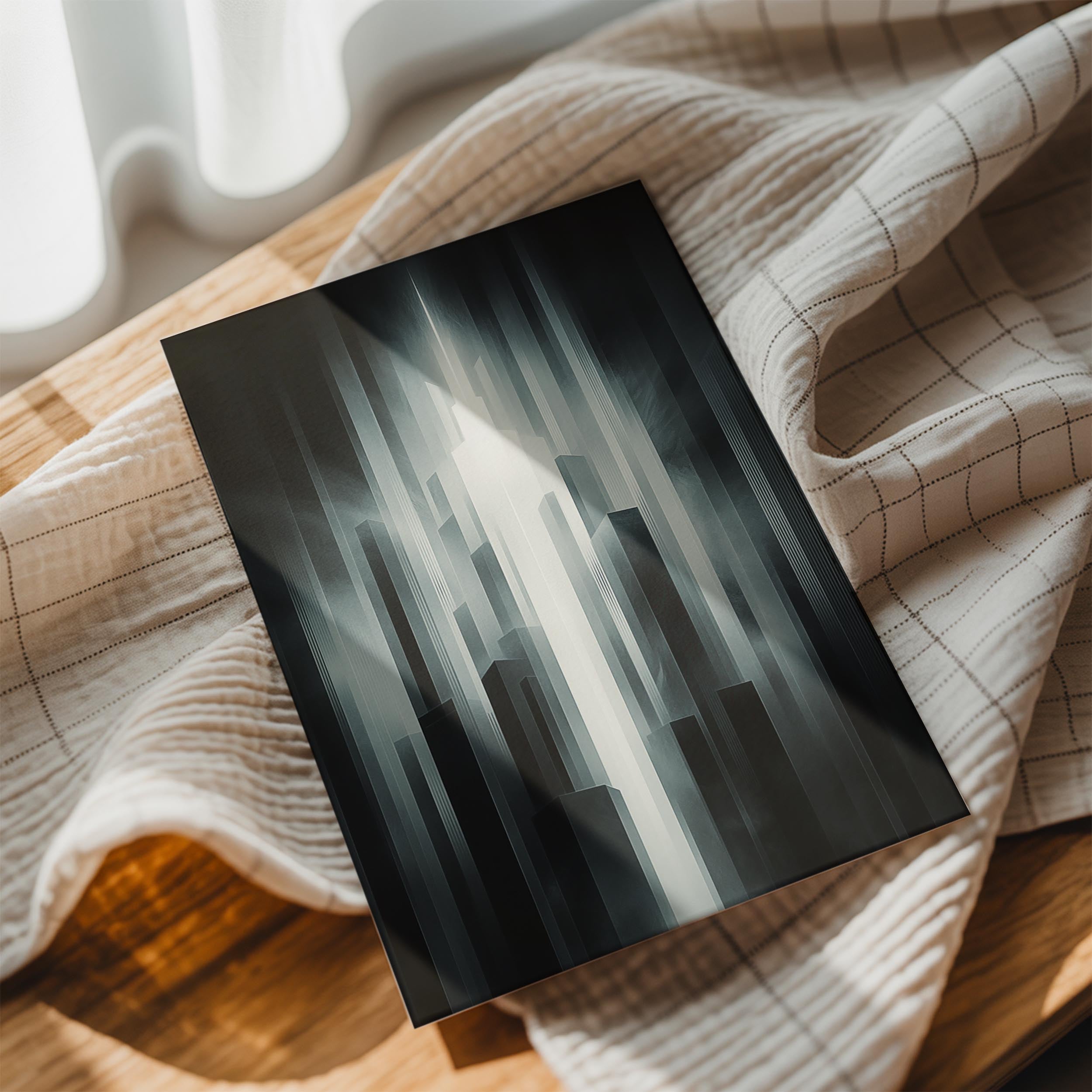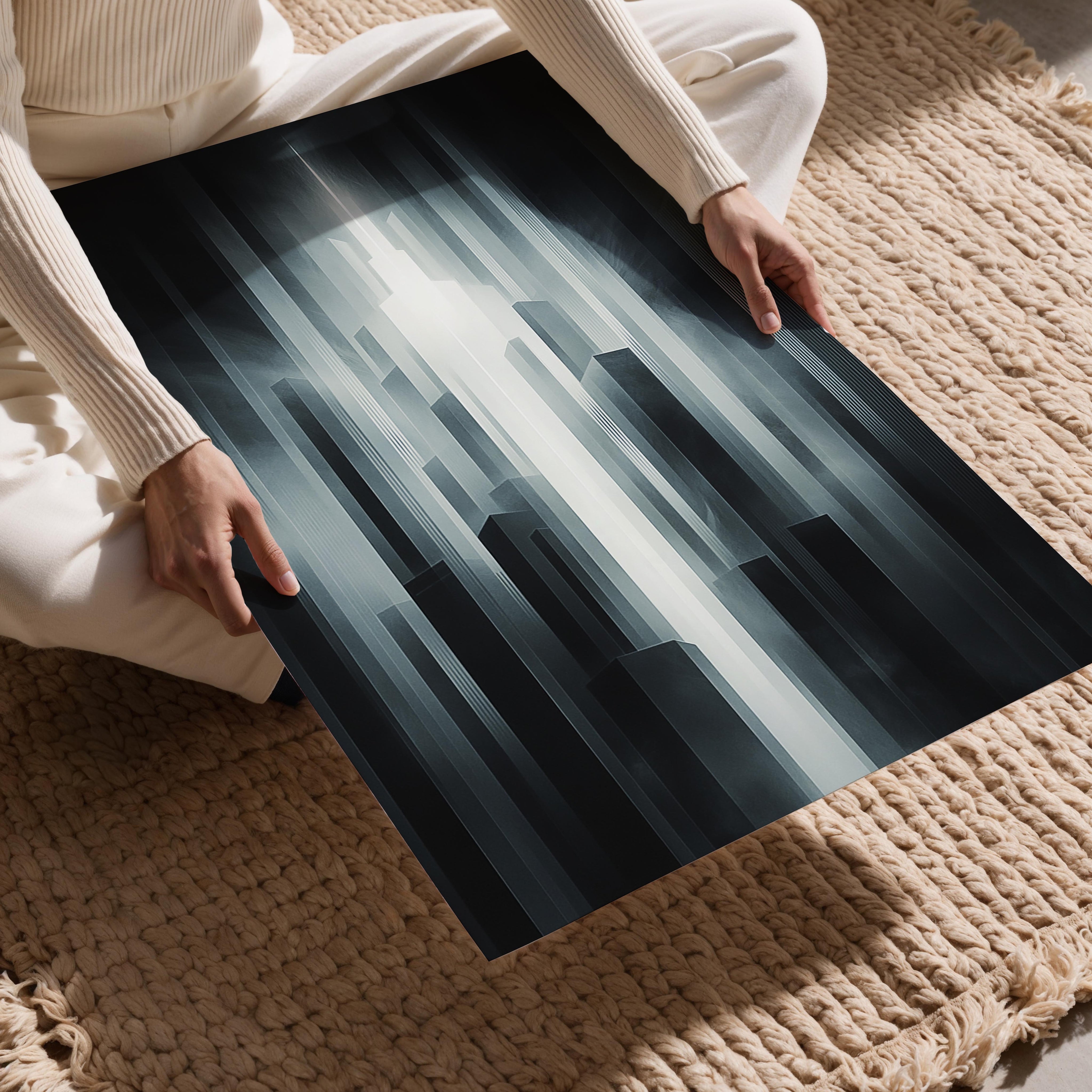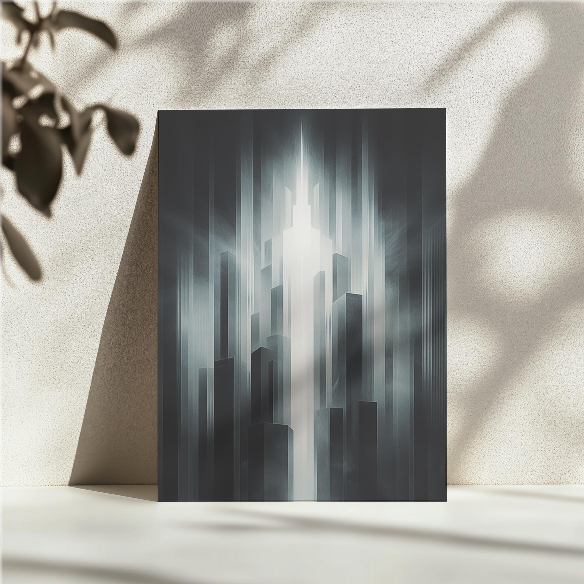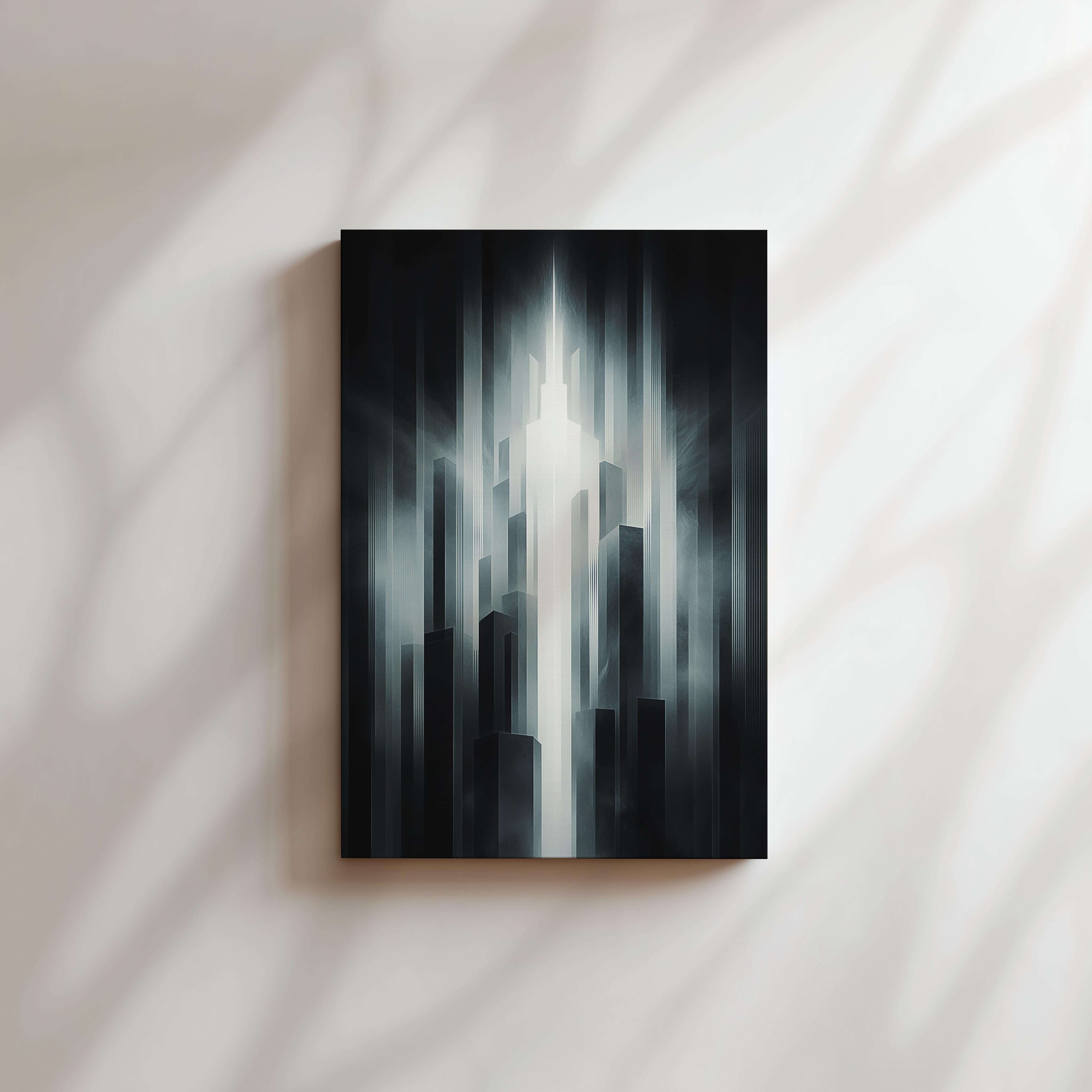 This luminous artwork depicts an imposing tower radiating light, surrounded by dark, foggy skyscrapers. The vertical composition draws the eye upward, emphasizing themes of ambition, hope, and innovation. Its sleek and minimalistic design fits well in contemporary interiors or professional workspaces. The monochrome and glowing contrasts make it a compelling addition to any collection, particularly for those who appreciate architectural aesthetics and symbolic themes of growth and light in dark settings.