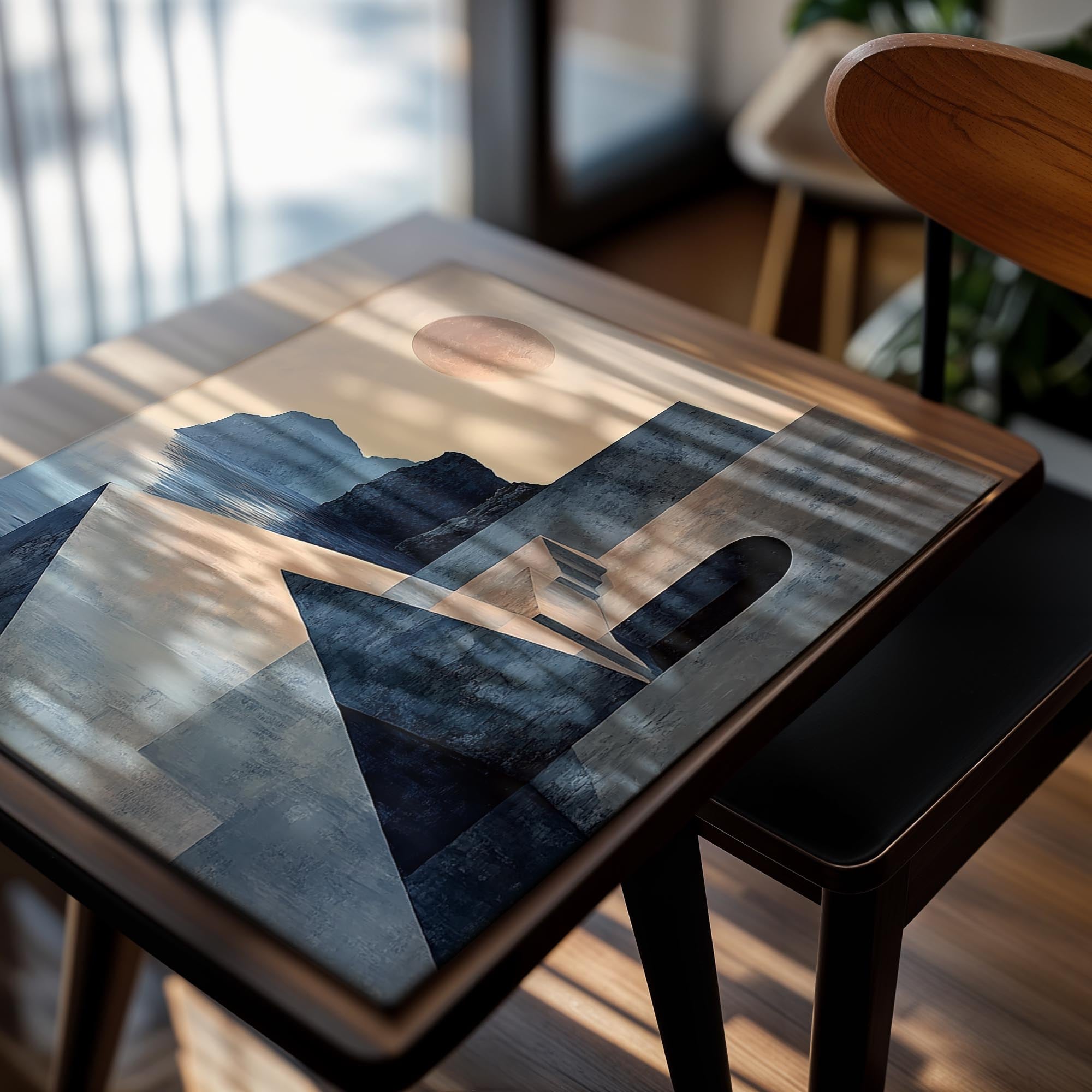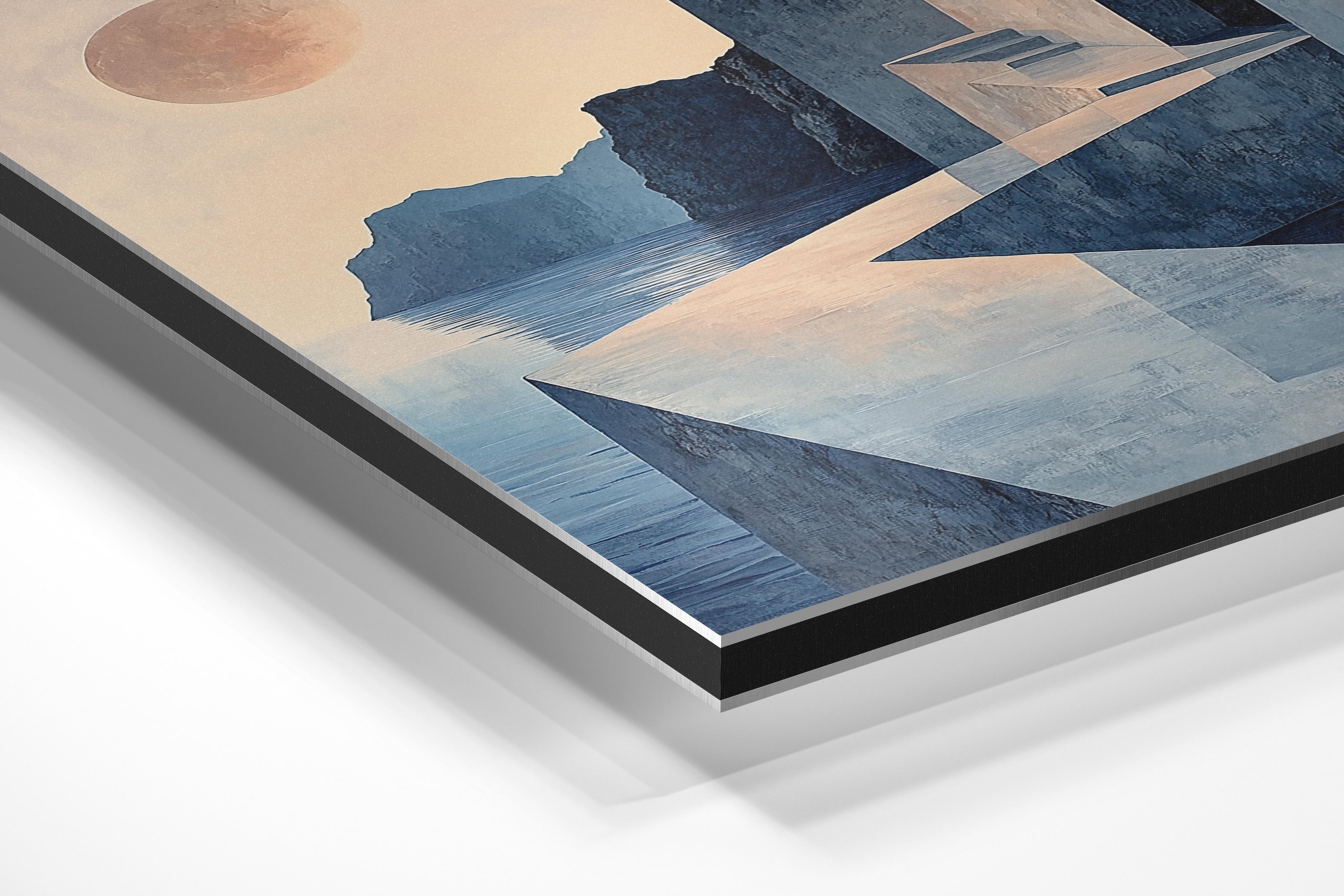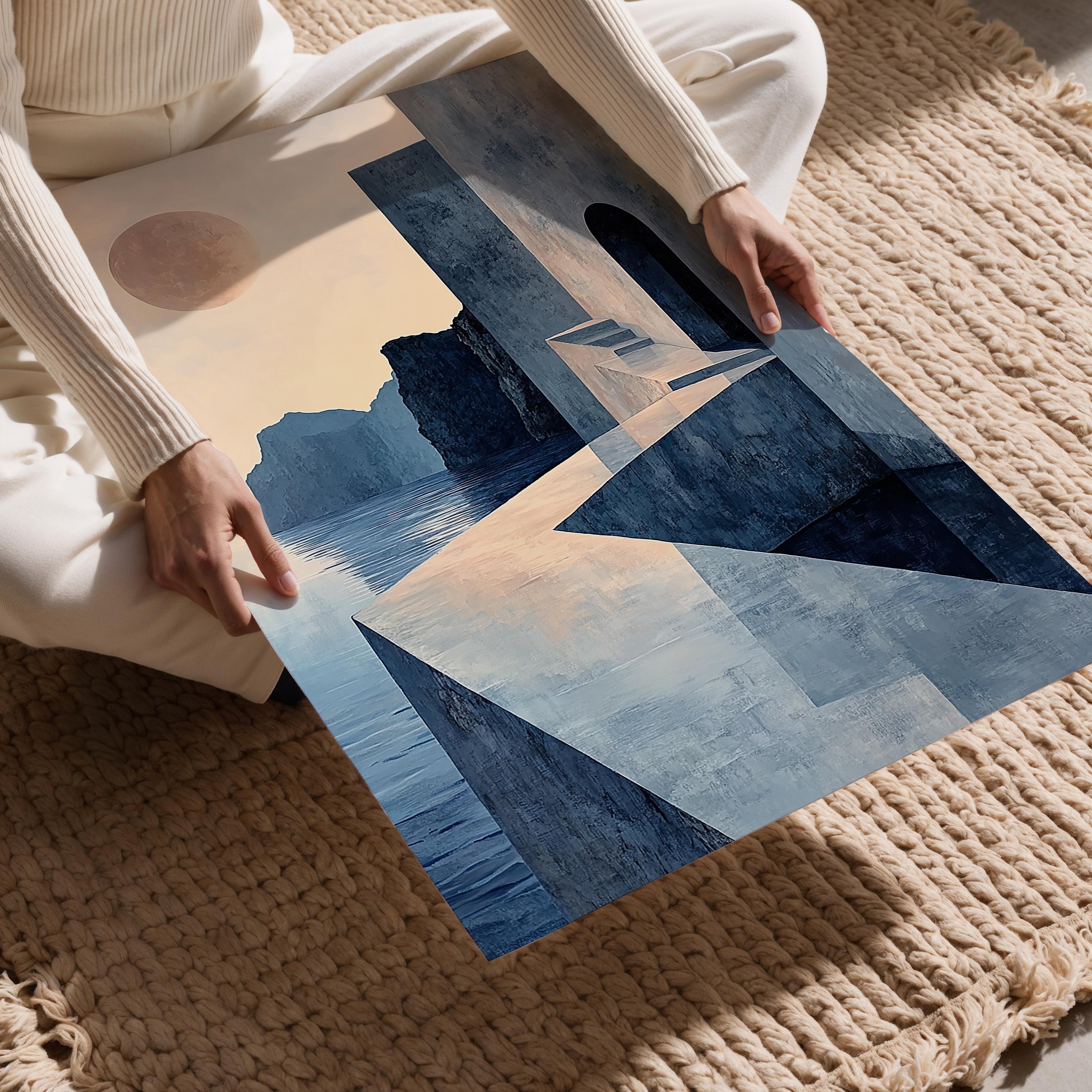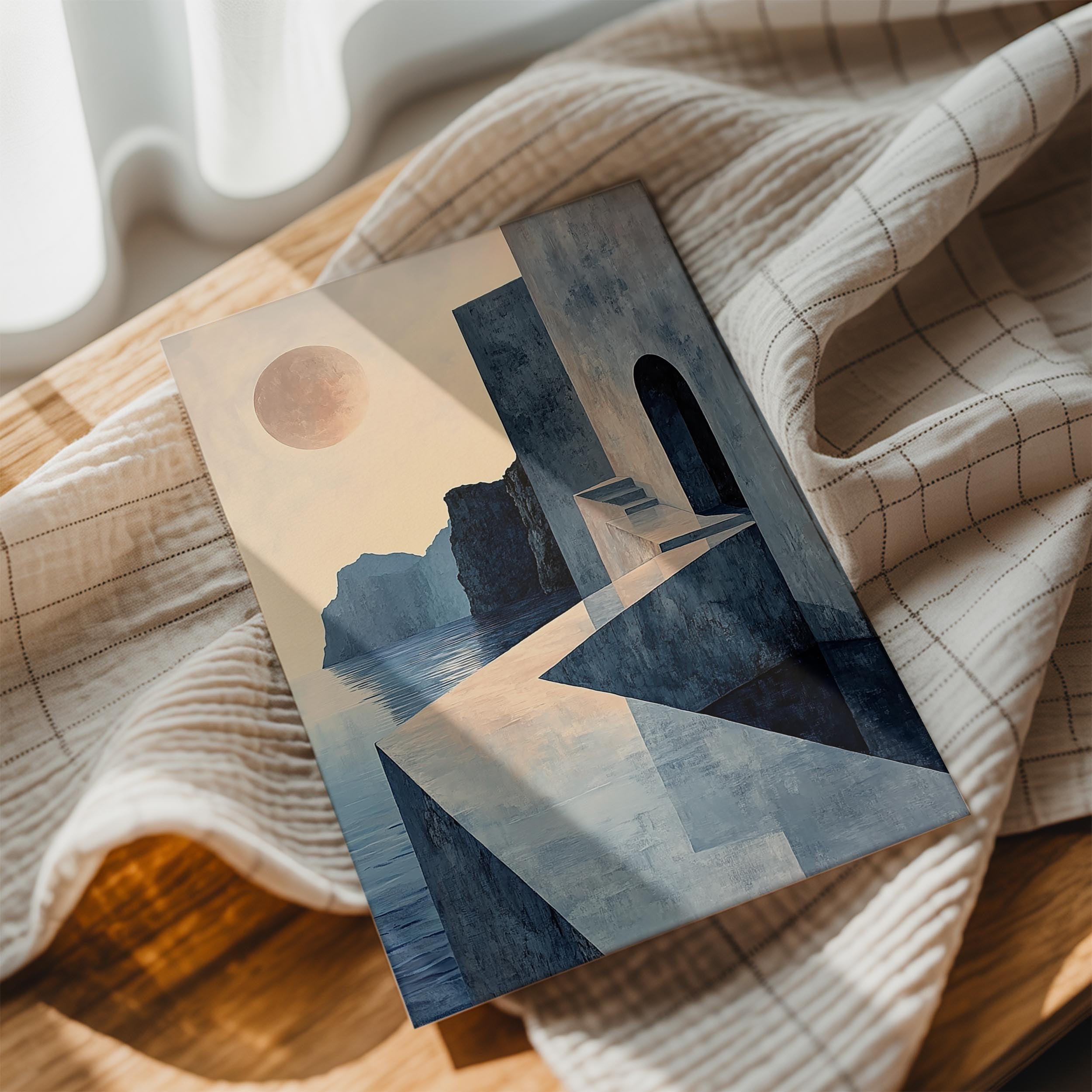 A tranquil yet surreal scene, this artwork depicts a lunar-lit coastline with towering, angular structures casting stark shadows over calm waters. The pastel hues of the moonlight reflecting on the sleek surfaces create a dreamlike atmosphere, blending reality with imagination. The mysterious pathways and open arches invite viewers to ponder their purpose, evoking a sense of exploration and serenity. Ideal for meditation rooms, bedrooms, or art collections focused on otherworldly themes, this piece brings peace and intrigue to any space.