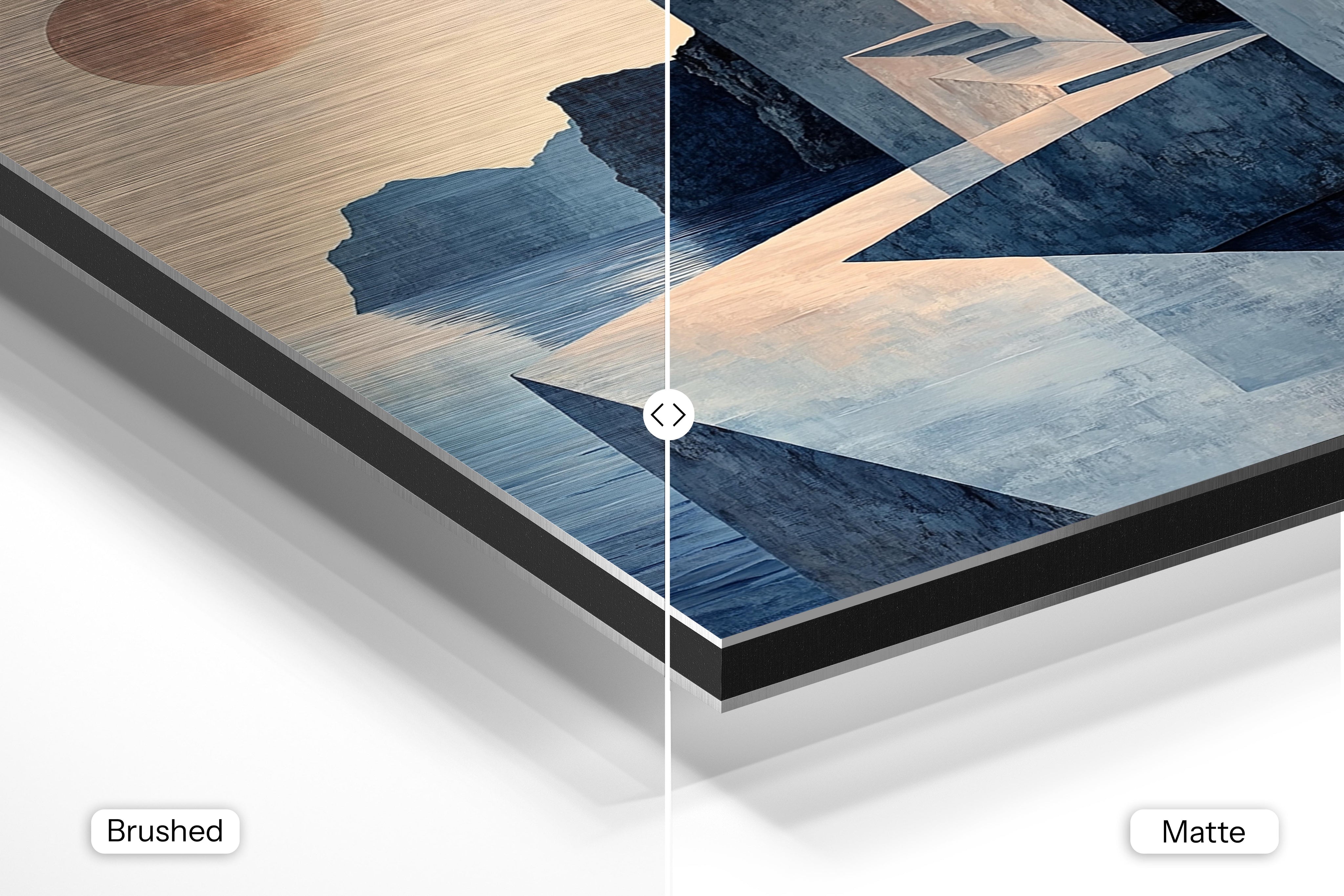 - Brushed Aluminum, on the other hand, features a raw metallic texture with visible brush strokes. Whites and highlights in your image let the silver surface show through, adding a dramatic, shimmering effect. Ideal for black-and-white images, minimalist designs, or abstract art, it creates a bold, industrial vibe with a modern edge.