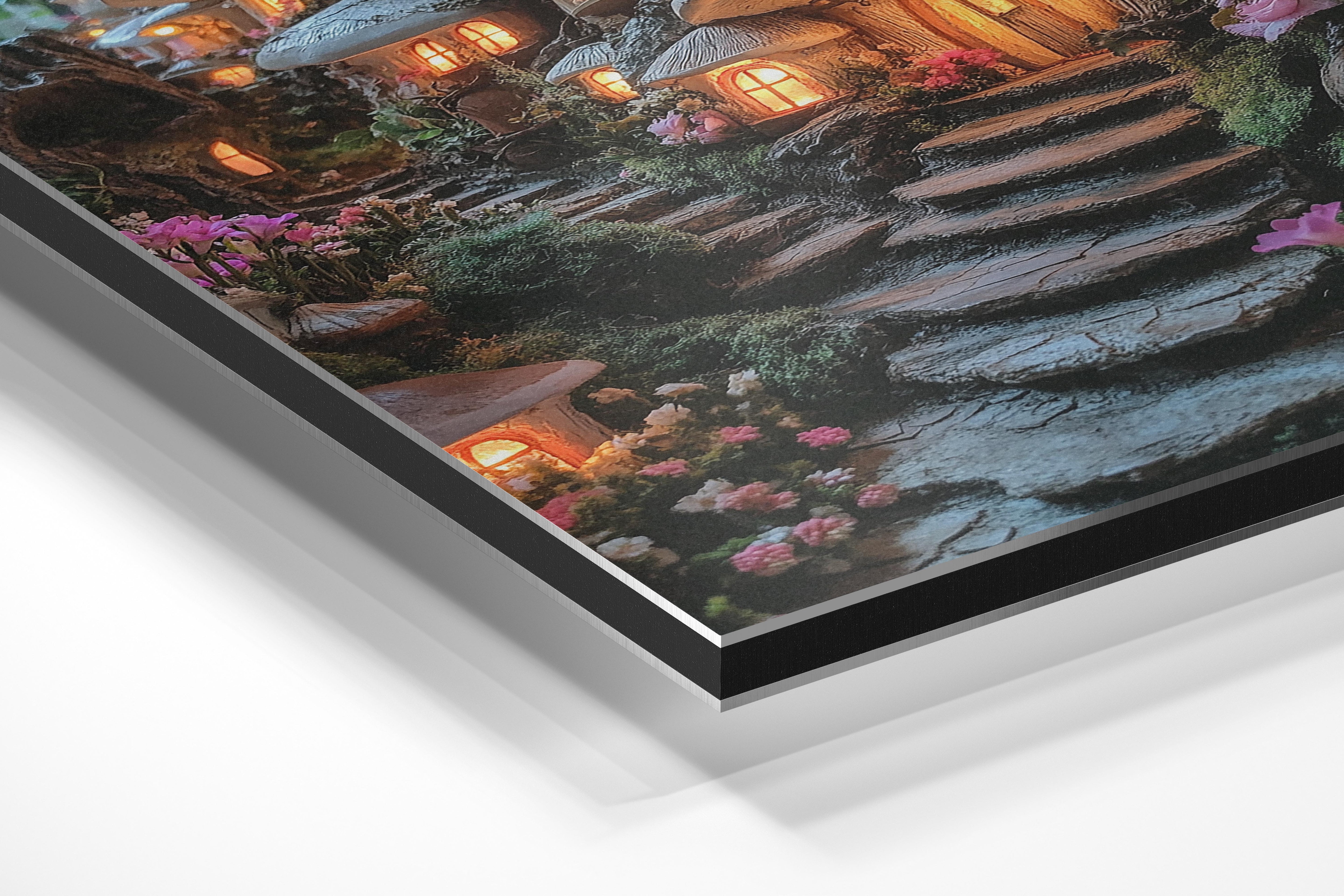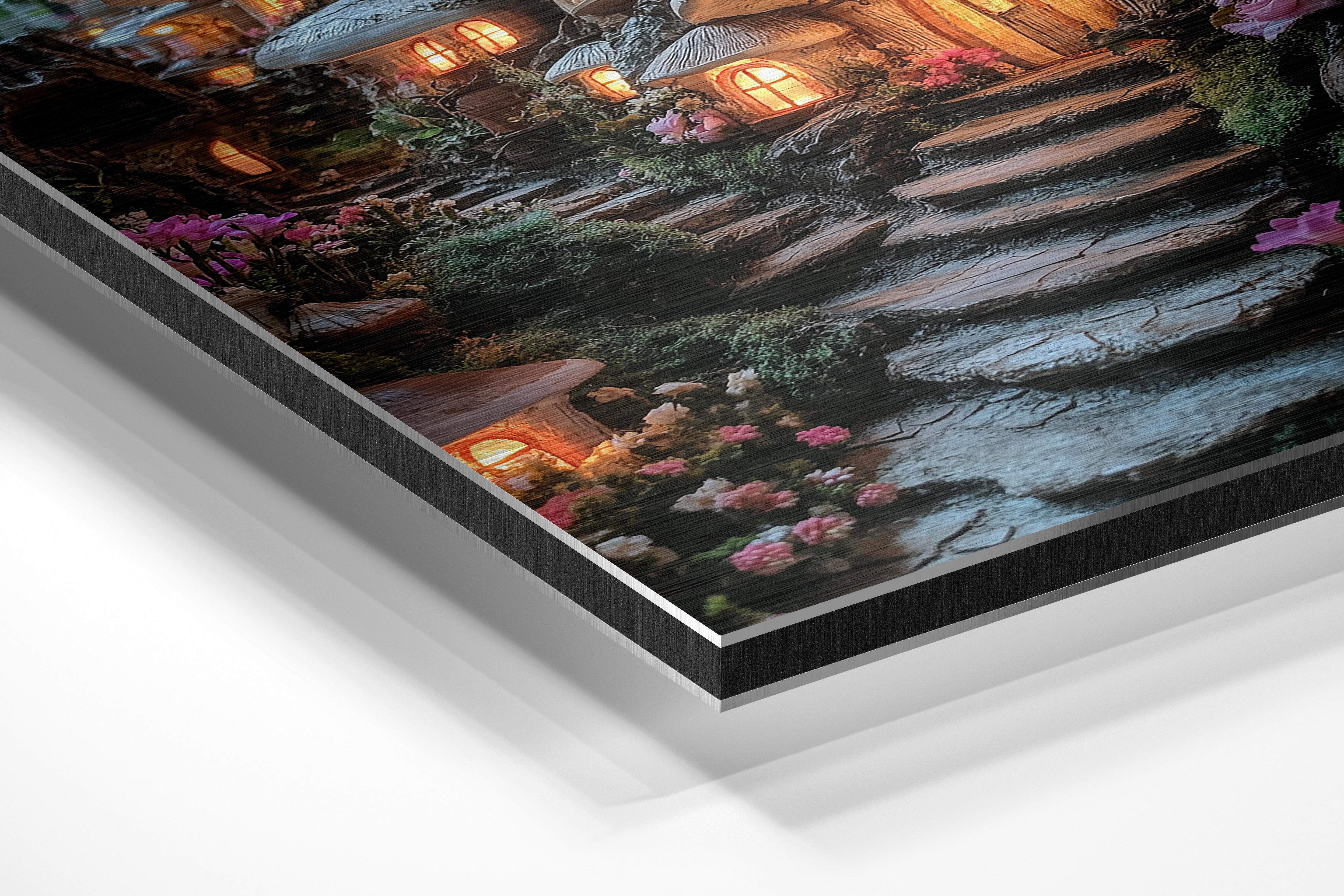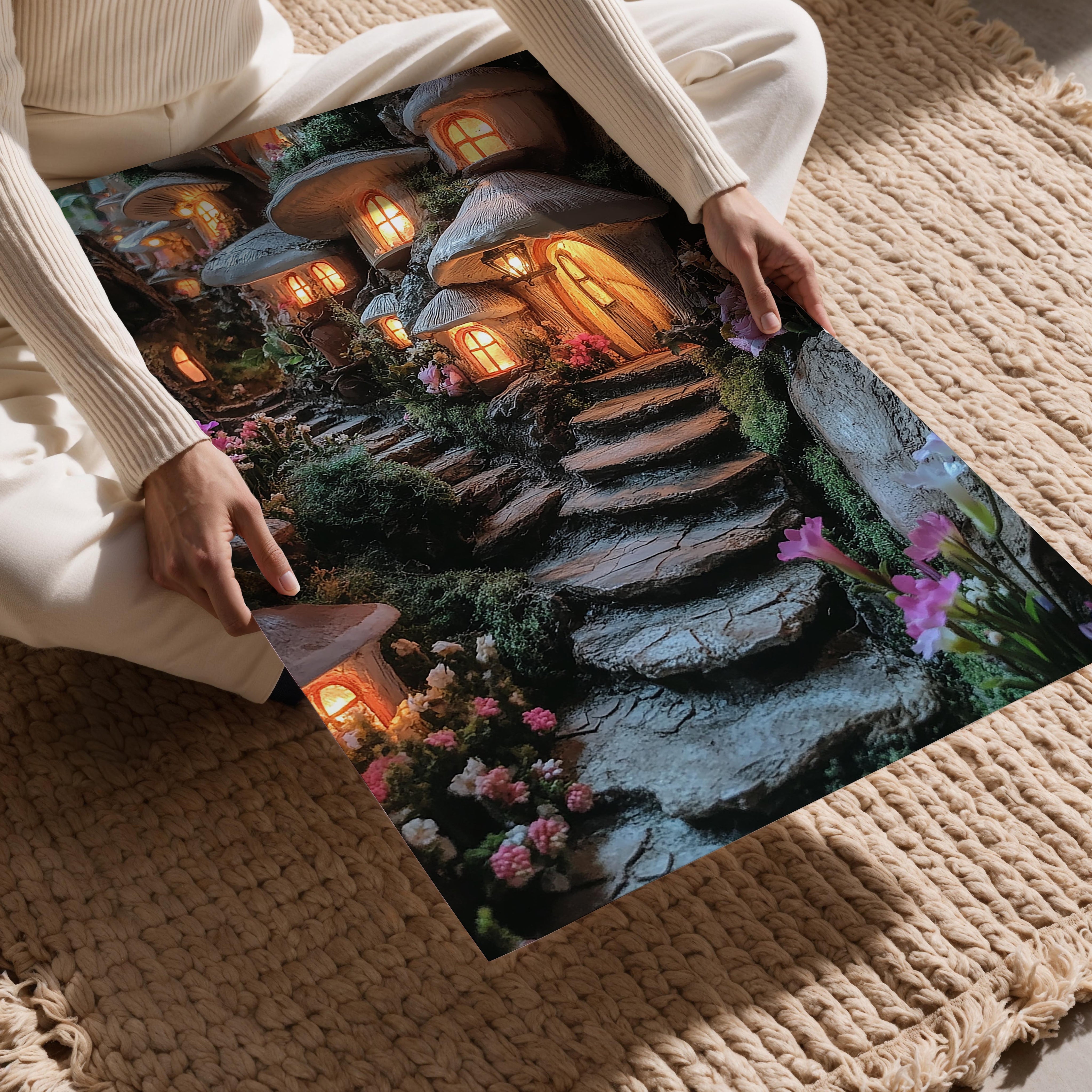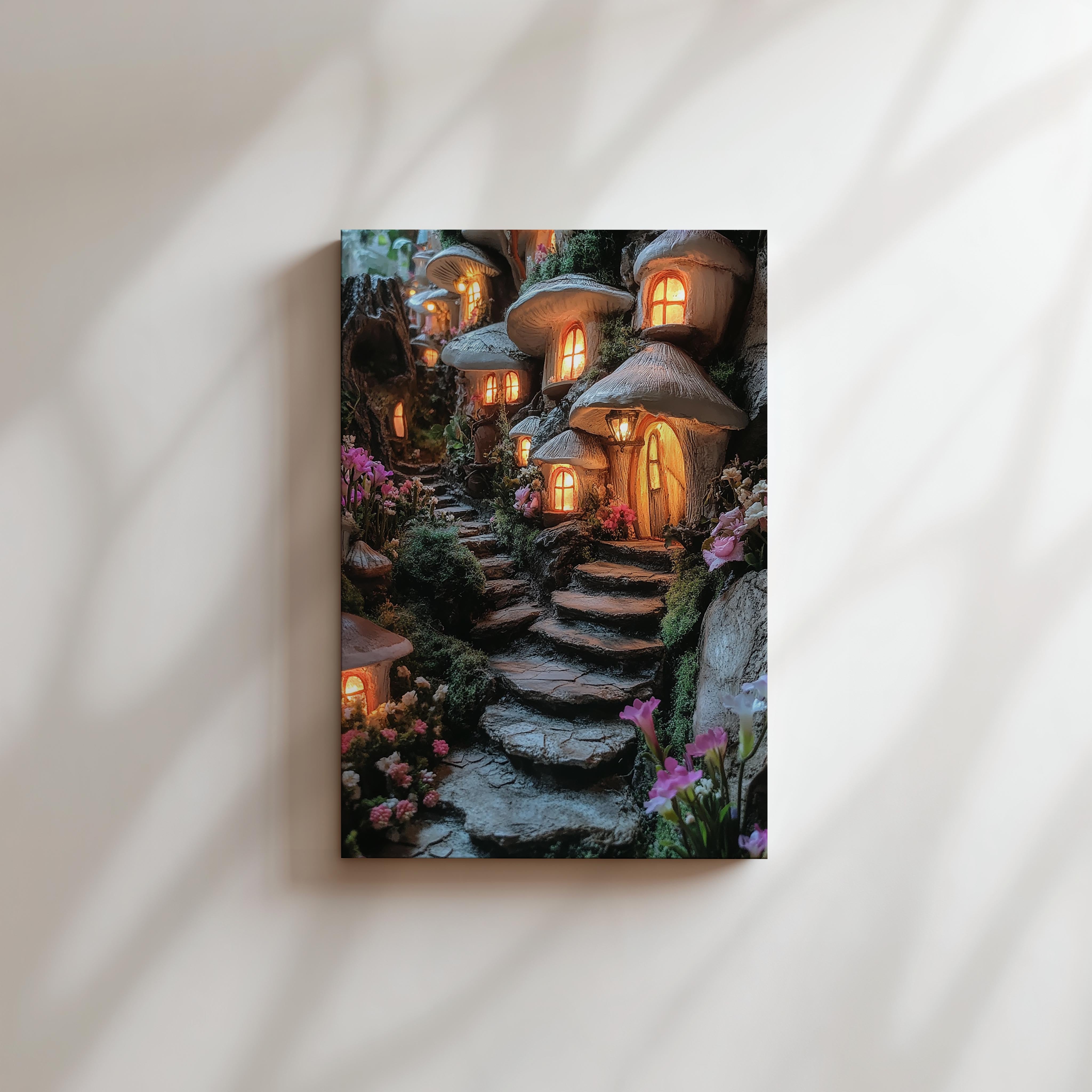 A fantastical depiction of mushroom houses nestled in an enchanting forest. The glowing windows and lush greenery create a scene straight out of a storybook. This artwork is perfect for children’s spaces, fantasy-themed rooms, or as a unique statement piece in a living area. The warm lighting and intricate details invite viewers to lose themselves in the magical world it portrays. A celebration of creativity and the beauty of the imagination, this piece brings a sense of wonder and joy, making it an ideal choice for dreamers and storytellers alike.
