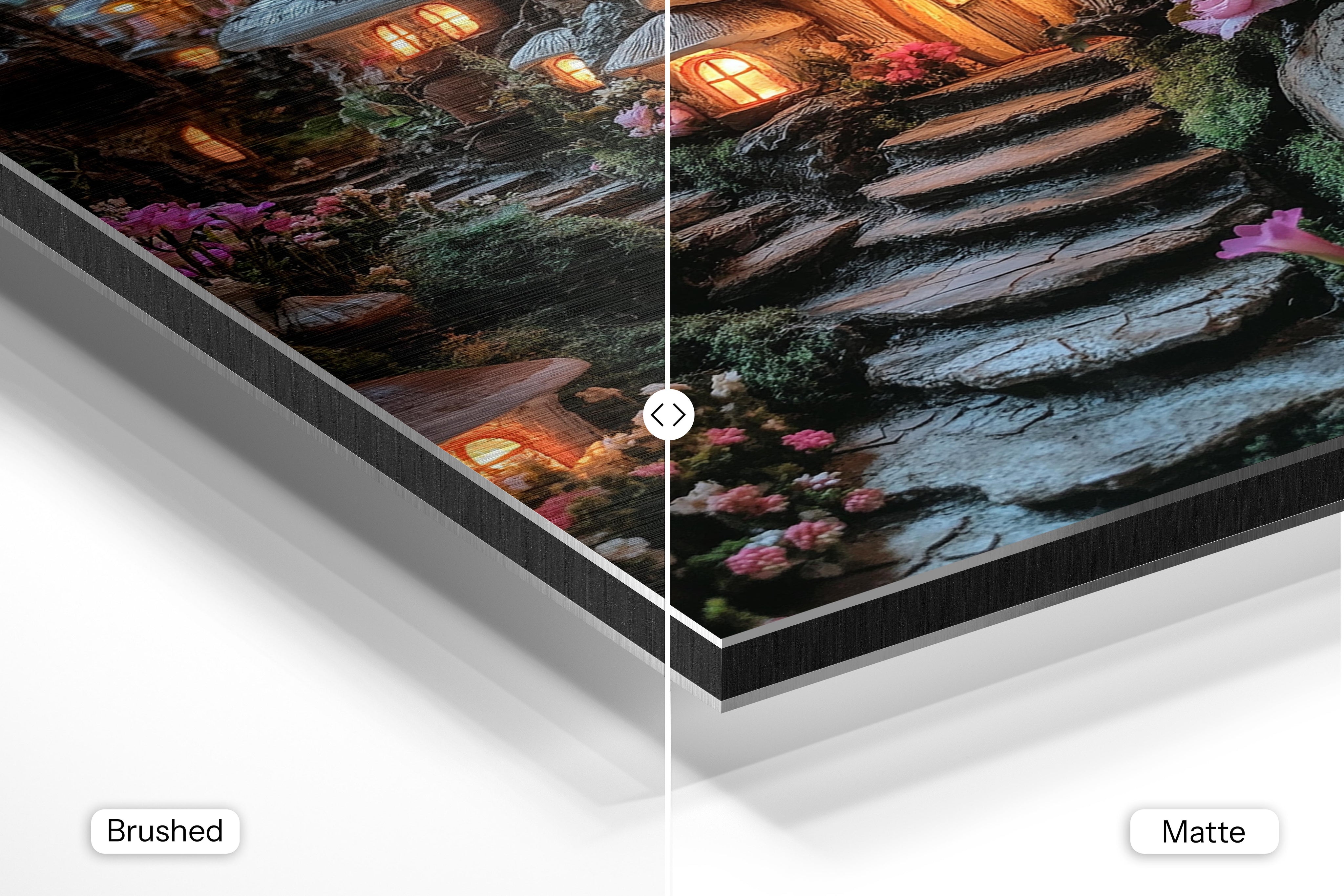 - Brushed Aluminum, on the other hand, features a raw metallic texture with visible brush strokes. Whites and highlights in your image let the silver surface show through, adding a dramatic, shimmering effect. Ideal for black-and-white images, minimalist designs, or abstract art, it creates a bold, industrial vibe with a modern edge.