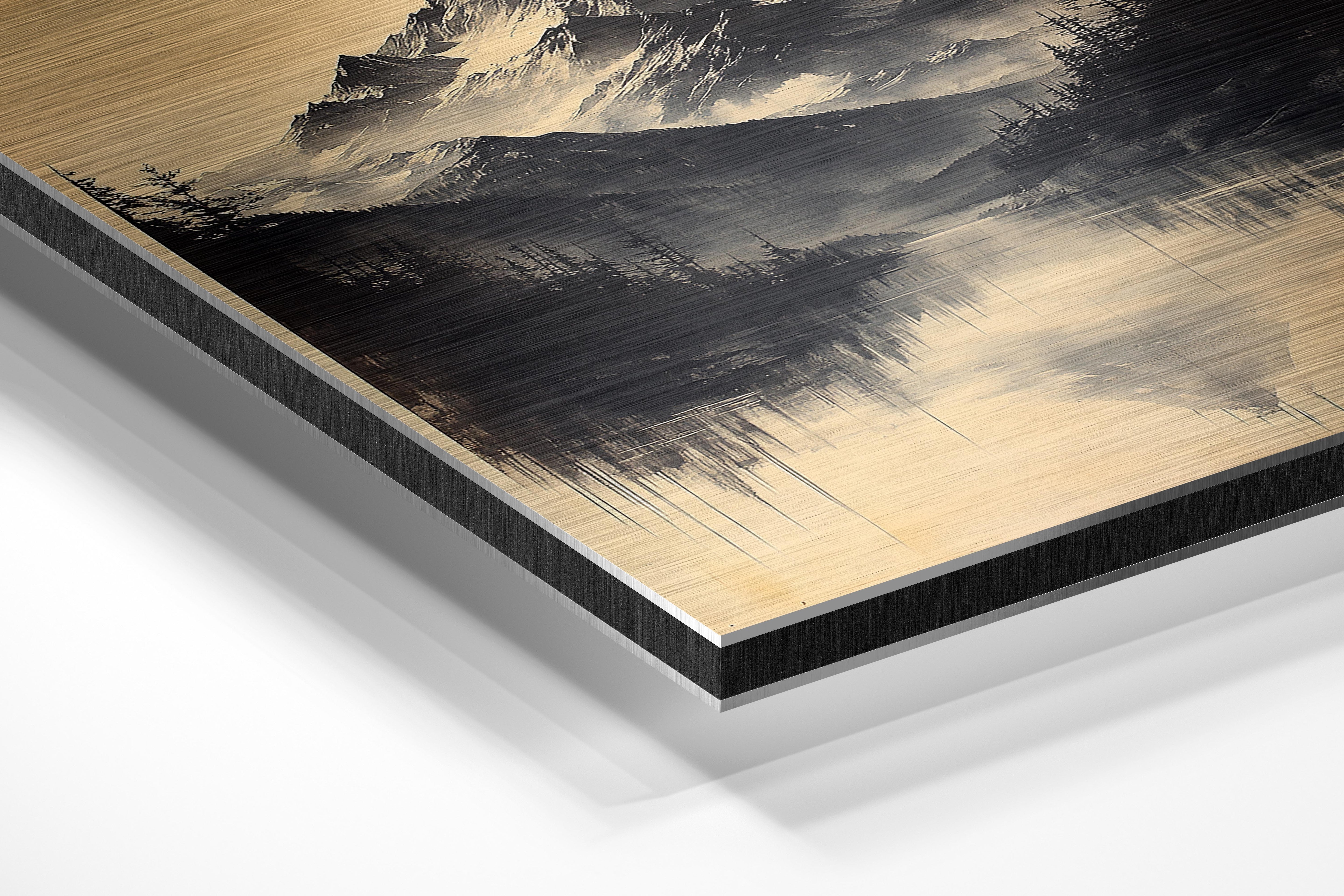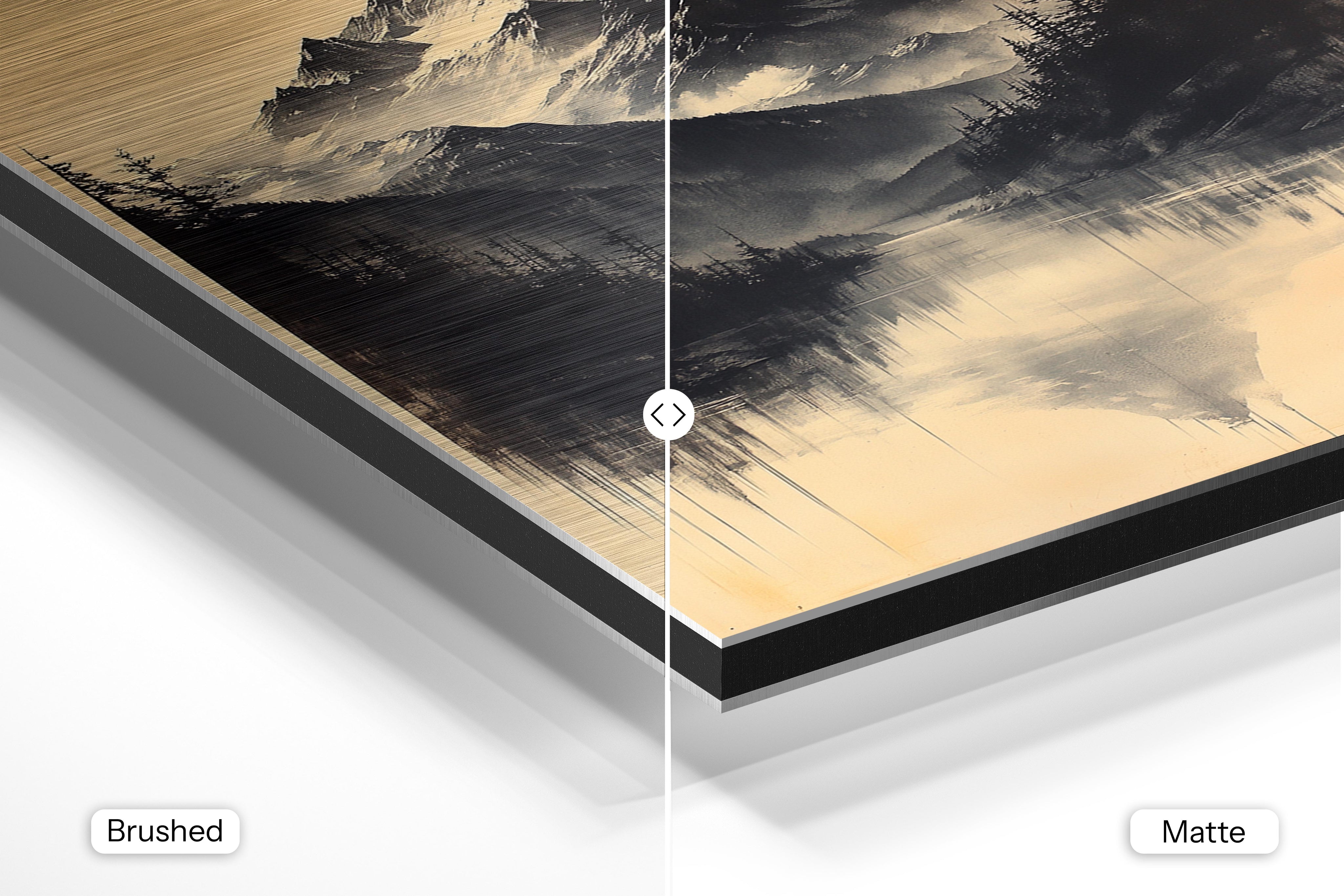 - Brushed Aluminum, on the other hand, features a raw metallic texture with visible brush strokes. Whites and highlights in your image let the silver surface show through, adding a dramatic, shimmering effect. Ideal for black-and-white images, minimalist designs, or abstract art, it creates a bold, industrial vibe with a modern edge.