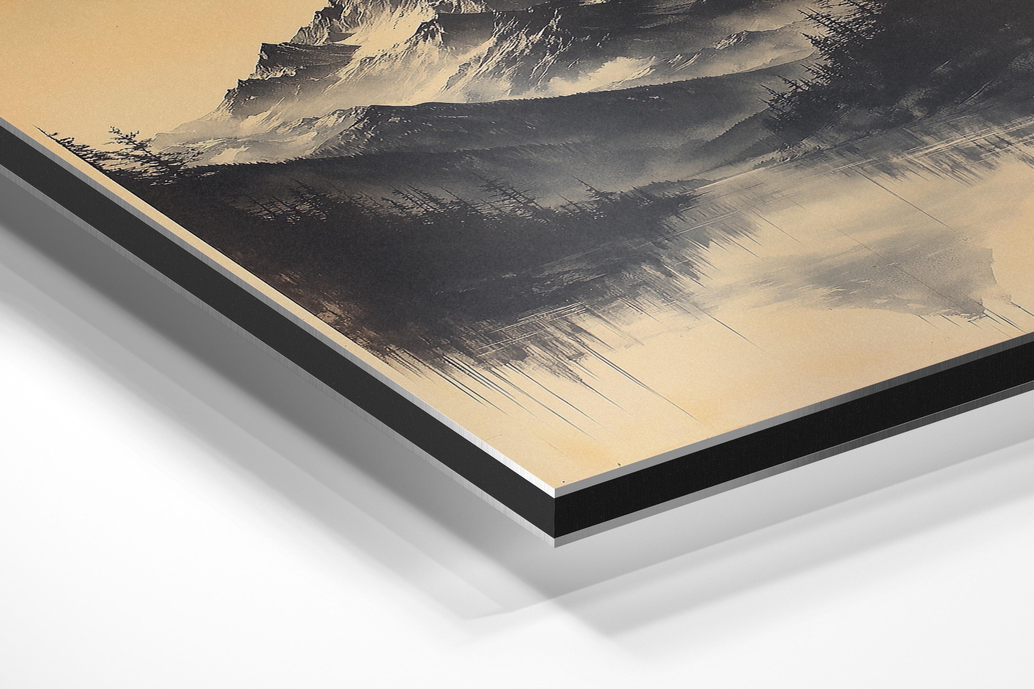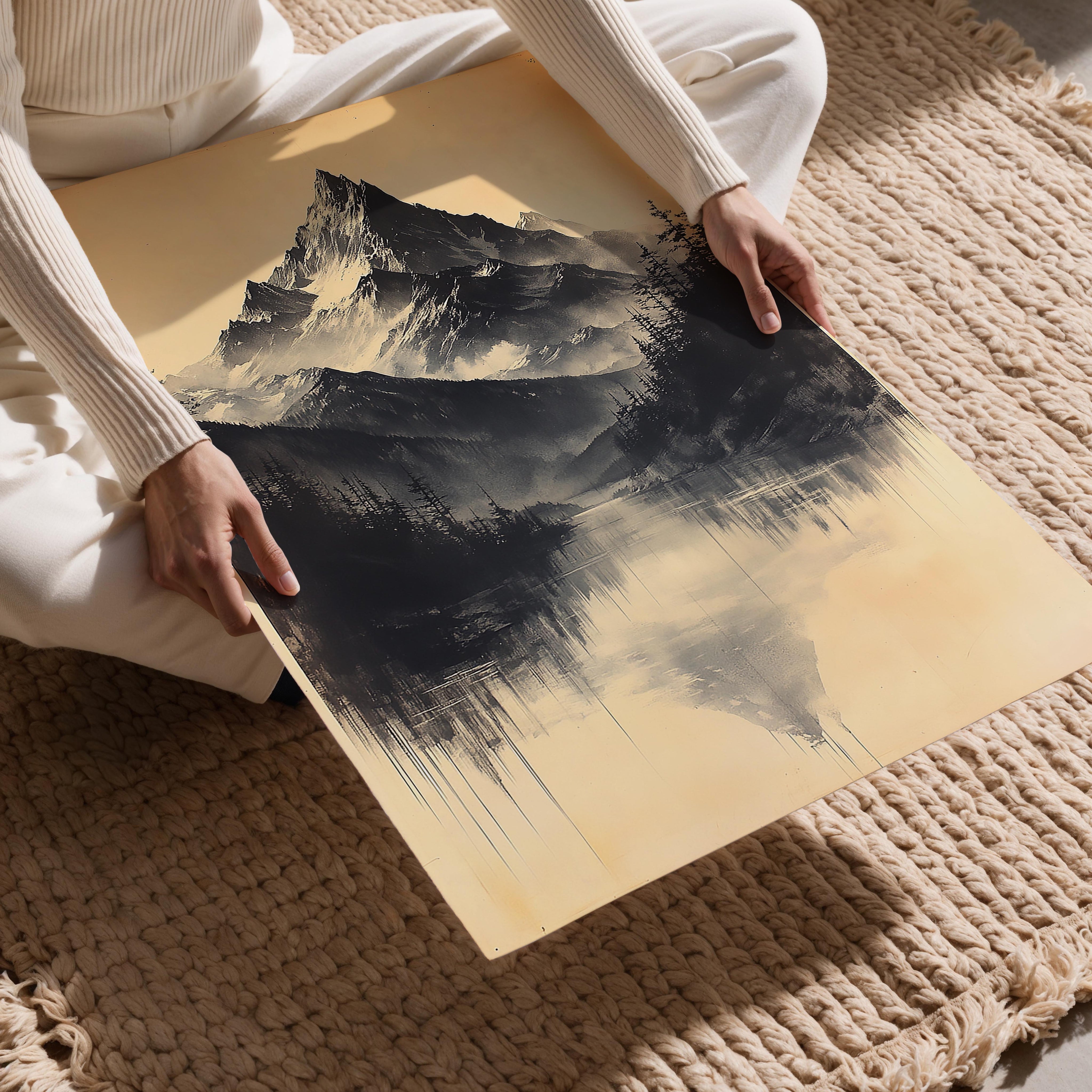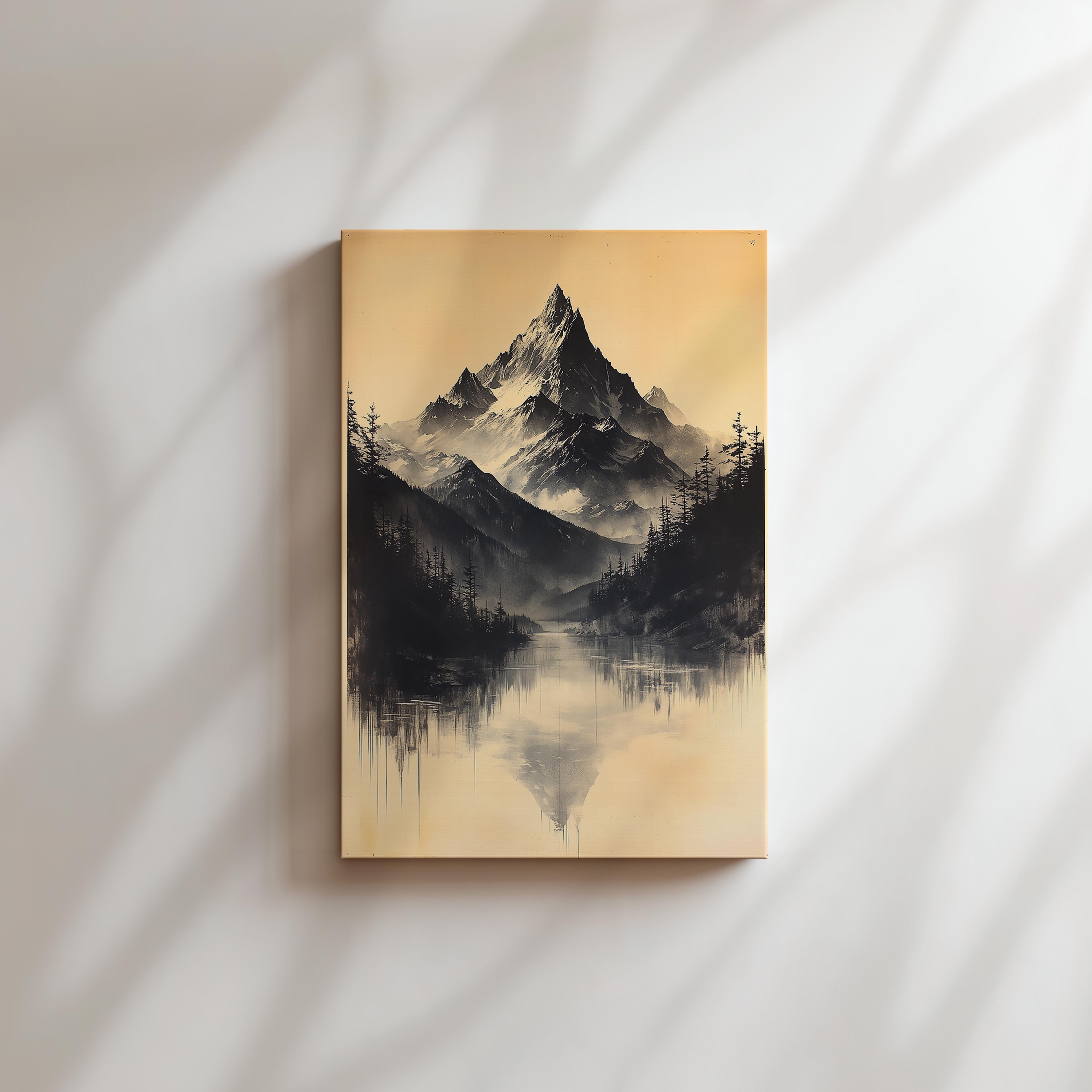 This artwork captures a breathtaking mountain landscape reflected on a calm lake. The towering snow-capped peak dominates the background, creating a sense of grandeur, while the dark evergreen forest lining the water’s edge enhances the depth of the composition. The subtle sepia-toned palette gives it a timeless, almost ethereal quality. Perfect for those who appreciate nature’s serenity, this piece would make an excellent addition to a living room or office, inspiring a sense of peace and admiration for the wild. The detailed textures and the interplay between light and shadow make this an eye-catching focal point for any setting.