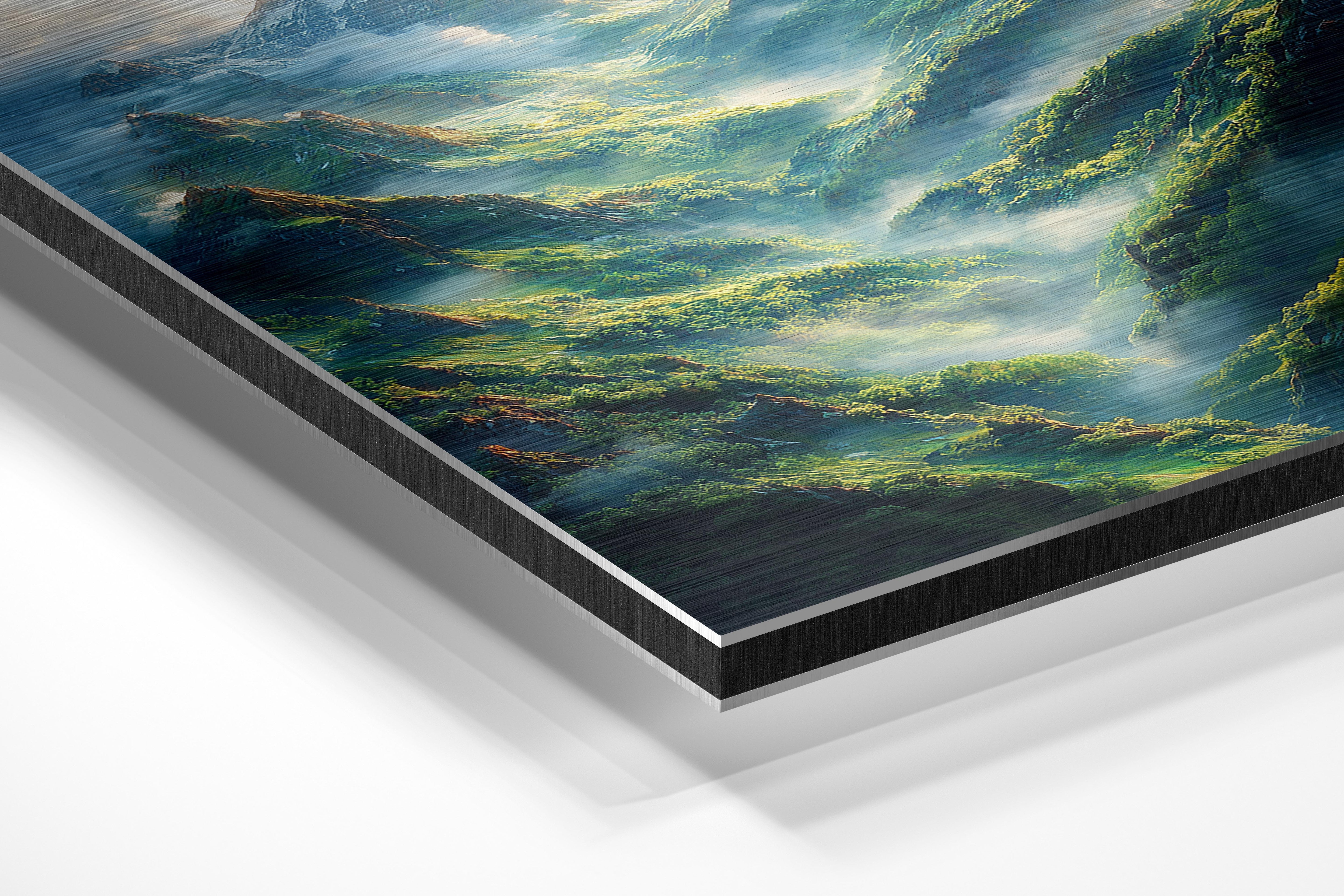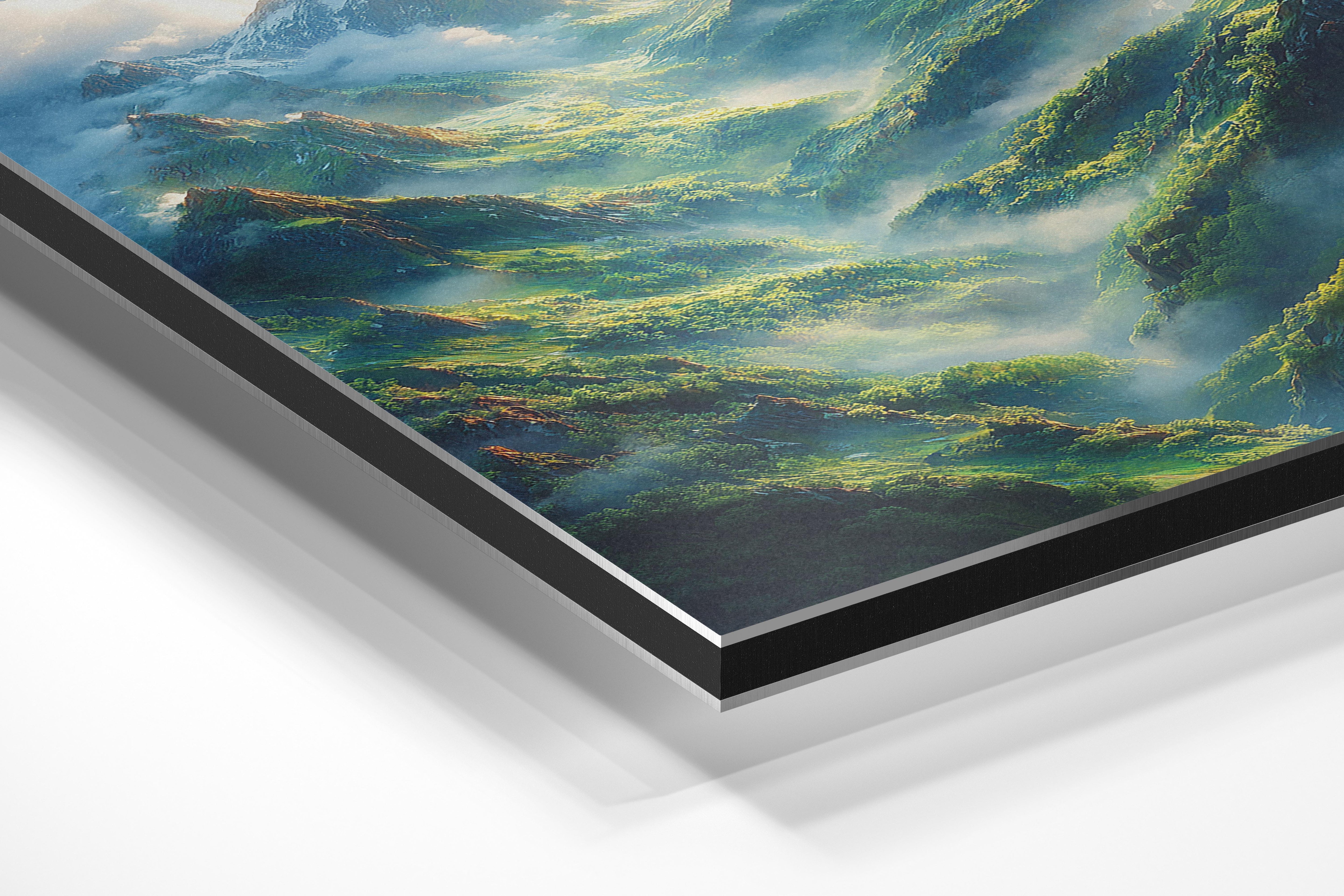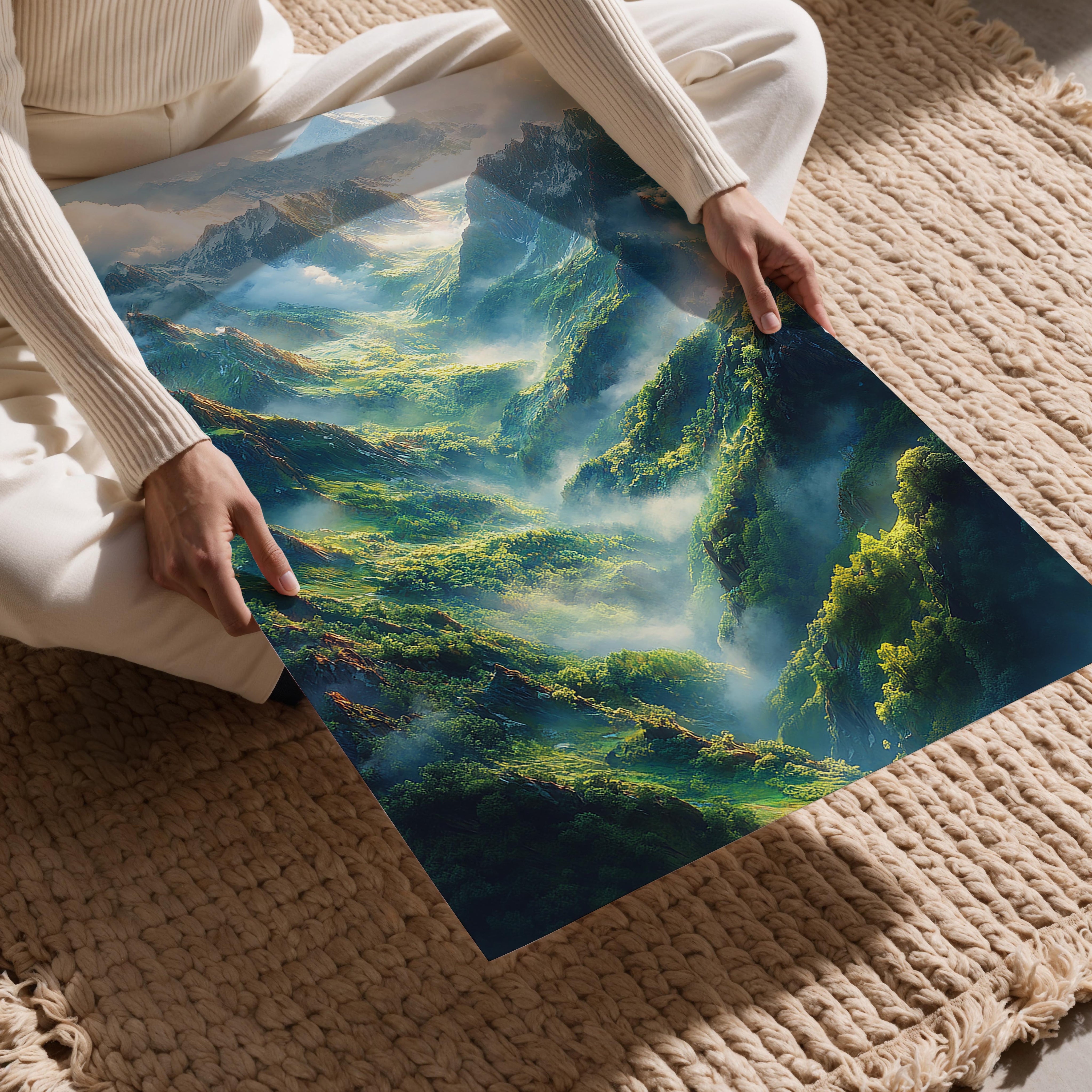 A breathtaking illustration of a mountain valley covered in lush greenery and mist. The dramatic peaks, combined with the sunlight streaming through the clouds, create an ethereal and calming atmosphere. This artwork exudes natural beauty and serenity, making it ideal for meditation rooms, nature retreats, or as an inspiring addition to living spaces. Its vivid realism and attention to detail bring the grandeur of the outdoors indoors.