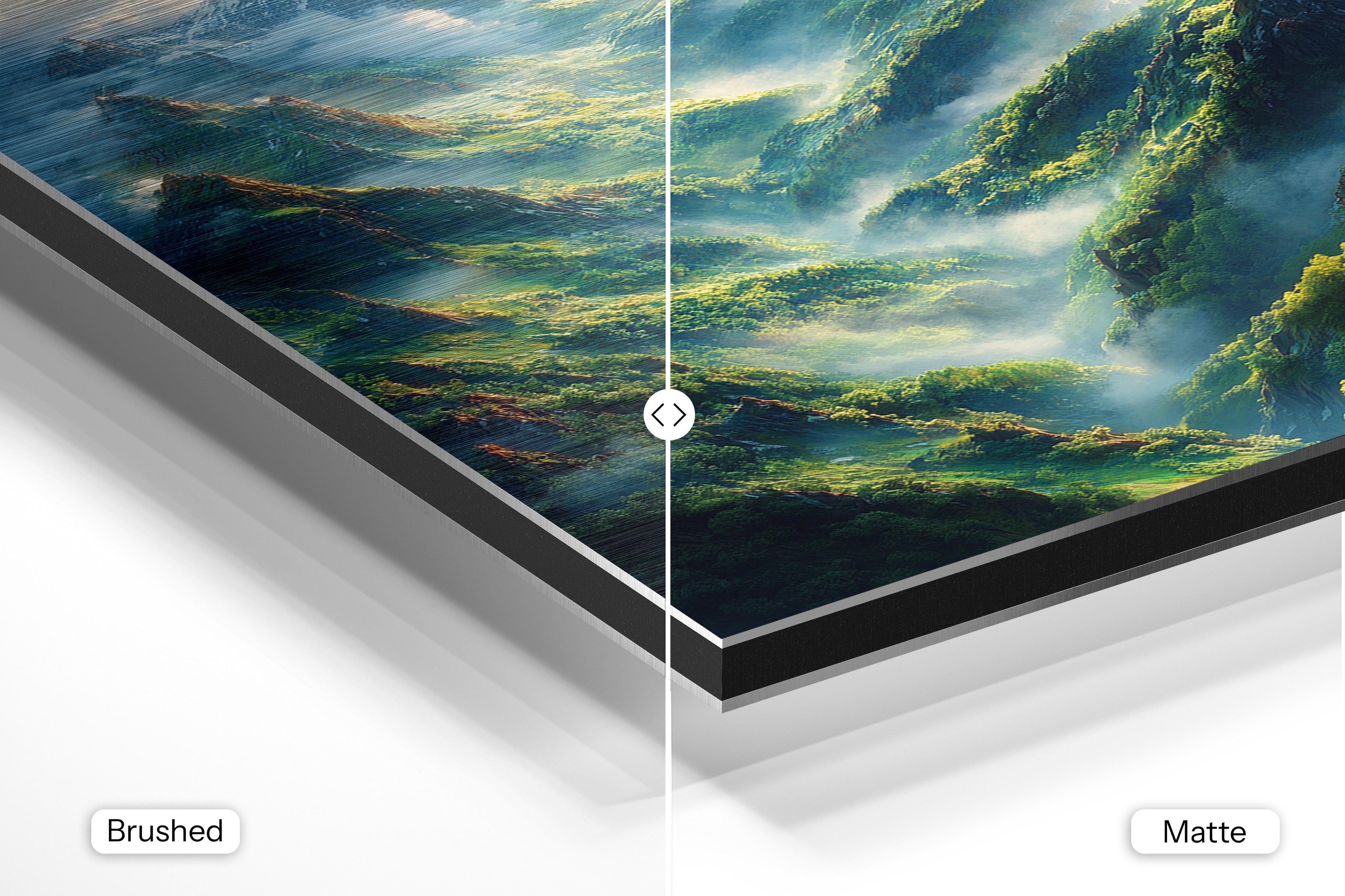 - Brushed Aluminum, on the other hand, features a raw metallic texture with visible brush strokes. Whites and highlights in your image let the silver surface show through, adding a dramatic, shimmering effect. Ideal for black-and-white images, minimalist designs, or abstract art, it creates a bold, industrial vibe with a modern edge.