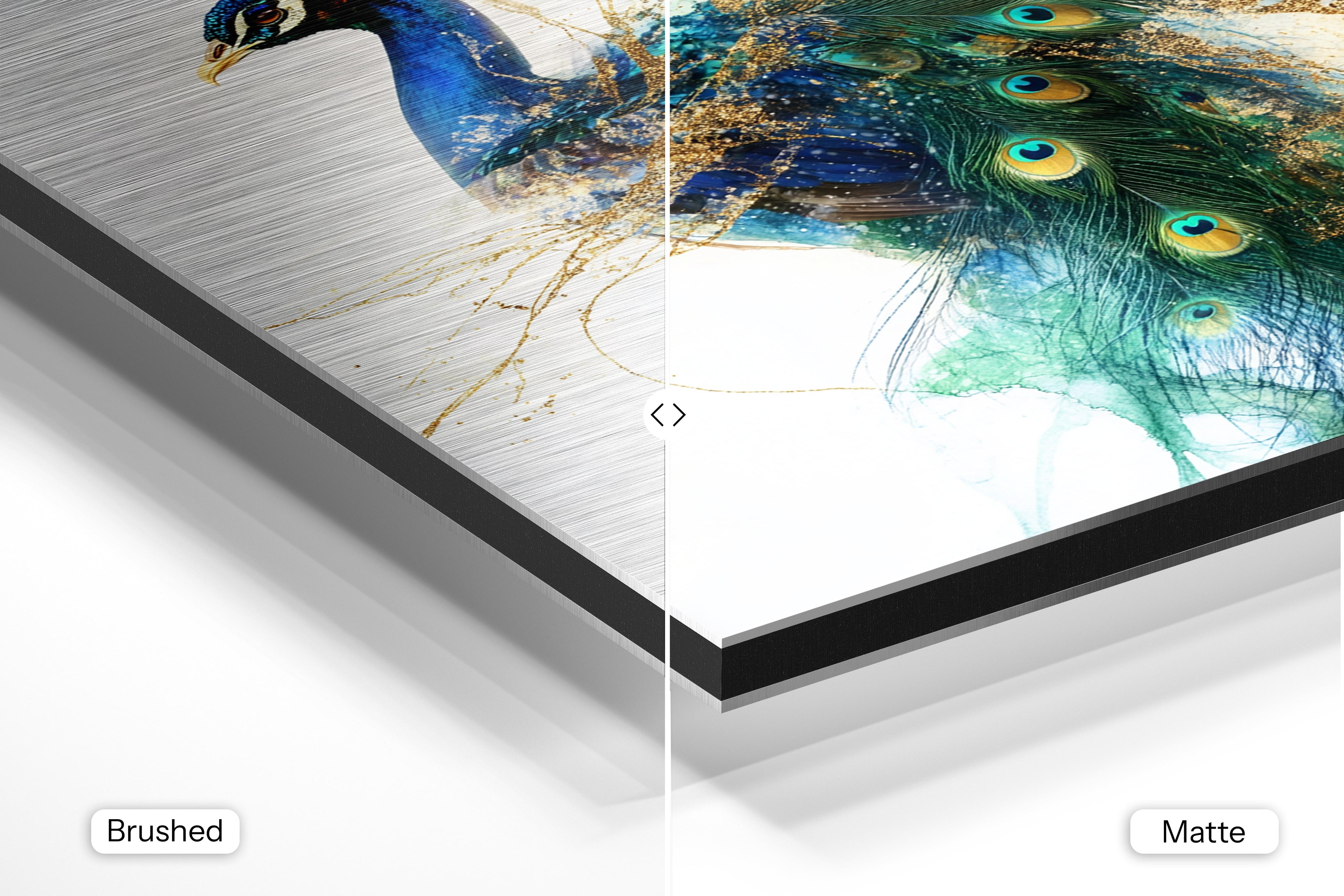 - Brushed Aluminum, on the other hand, features a raw metallic texture with visible brush strokes. Whites and highlights in your image let the silver surface show through, adding a dramatic, shimmering effect. Ideal for black-and-white images, minimalist designs, or abstract art, it creates a bold, industrial vibe with a modern edge.