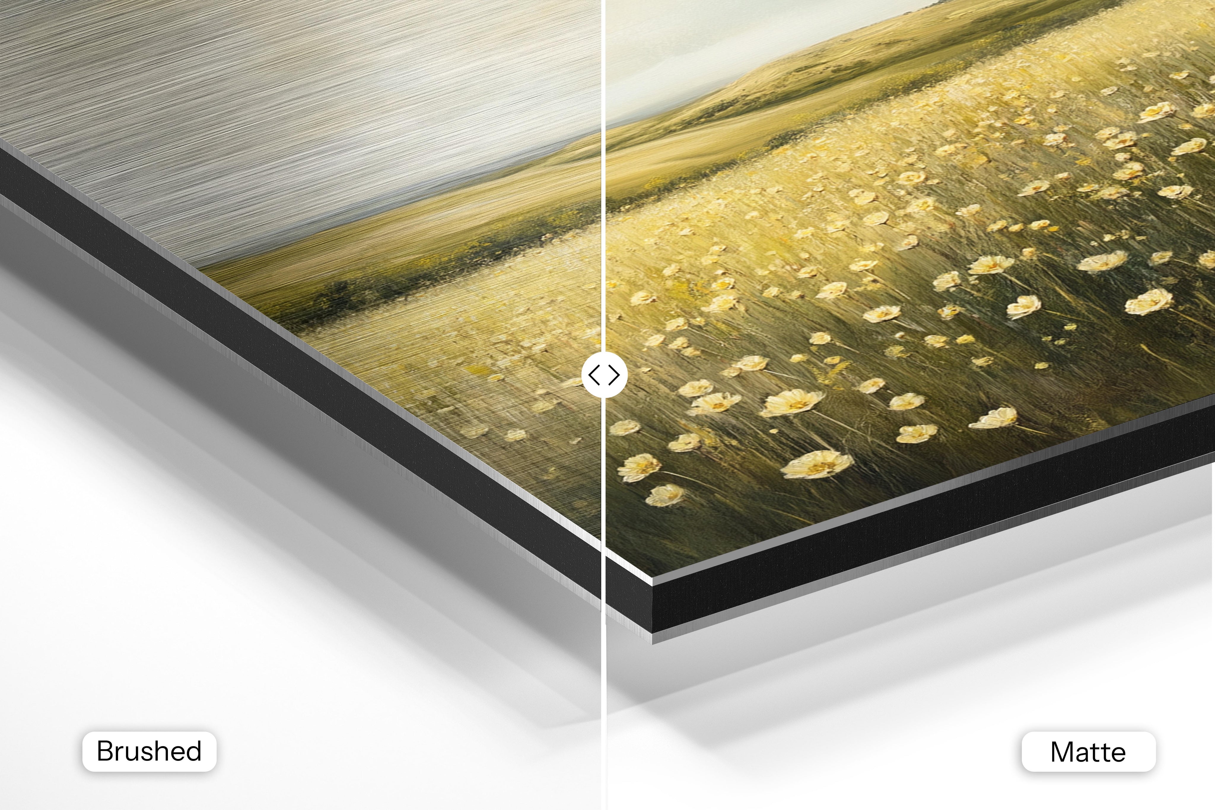 - Brushed Aluminum, on the other hand, features a raw metallic texture with visible brush strokes. Whites and highlights in your image let the silver surface show through, adding a dramatic, shimmering effect. Ideal for black-and-white images, minimalist designs, or abstract art, it creates a bold, industrial vibe with a modern edge.