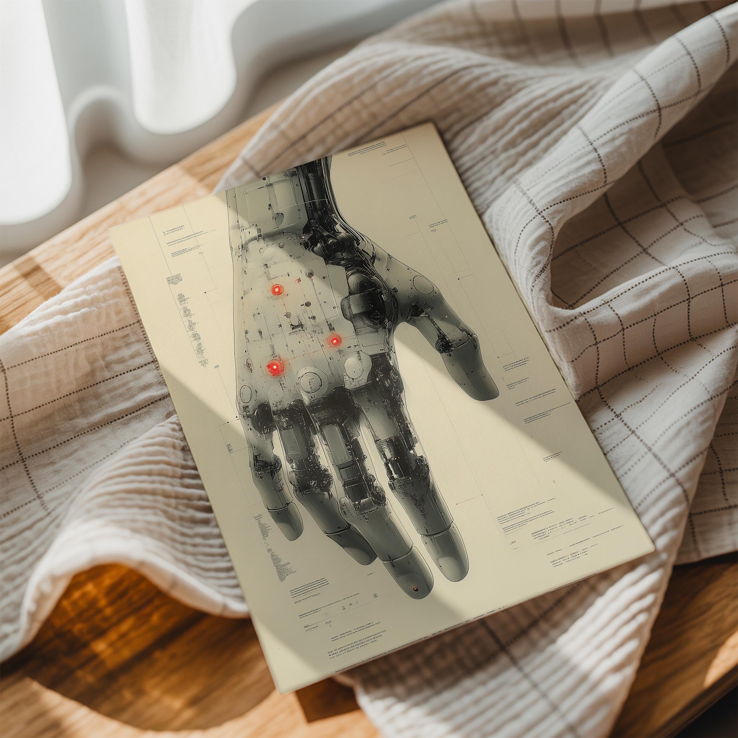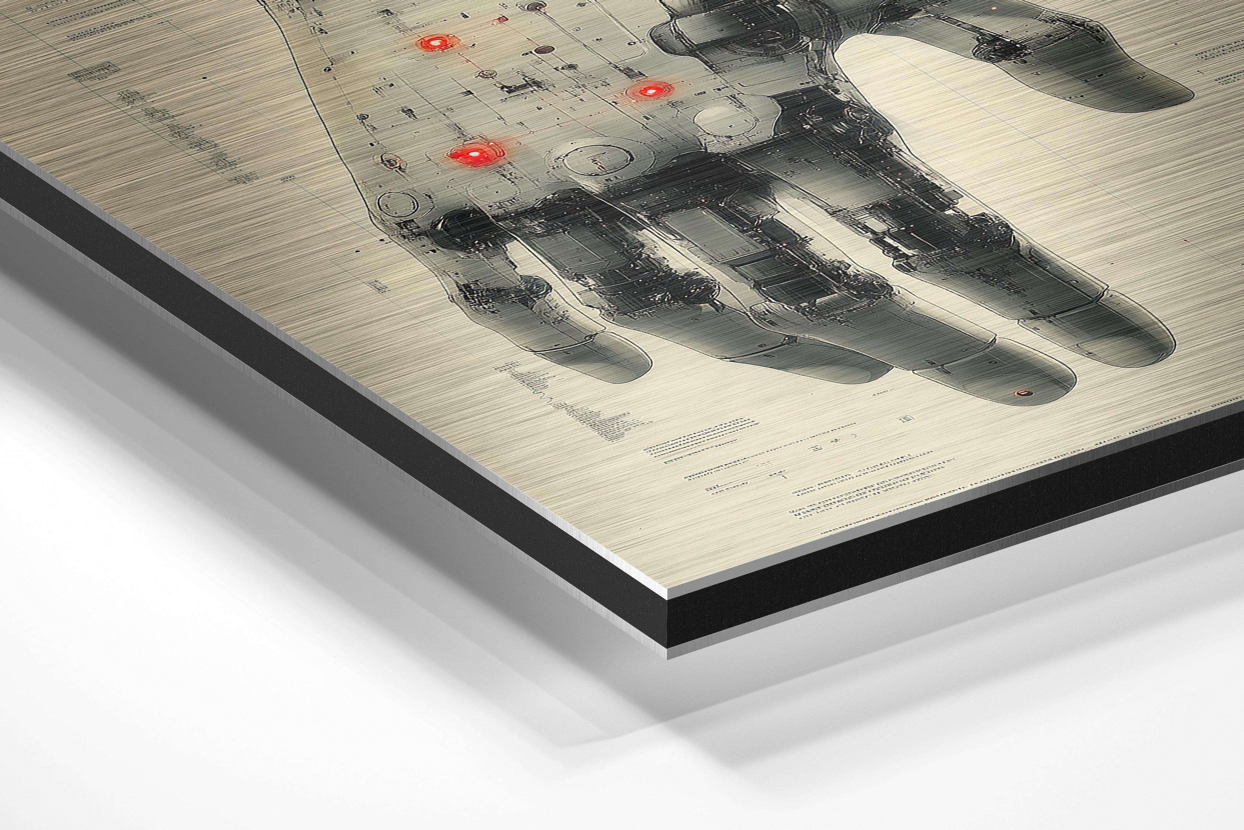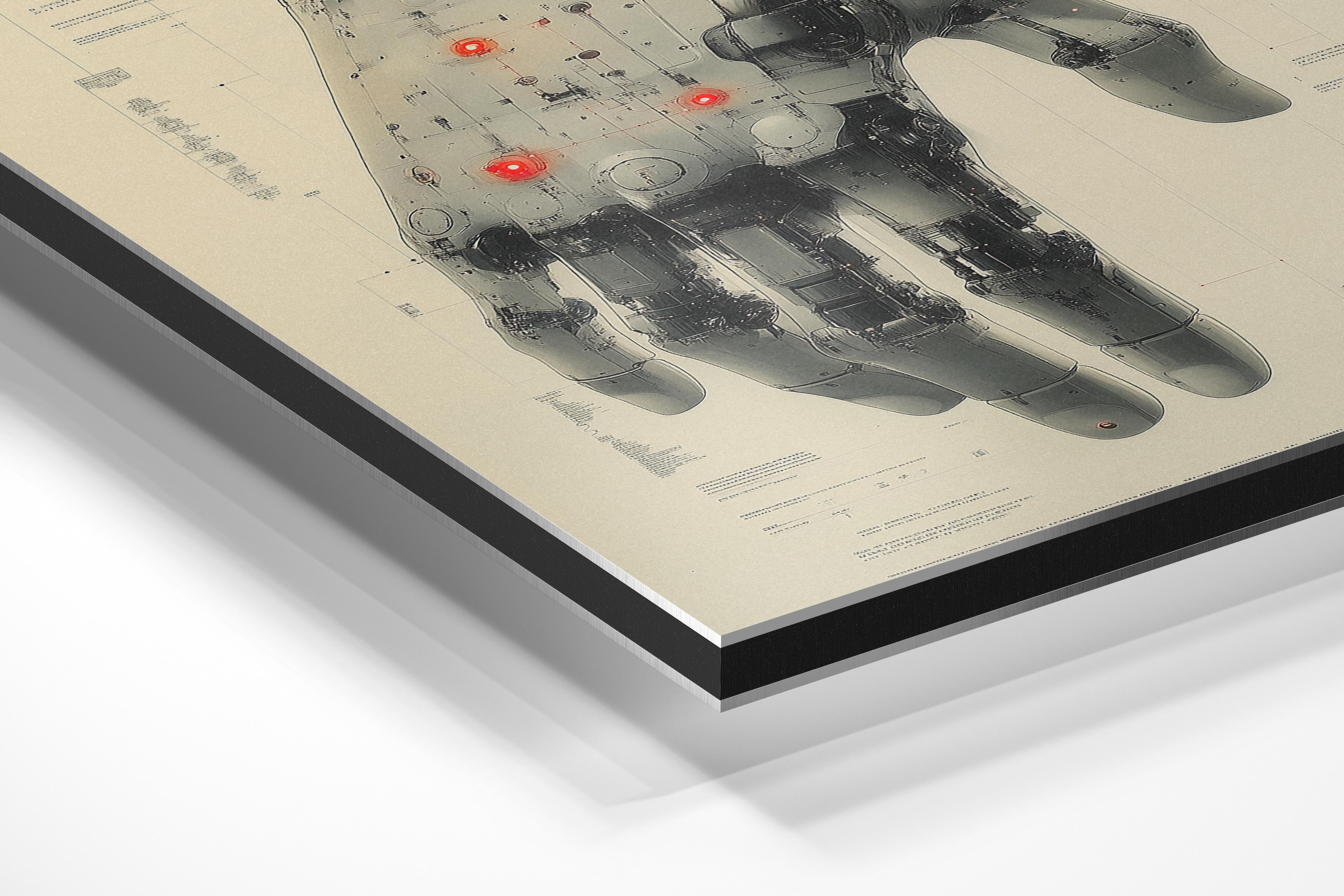 This detailed illustration of a mechanical hand showcases the intricacy of futuristic design, with glowing red accents adding a dramatic touch. The technical precision and futuristic vibe make this piece perfect for technology enthusiasts or modern industrial spaces, where innovation and creativity are celebrated.
