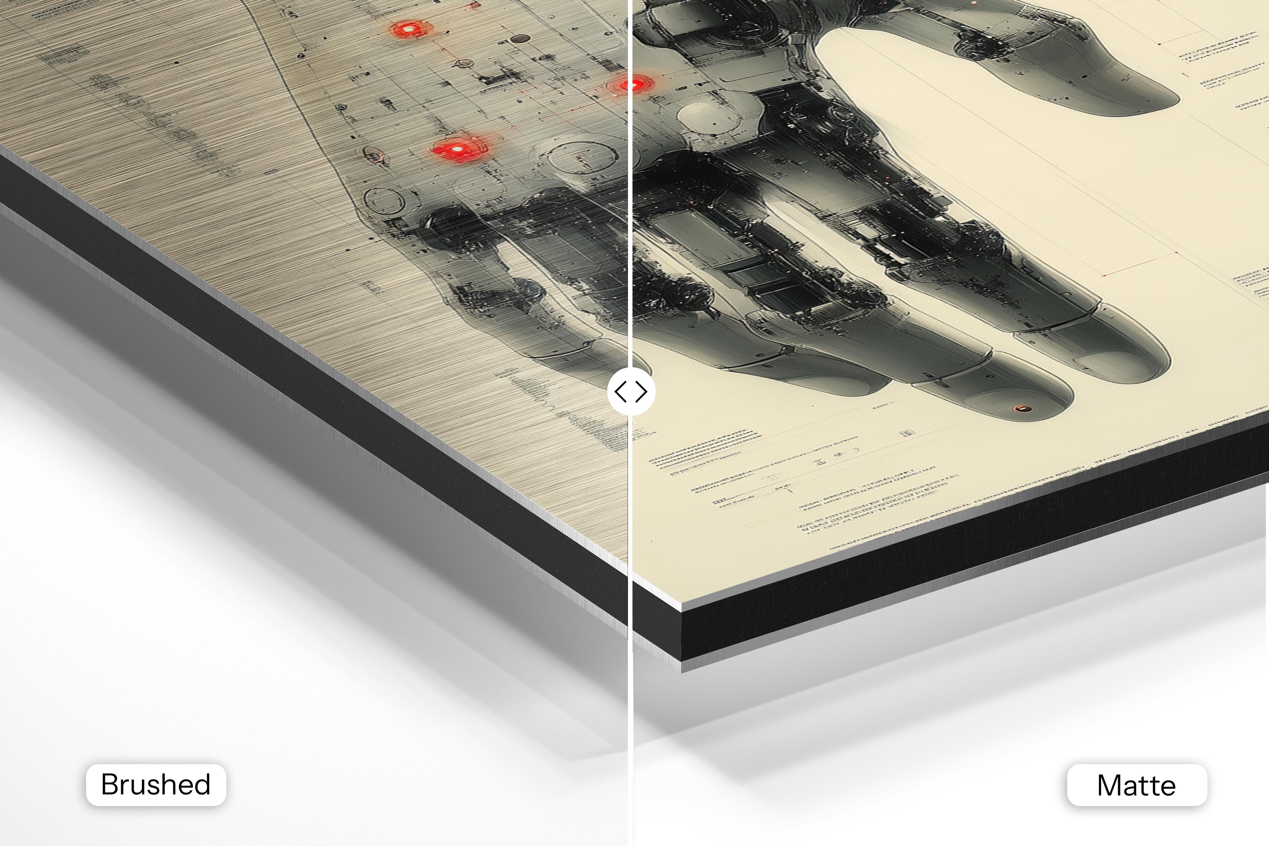 - Brushed Aluminum, on the other hand, features a raw metallic texture with visible brush strokes. Whites and highlights in your image let the silver surface show through, adding a dramatic, shimmering effect. Ideal for black-and-white images, minimalist designs, or abstract art, it creates a bold, industrial vibe with a modern edge.
