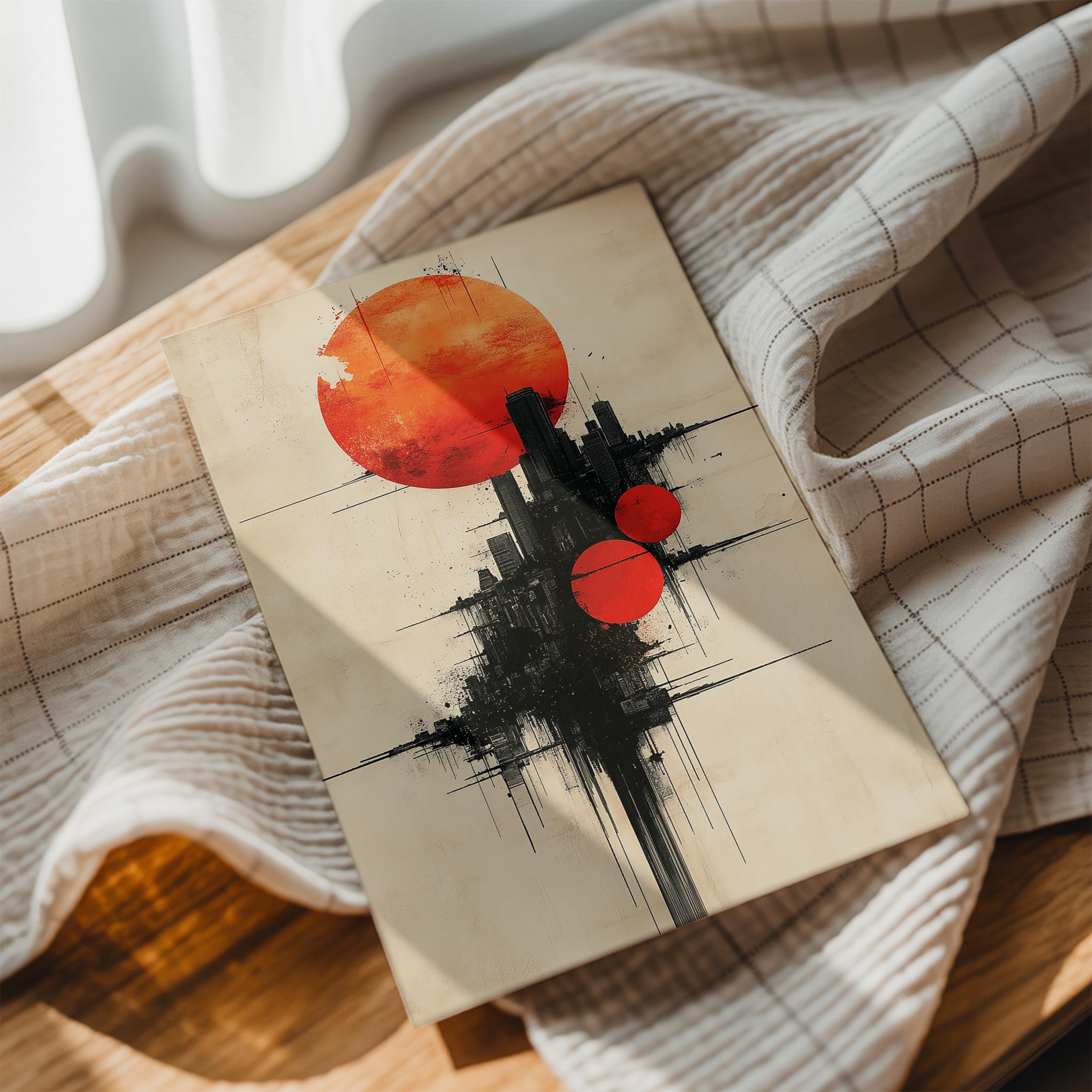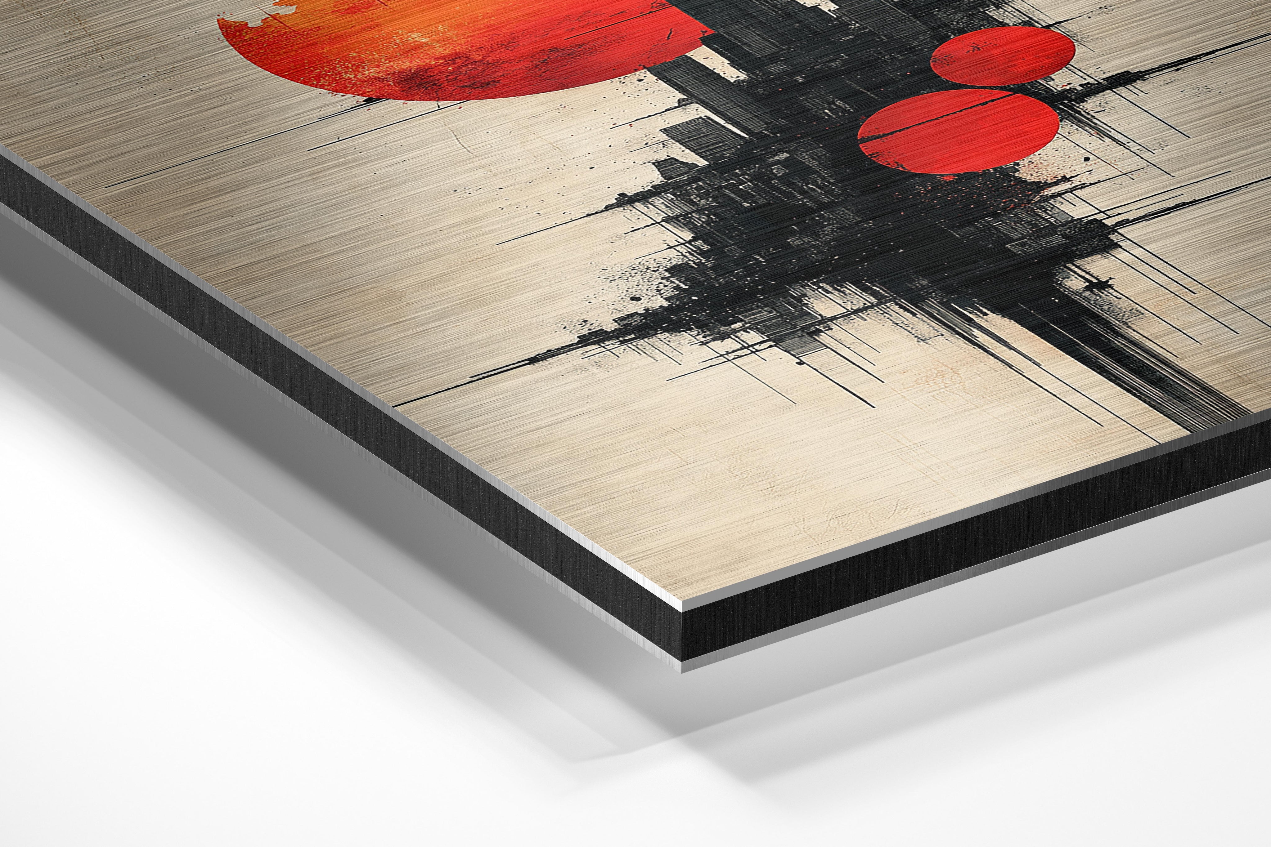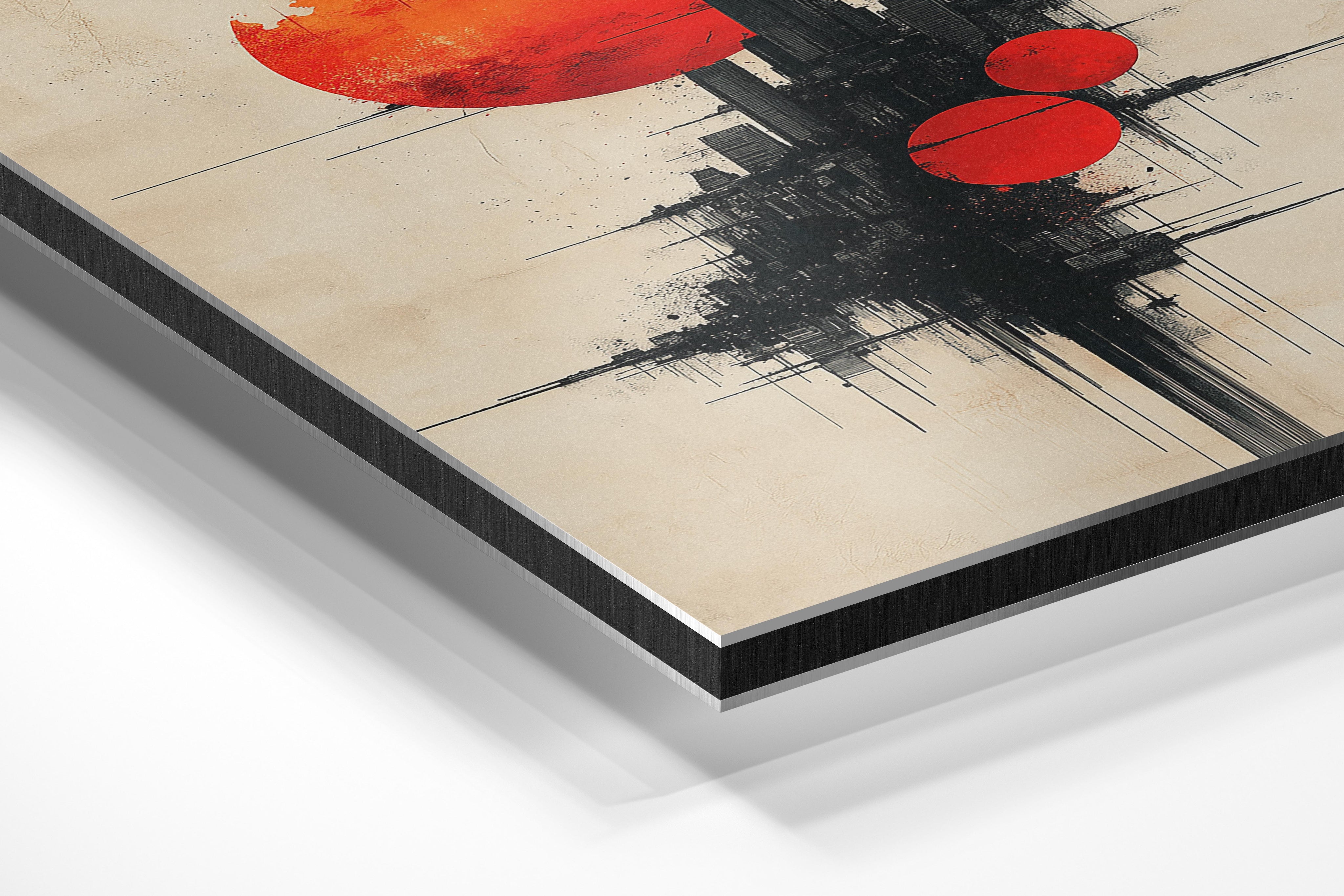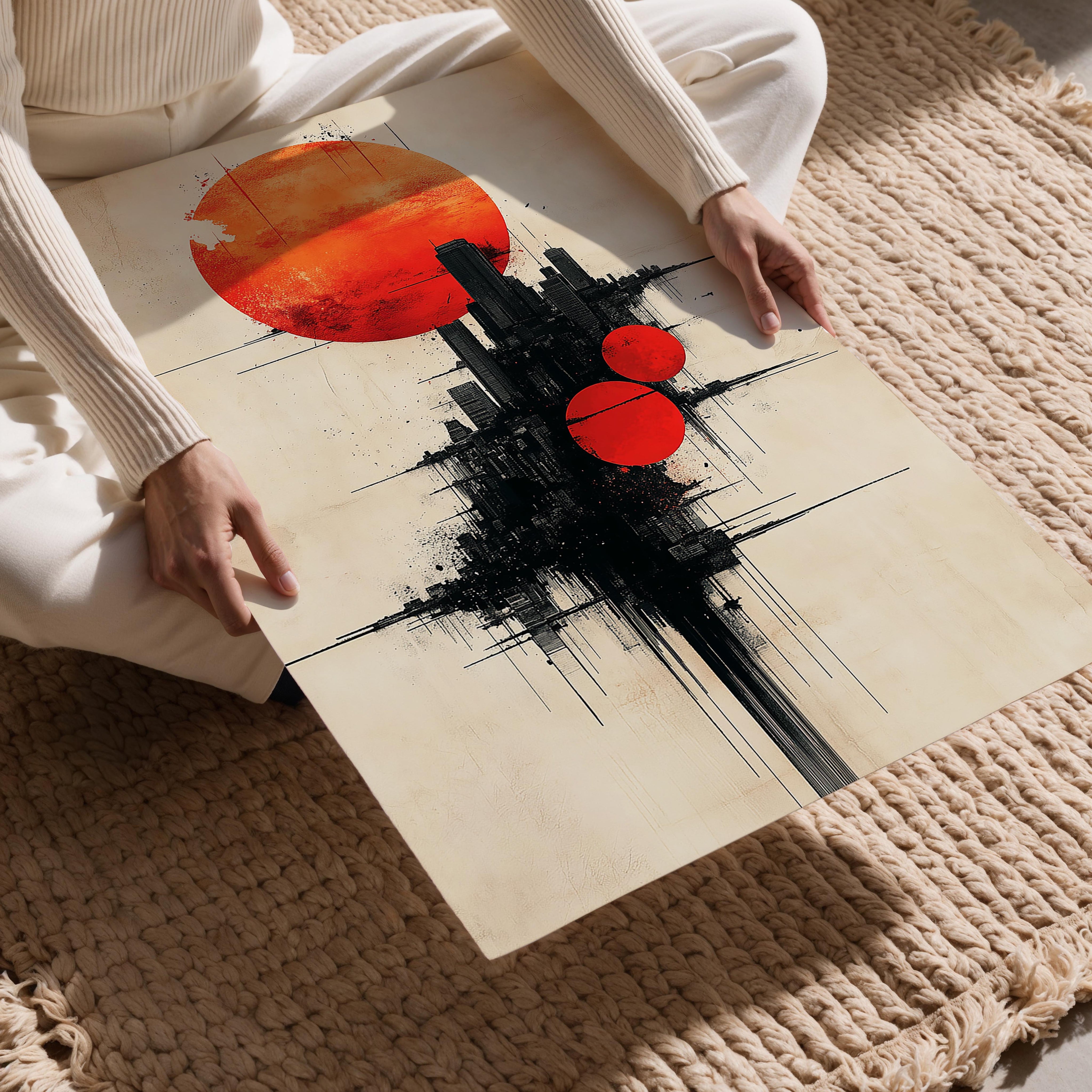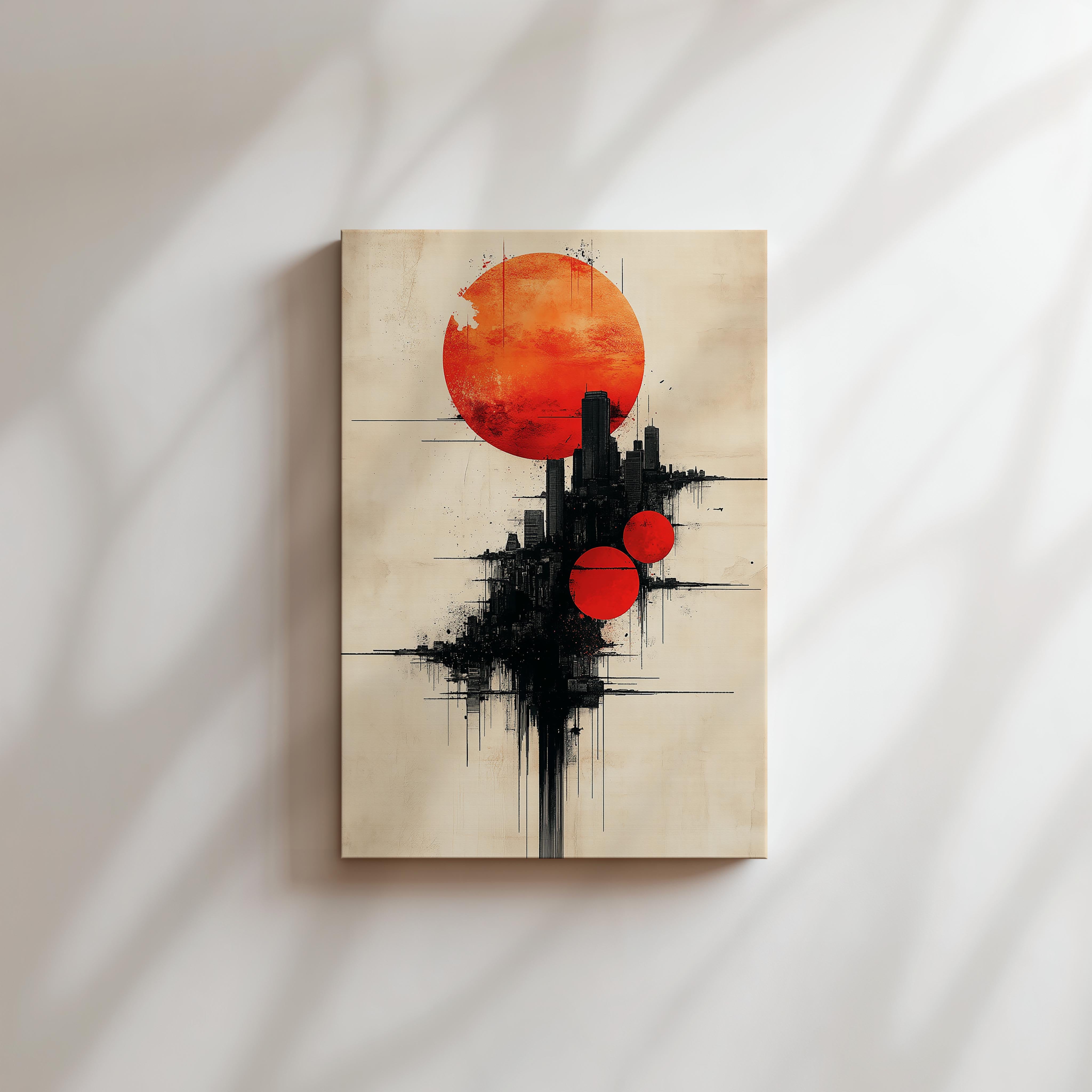 This surreal composition features multiple red celestial spheres juxtaposed against a modern urban skyline. The dramatic lighting and textured detail create a vibrant, otherworldly atmosphere. This piece is perfect for art lovers seeking avant-garde designs that make a statement. Its captivating energy enhances spaces like creative studios, bold living rooms, or modern offices, inviting conversation and admiration.