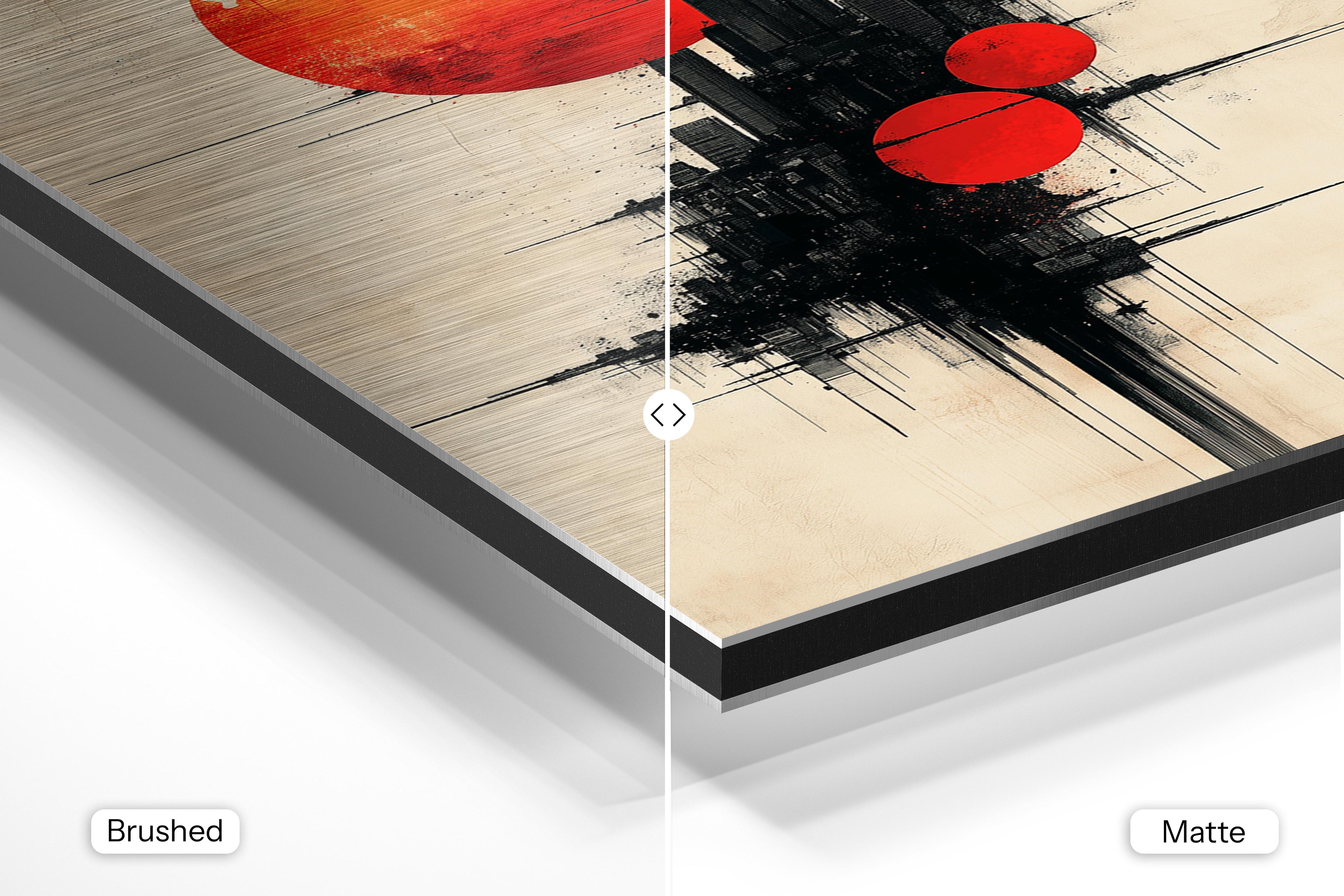 - Brushed Aluminum, on the other hand, features a raw metallic texture with visible brush strokes. Whites and highlights in your image let the silver surface show through, adding a dramatic, shimmering effect. Ideal for black-and-white images, minimalist designs, or abstract art, it creates a bold, industrial vibe with a modern edge.