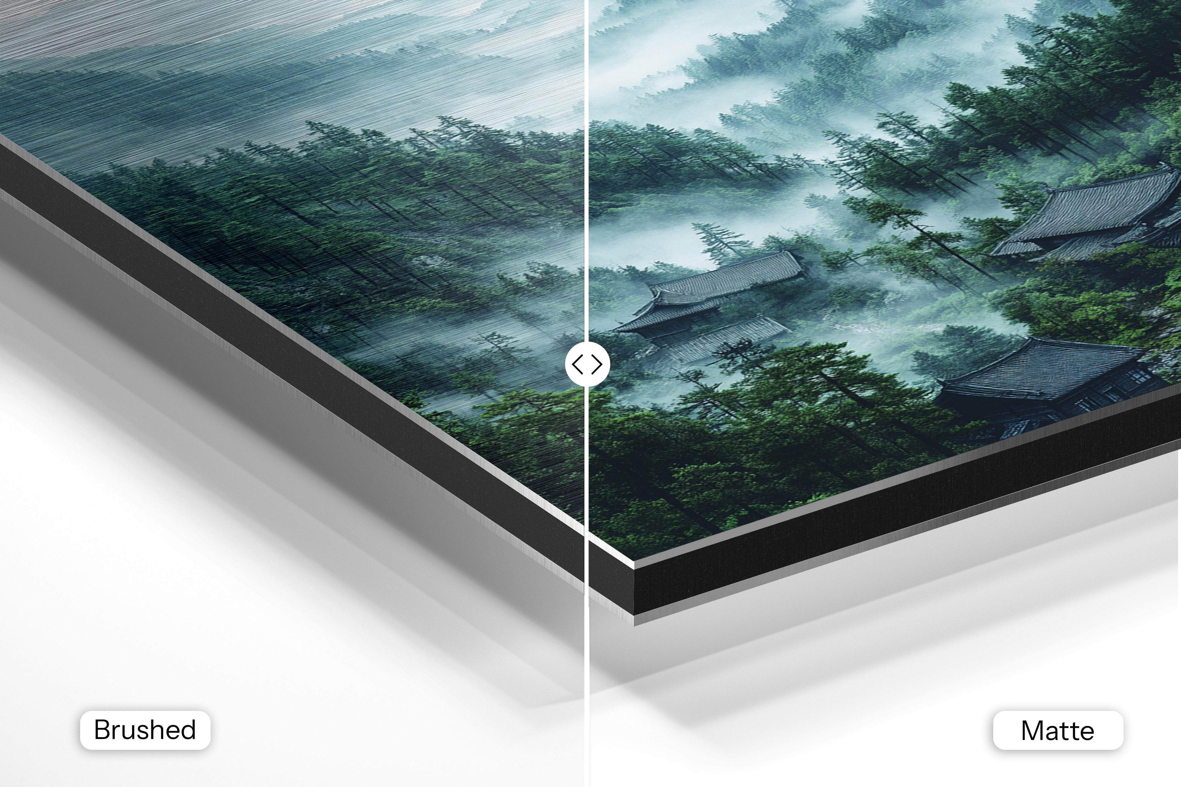 - Brushed Aluminum, on the other hand, features a raw metallic texture with visible brush strokes. Whites and highlights in your image let the silver surface show through, adding a dramatic, shimmering effect. Ideal for black-and-white images, minimalist designs, or abstract art, it creates a bold, industrial vibe with a modern edge.