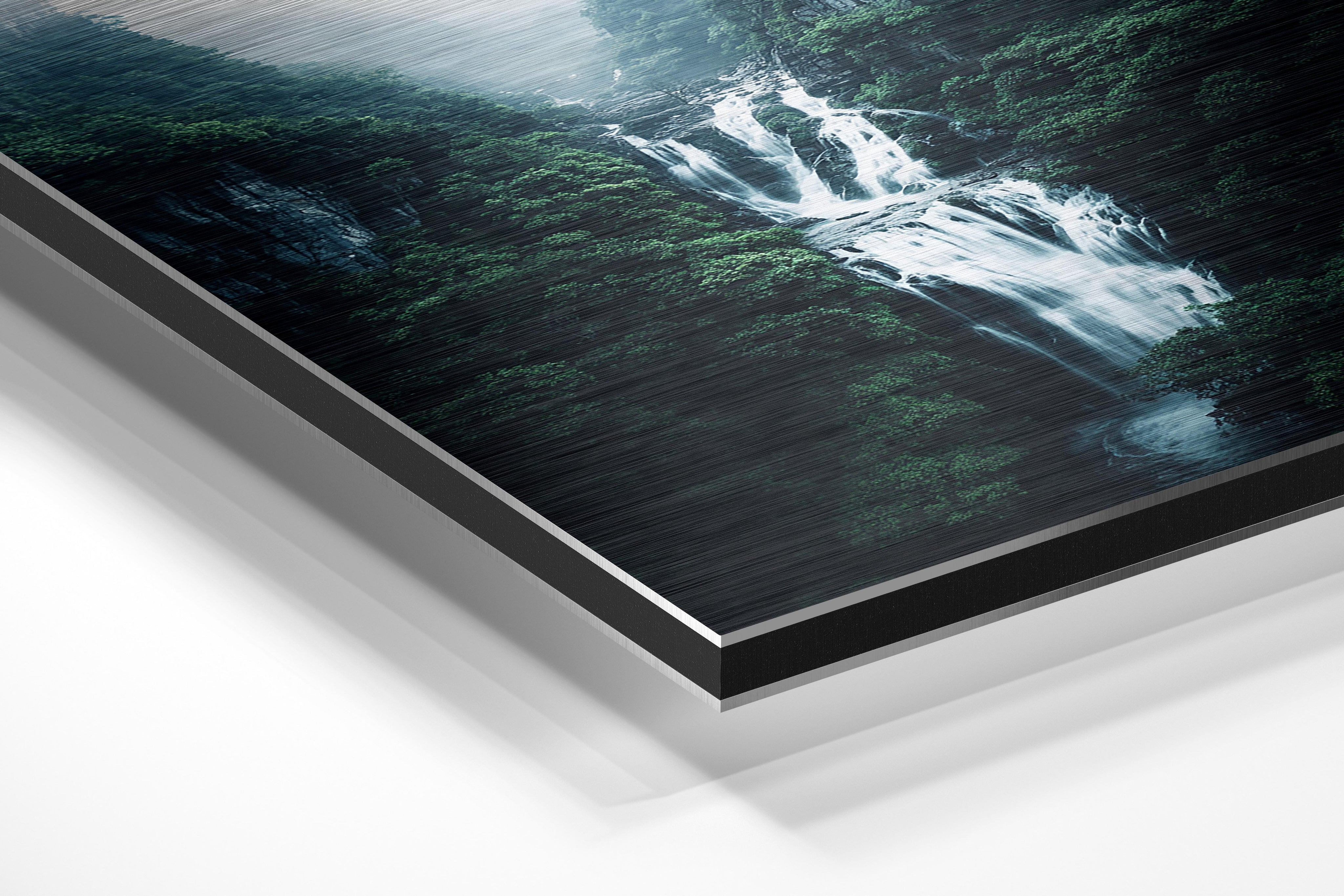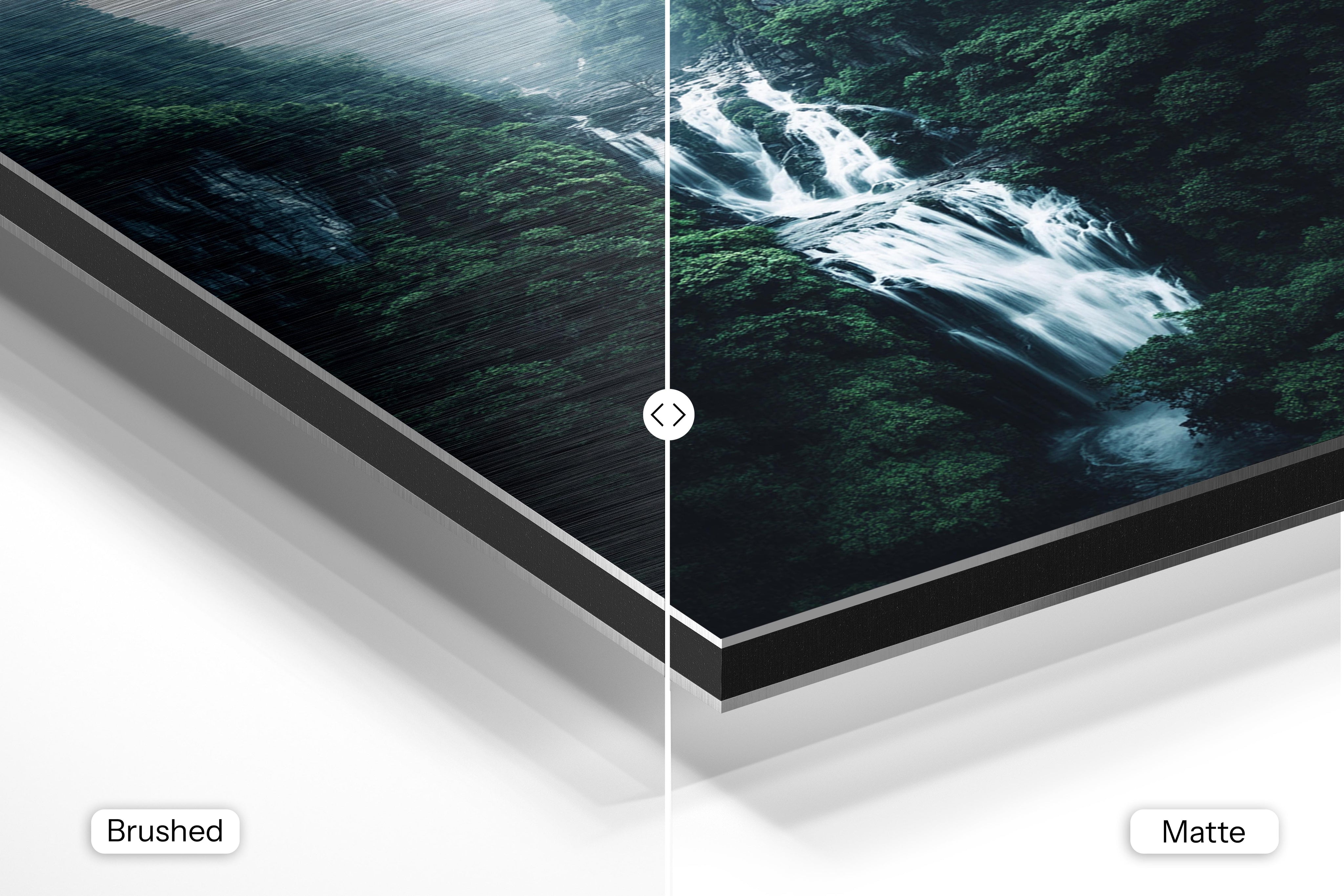 - Brushed Aluminum, on the other hand, features a raw metallic texture with visible brush strokes. Whites and highlights in your image let the silver surface show through, adding a dramatic, shimmering effect. Ideal for black-and-white images, minimalist designs, or abstract art, it creates a bold, industrial vibe with a modern edge.