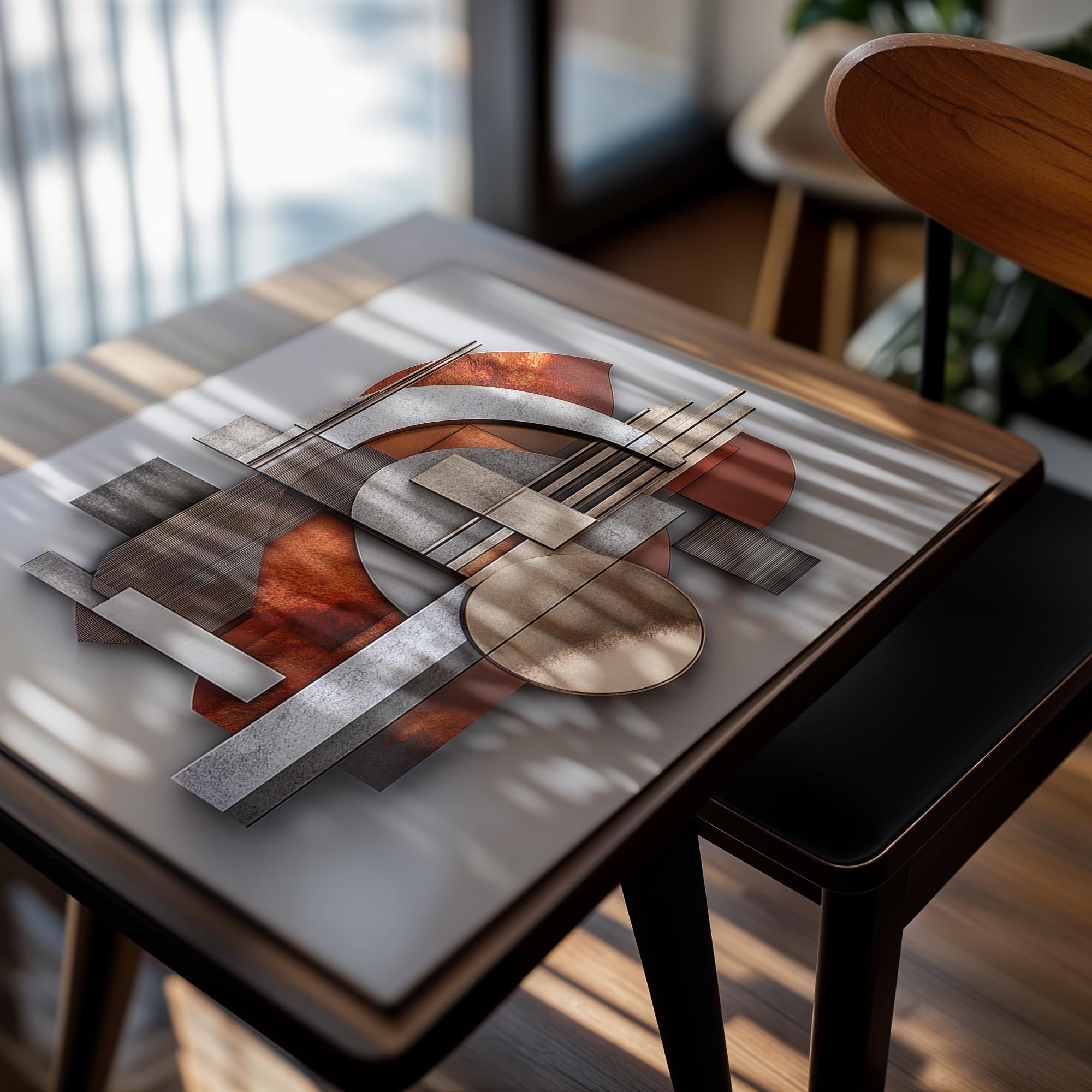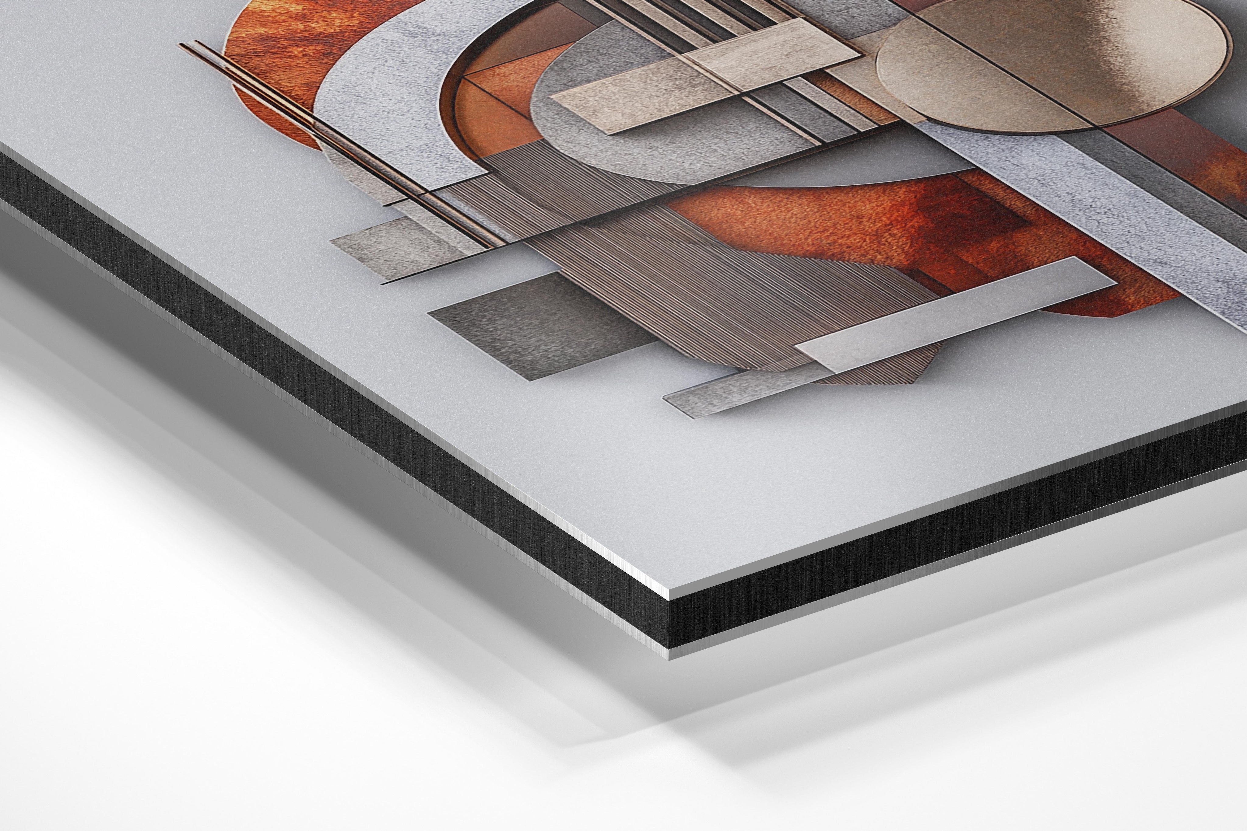 A stunning geometric composition blending metallic textures with bold orange and gray accents. This contemporary piece enhances spaces with an artistic and industrial flair, making it a great fit for modern living areas or studios.