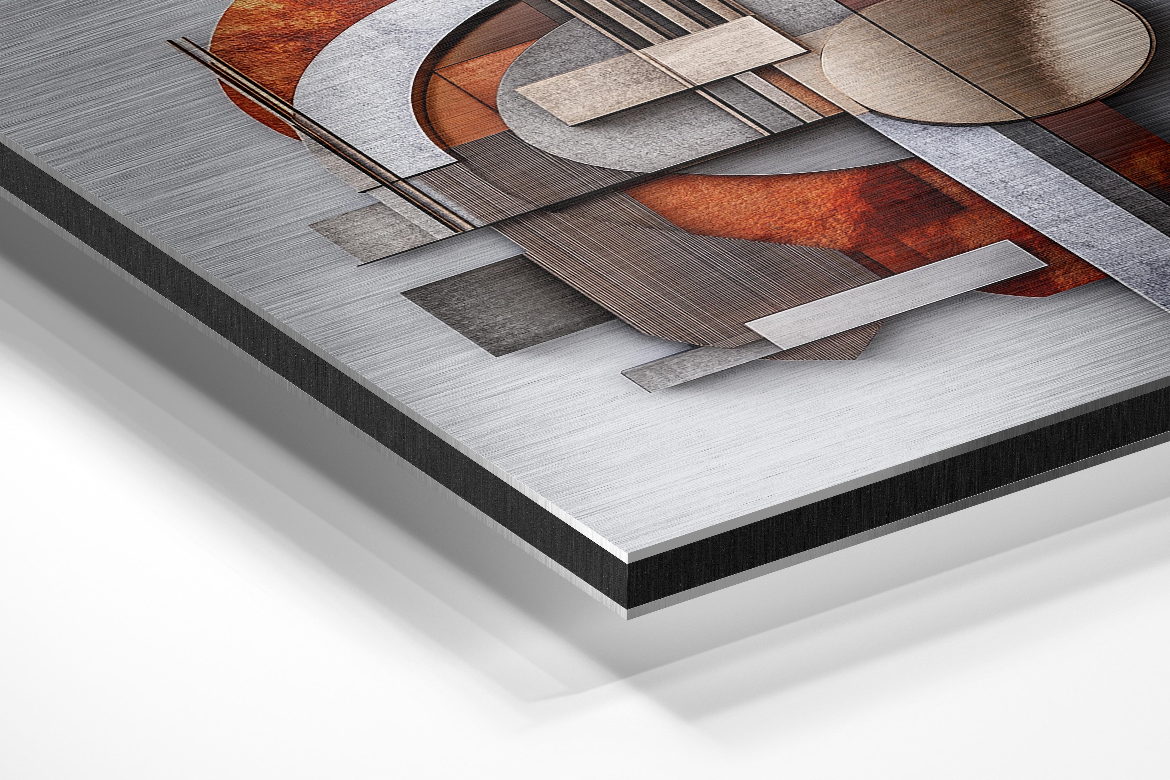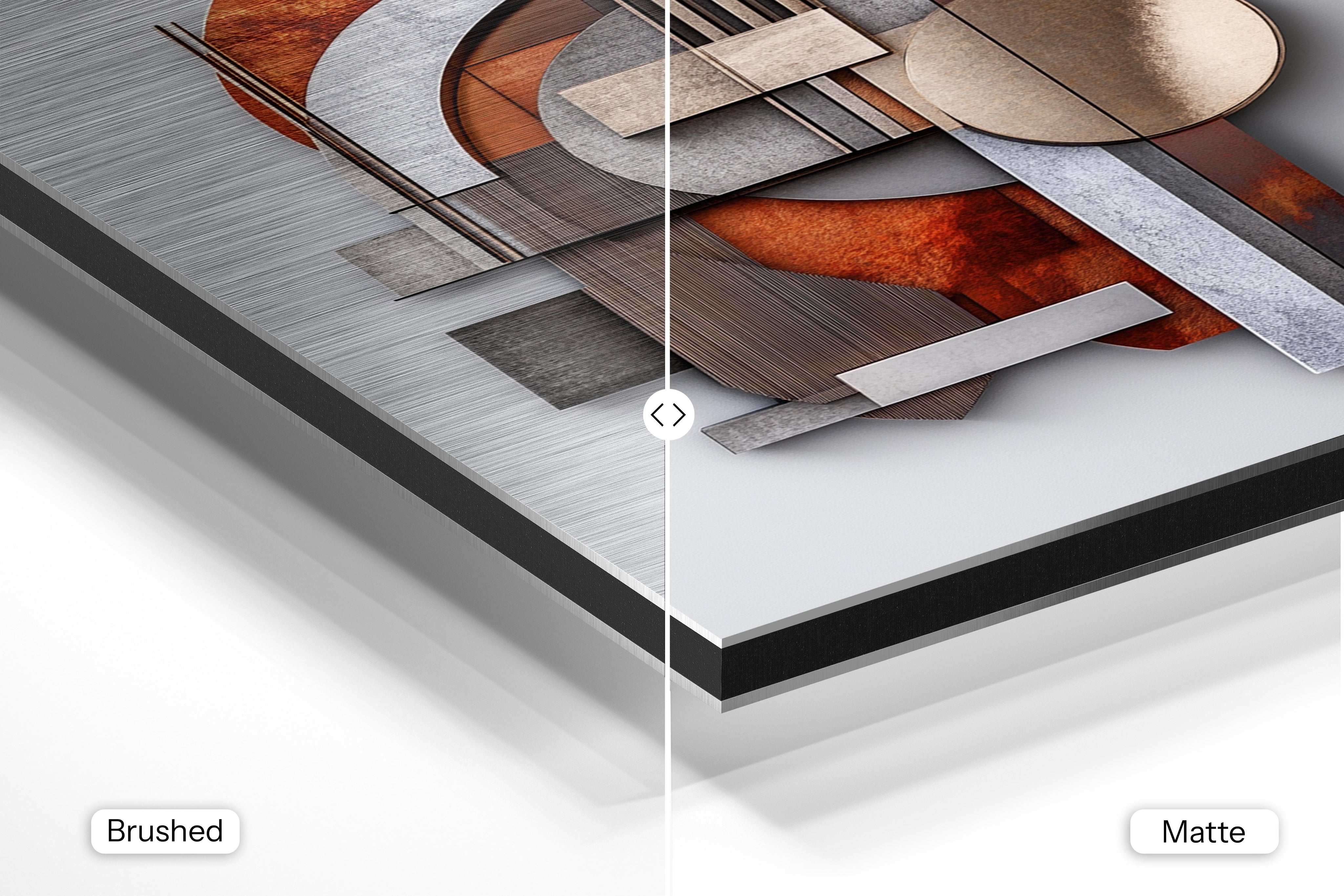 - Brushed Aluminum, on the other hand, features a raw metallic texture with visible brush strokes. Whites and highlights in your image let the silver surface show through, adding a dramatic, shimmering effect. Ideal for black-and-white images, minimalist designs, or abstract art, it creates a bold, industrial vibe with a modern edge.