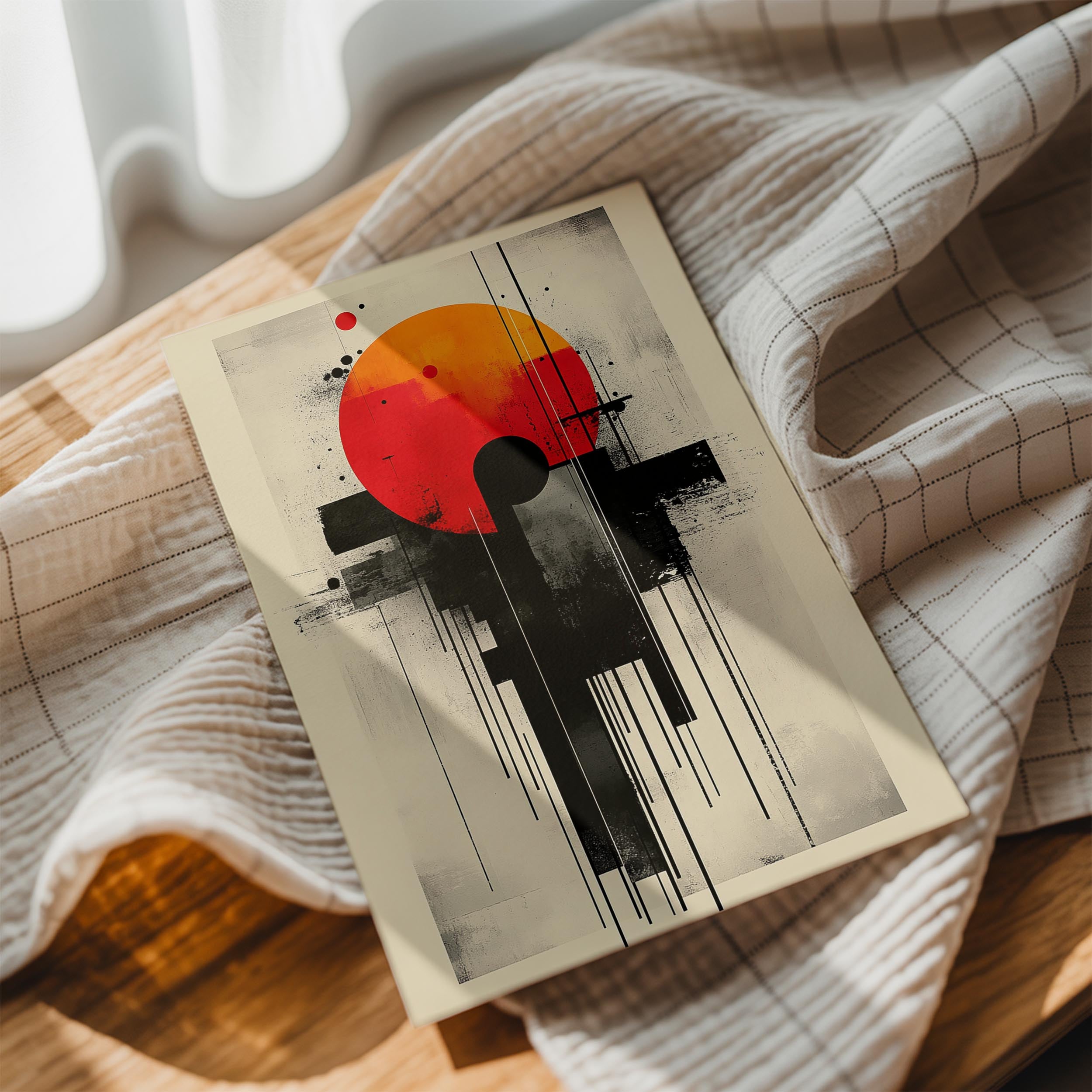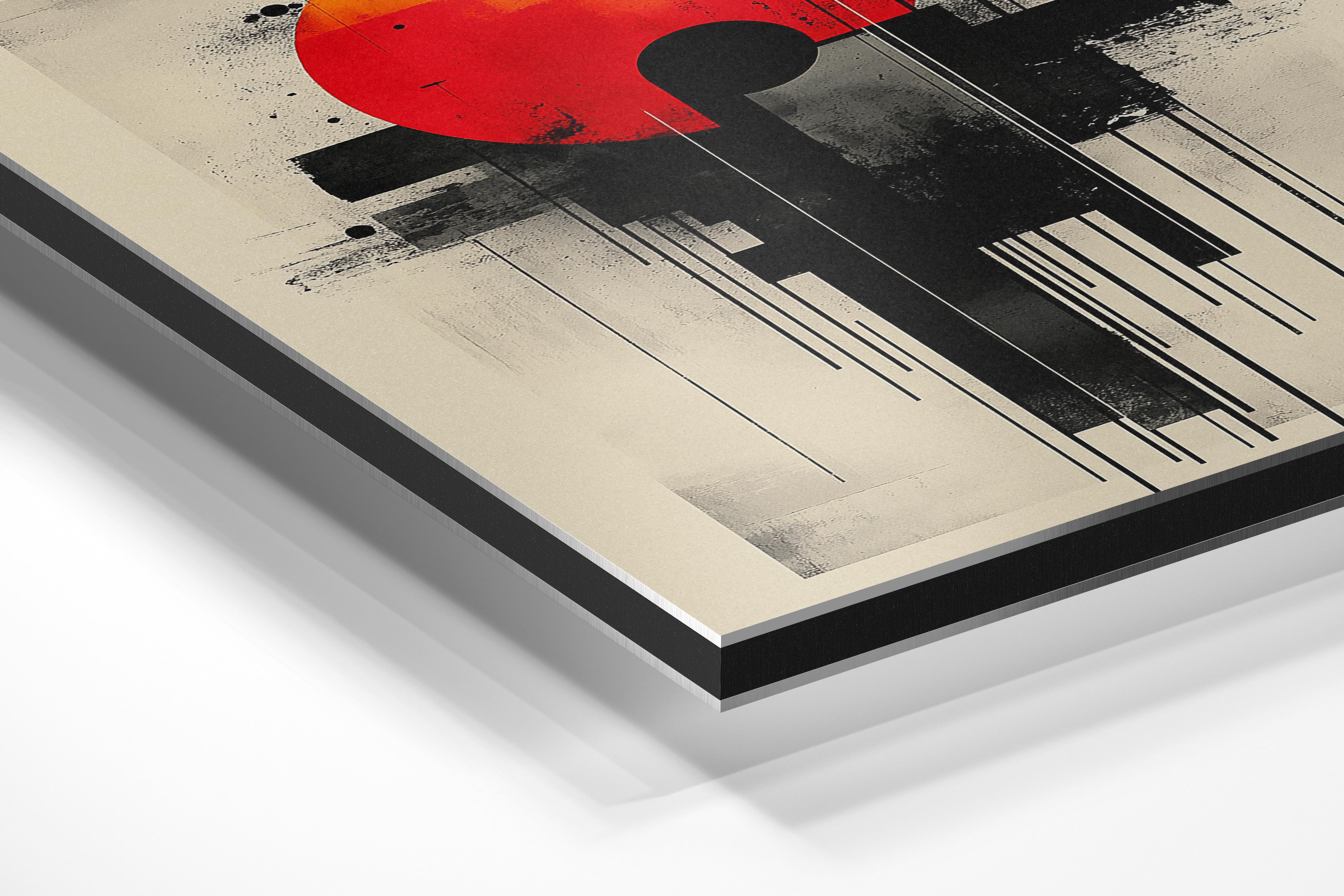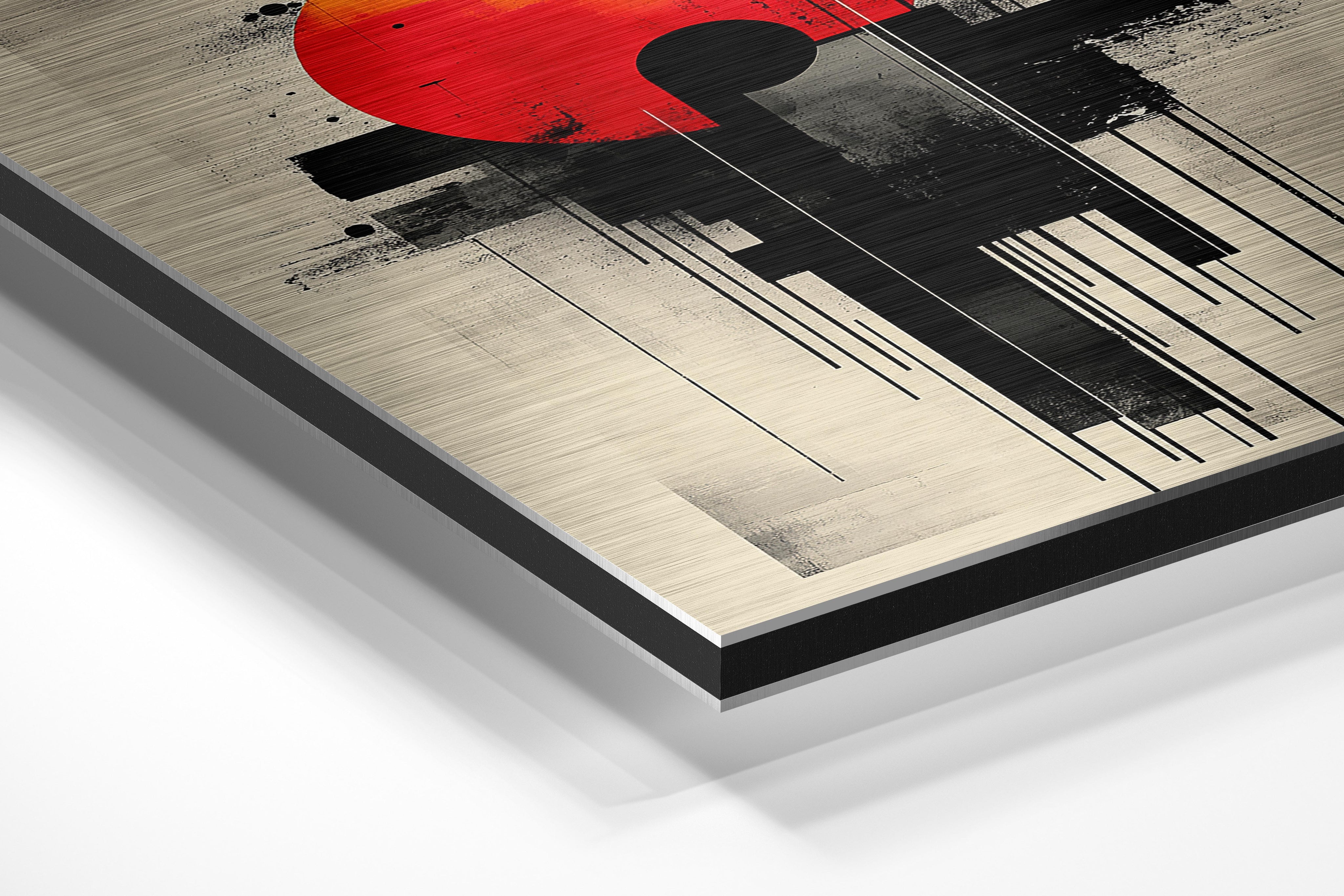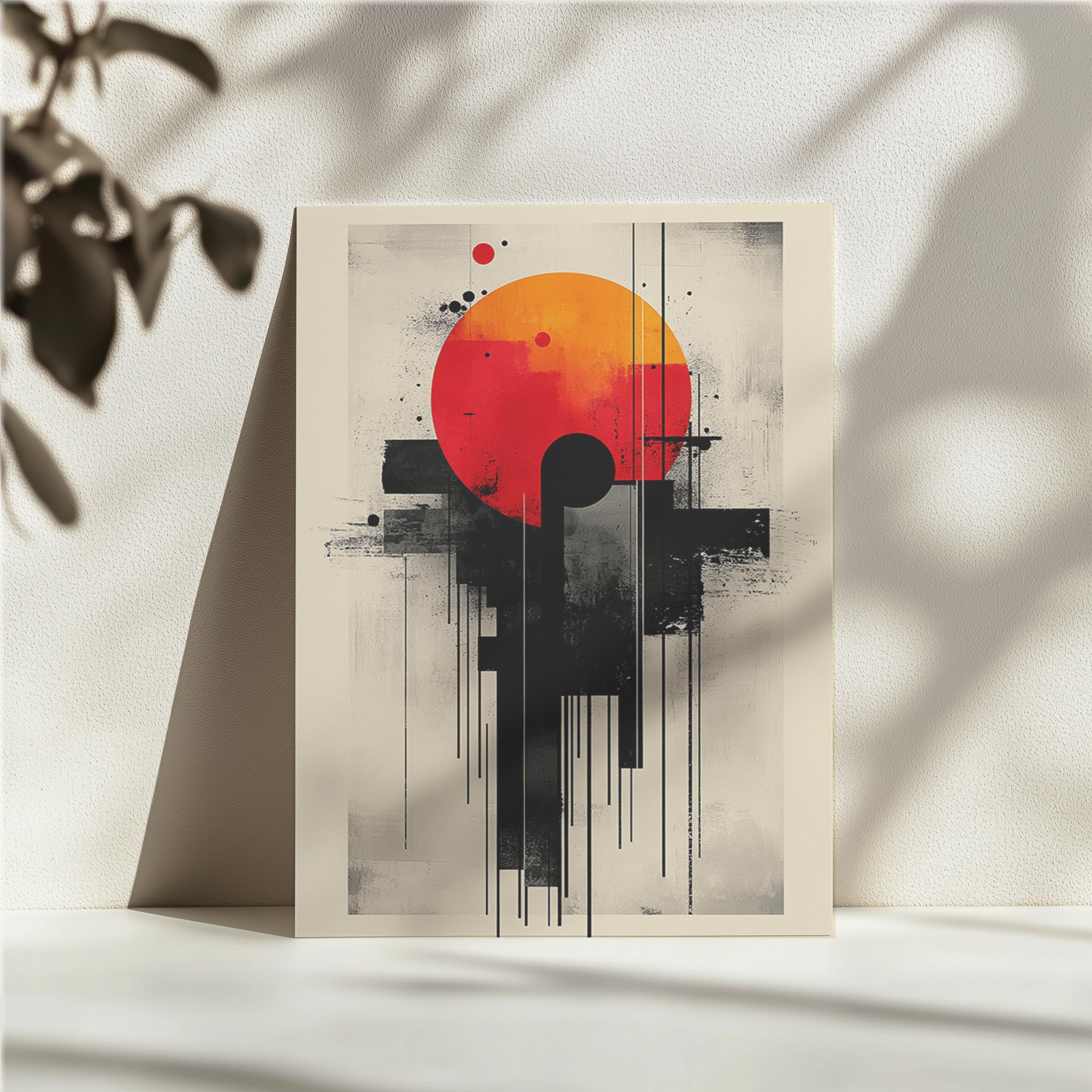 This abstract artwork is dominated by a bright orange sun framed within a modern, industrial composition. Black vertical lines and scattered dots form a balanced, yet edgy contrast to the warmth of the sun. The minimalist design lends itself well to contemporary interiors, adding an artistic focal point to offices, lounges, or galleries. Its deliberate use of negative space emphasizes its modern aesthetic, while the bold hues ensure it stands out. This piece offers a statement of creativity and individuality, making it ideal for art enthusiasts or design-forward spaces.