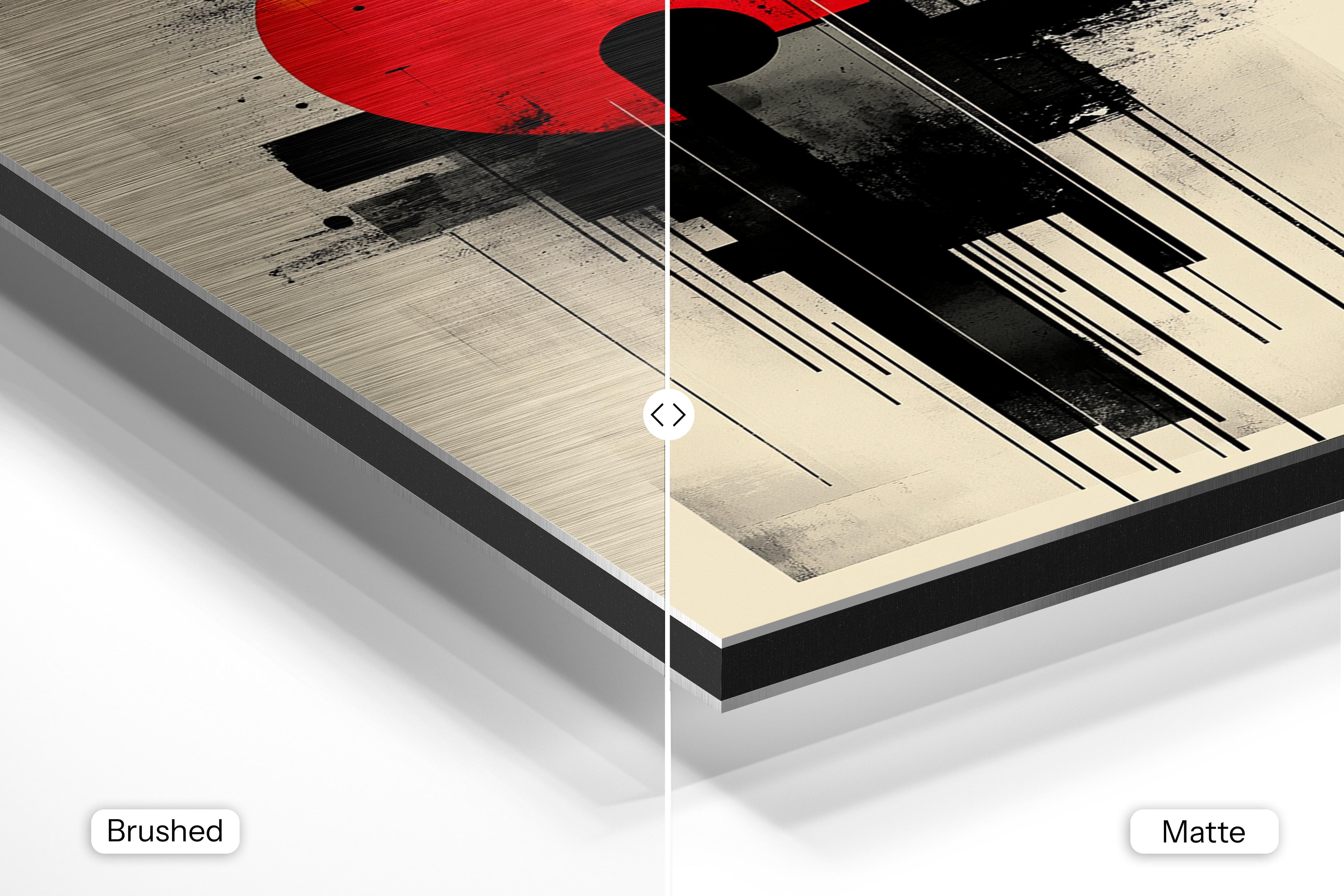- Brushed Aluminum, on the other hand, features a raw metallic texture with visible brush strokes. Whites and highlights in your image let the silver surface show through, adding a dramatic, shimmering effect. Ideal for black-and-white images, minimalist designs, or abstract art, it creates a bold, industrial vibe with a modern edge.