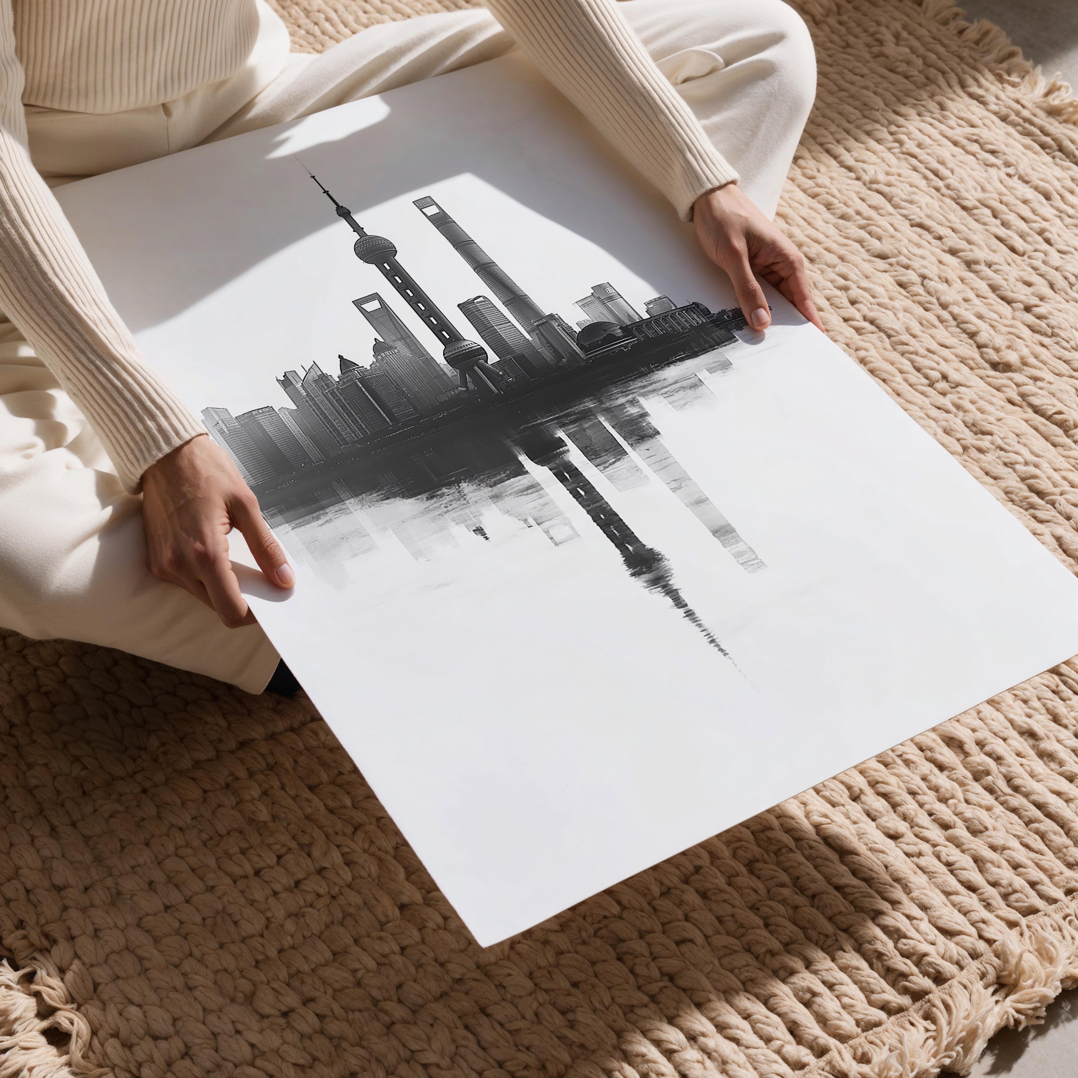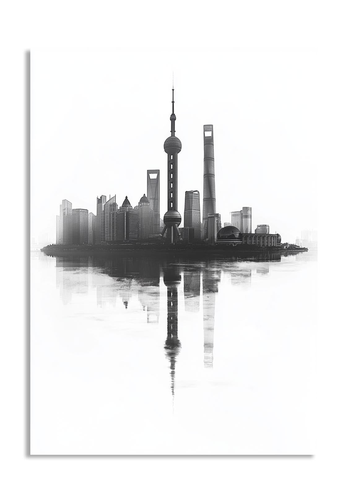 A striking monochrome depiction of Shanghai’s iconic skyline, showcasing its architectural brilliance and reflective waters. The high contrast and clean lines emphasize the city’s modernity and sophistication. Ideal for urban art enthusiasts or contemporary spaces, this artwork brings a sense of balance and refinement to interiors. Its minimalist palette makes it versatile for various decor styles, from offices to living rooms.