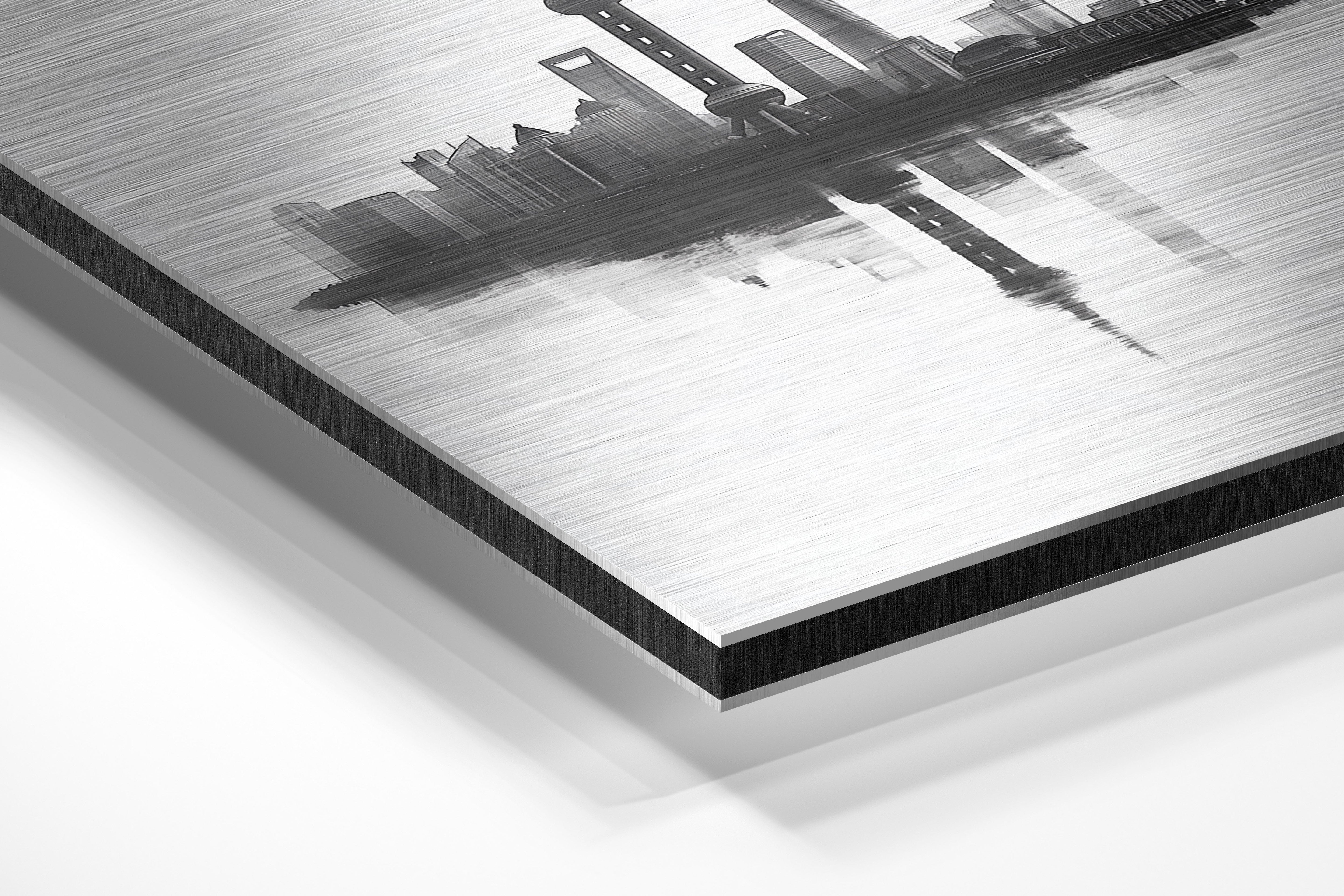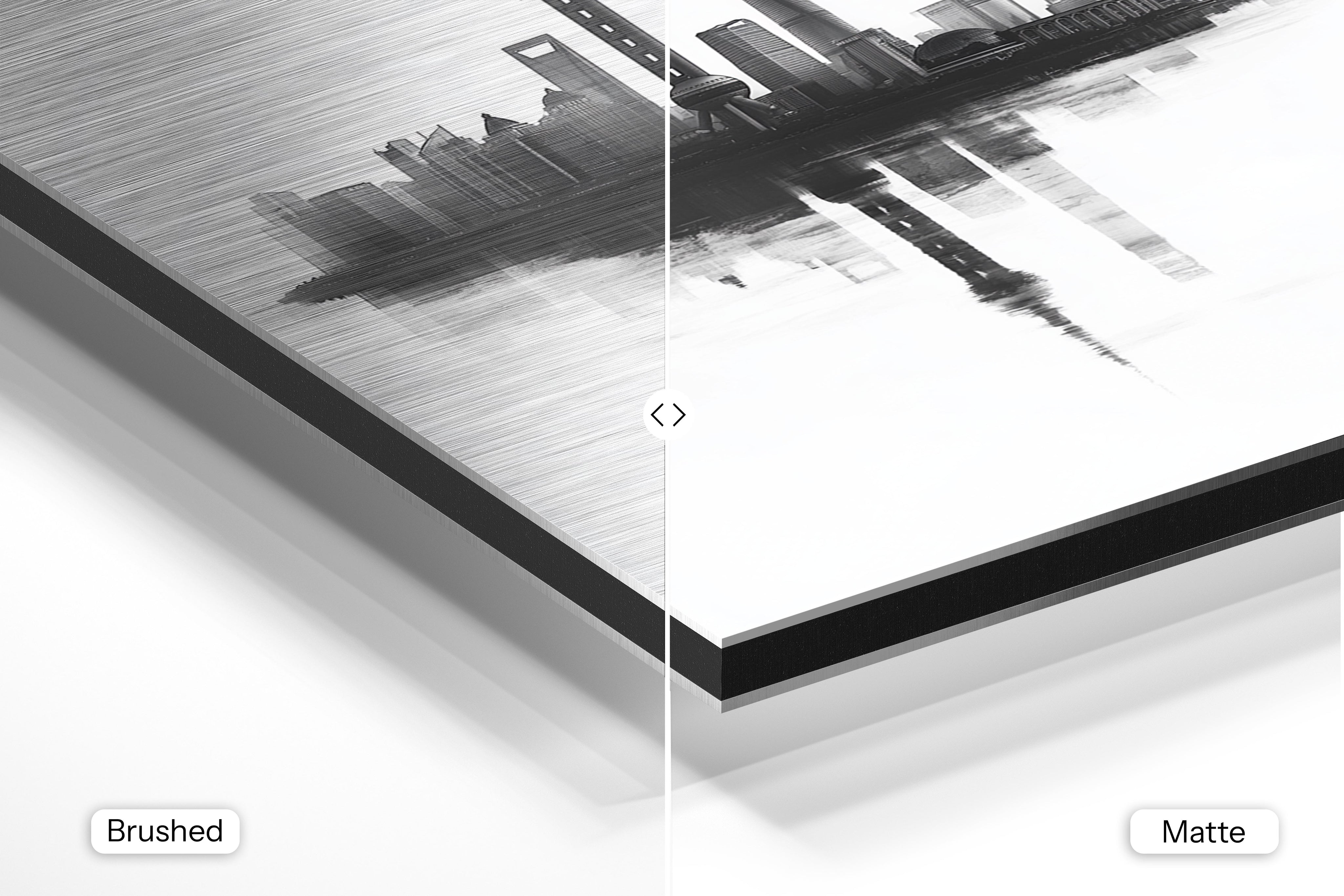 - Brushed Aluminum, on the other hand, features a raw metallic texture with visible brush strokes. Whites and highlights in your image let the silver surface show through, adding a dramatic, shimmering effect. Ideal for black-and-white images, minimalist designs, or abstract art, it creates a bold, industrial vibe with a modern edge.