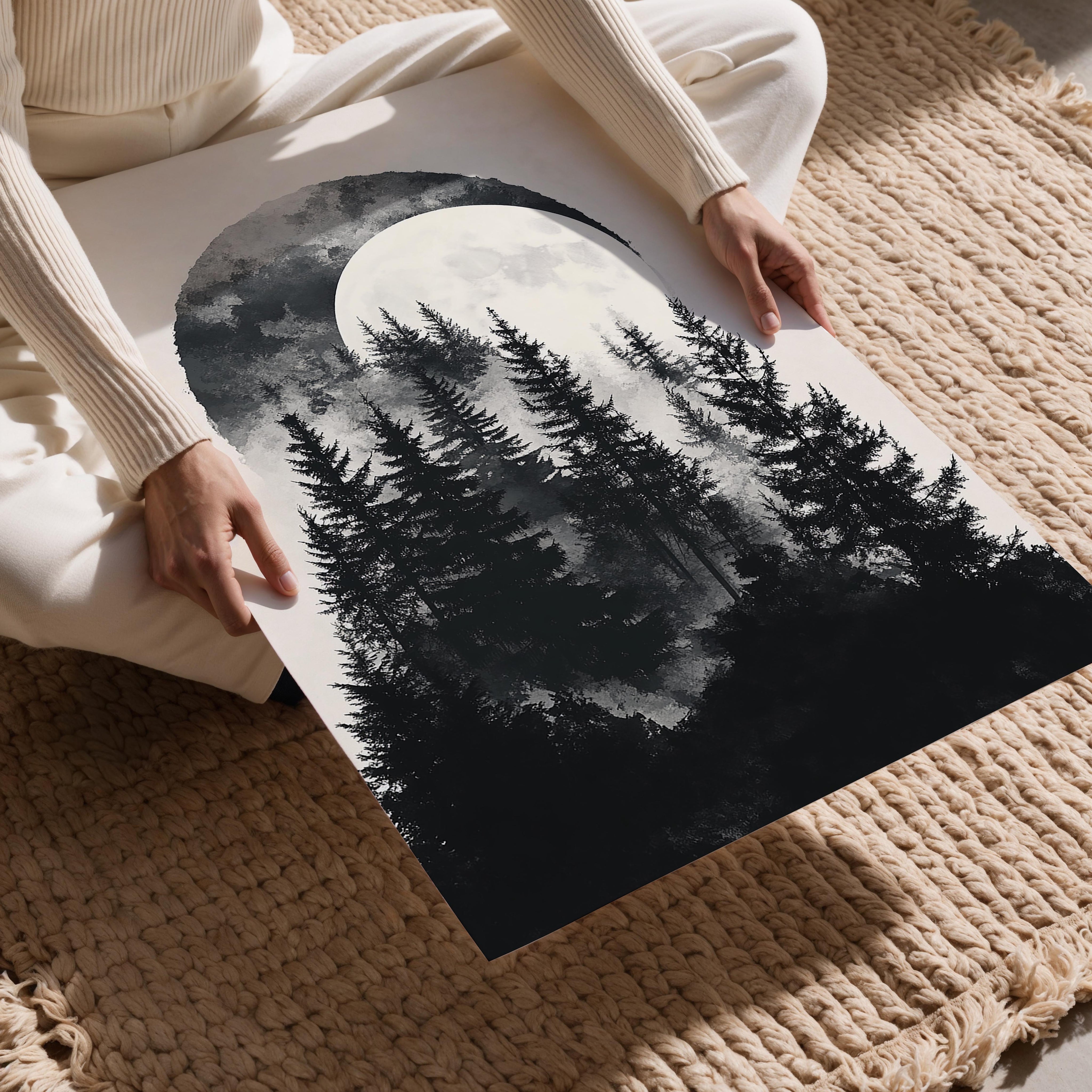 This captivating image features a moonlit forest with intricate shadows cast by tall trees. The interplay of light and darkness creates a mystical and enchanting atmosphere, perfect for evoking the allure of nocturnal landscapes.