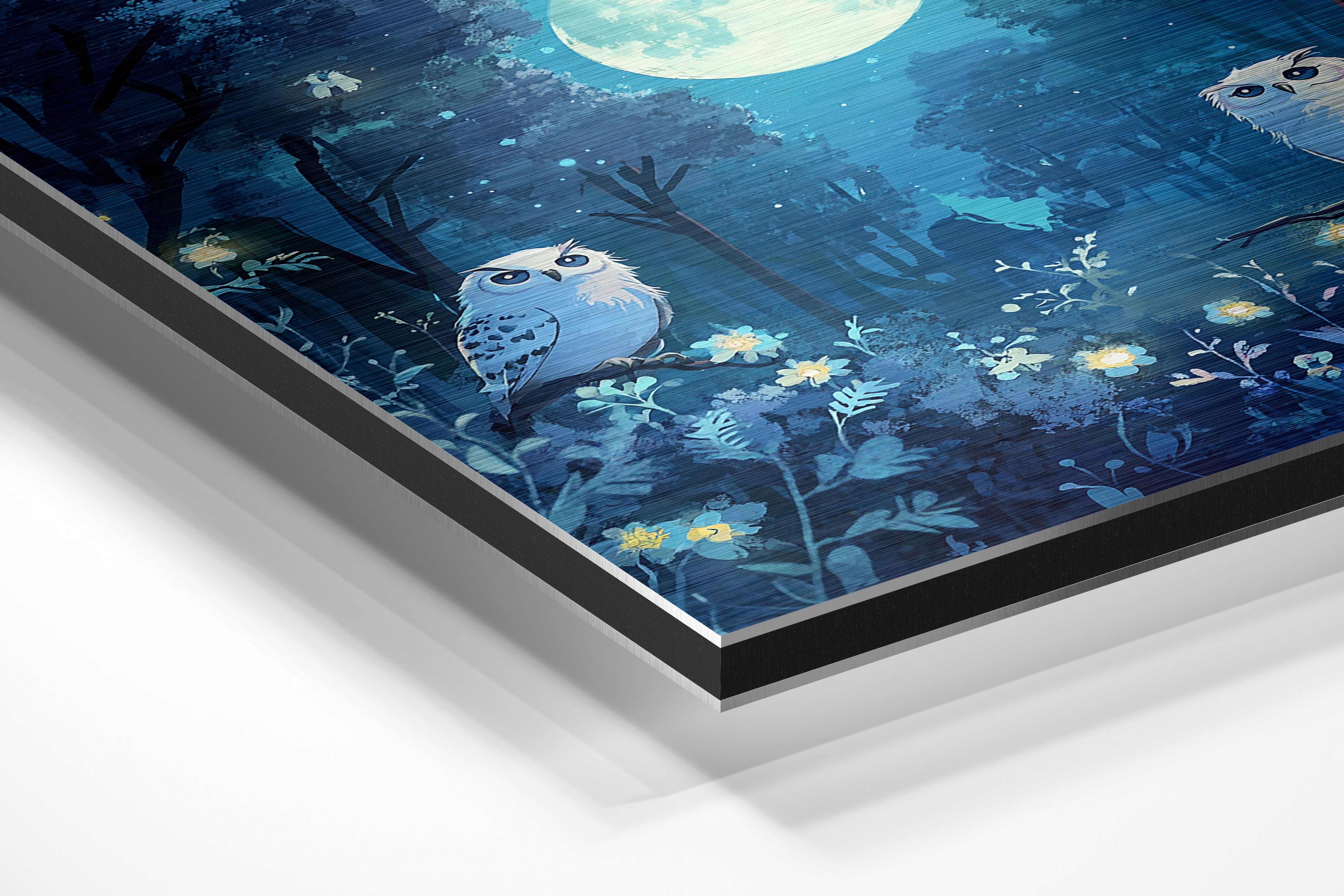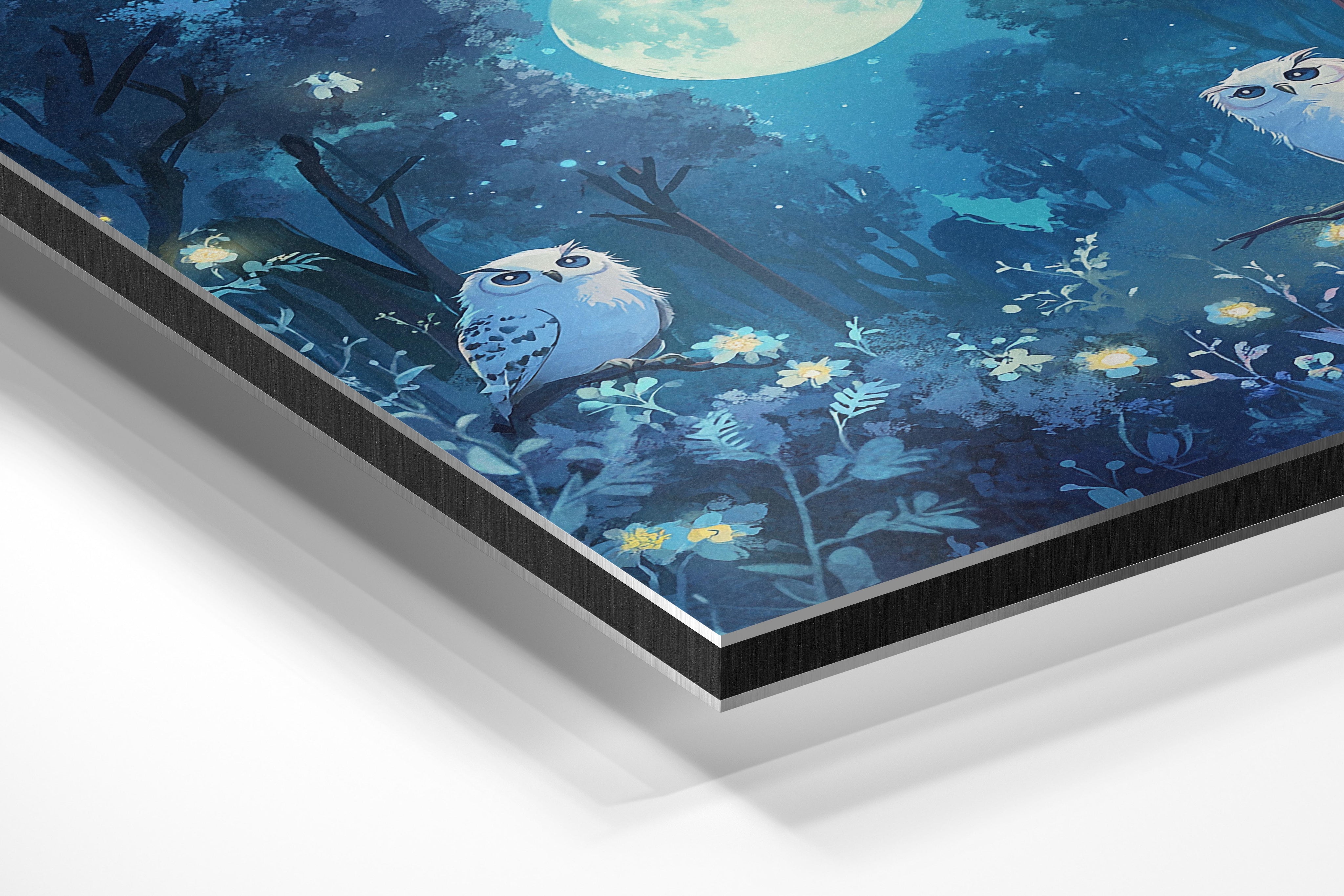 A serene night scene featuring two snowy owls perched on branches under a glowing full moon. The deep blues and soft white accents create a calming, mysterious atmosphere. This artwork is ideal for bedrooms, studies, or anyone who loves nocturnal beauty. It evokes a sense of quiet contemplation and connection with nature.