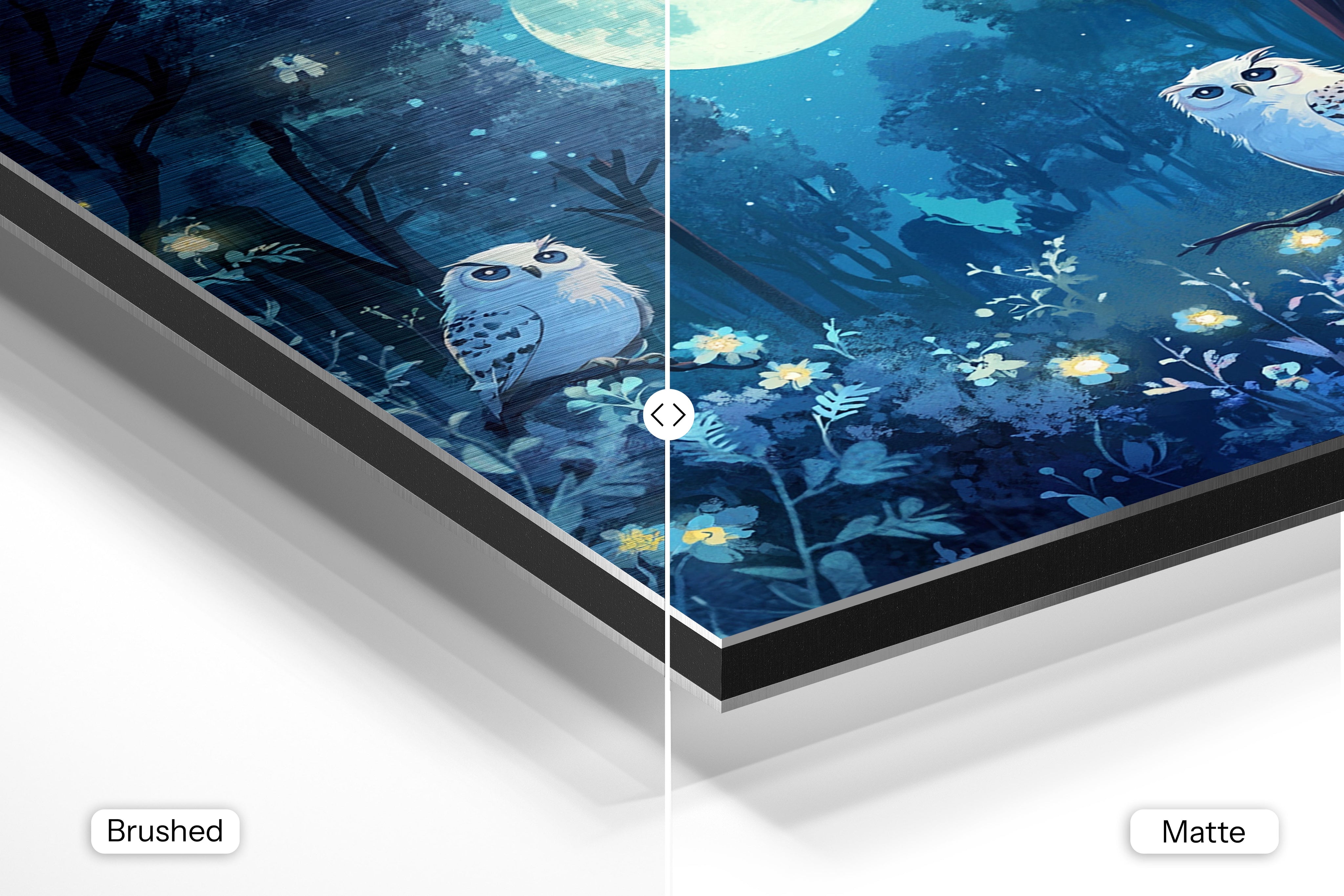 - Matte Aluminum offers a smooth, bright white surface that delivers crisp details and vibrant, true-to-life colors. With its non-reflective finish and subtle silky sheen, it’s perfect for photography, portraits, and colorful artwork—bringing a clean, polished look to any interior.