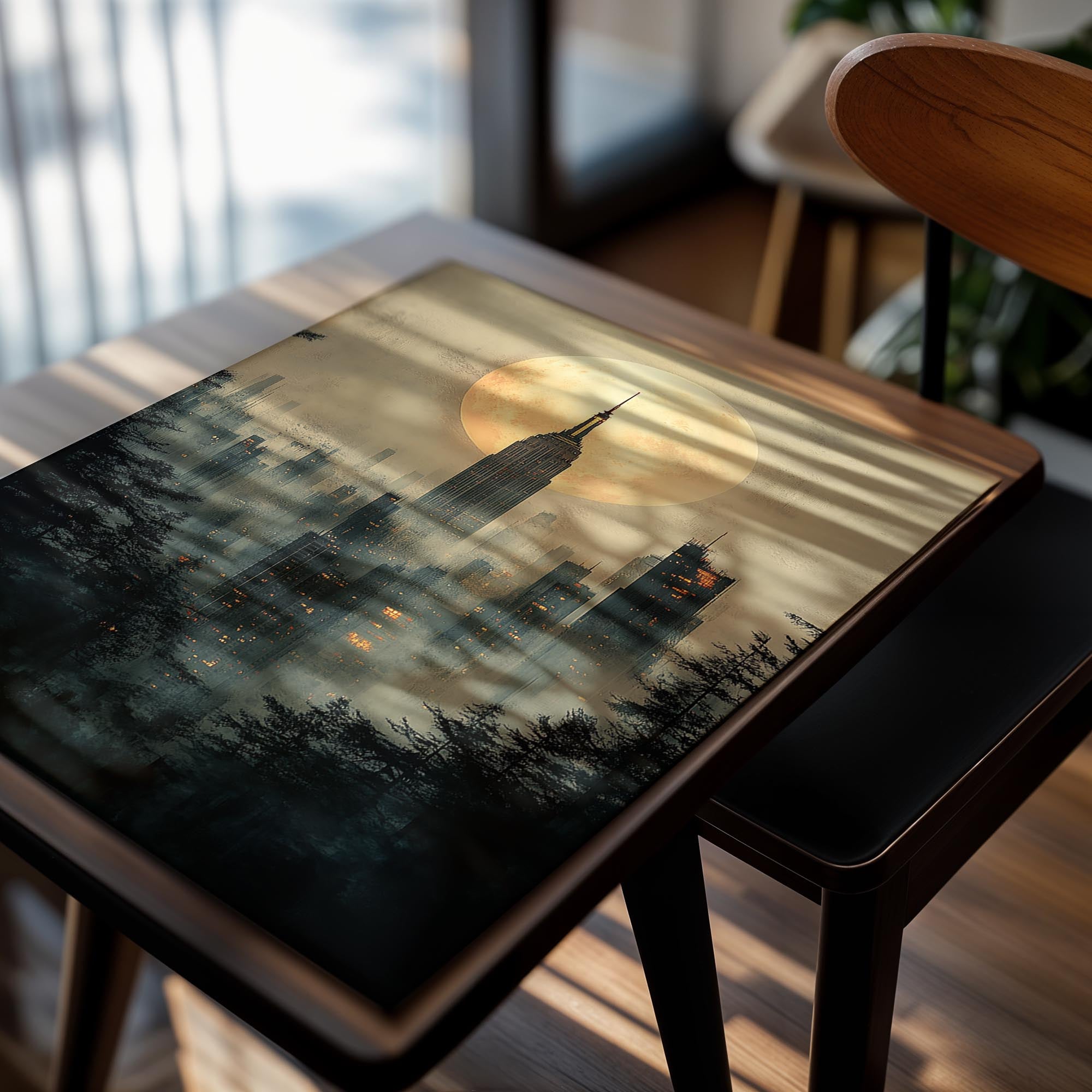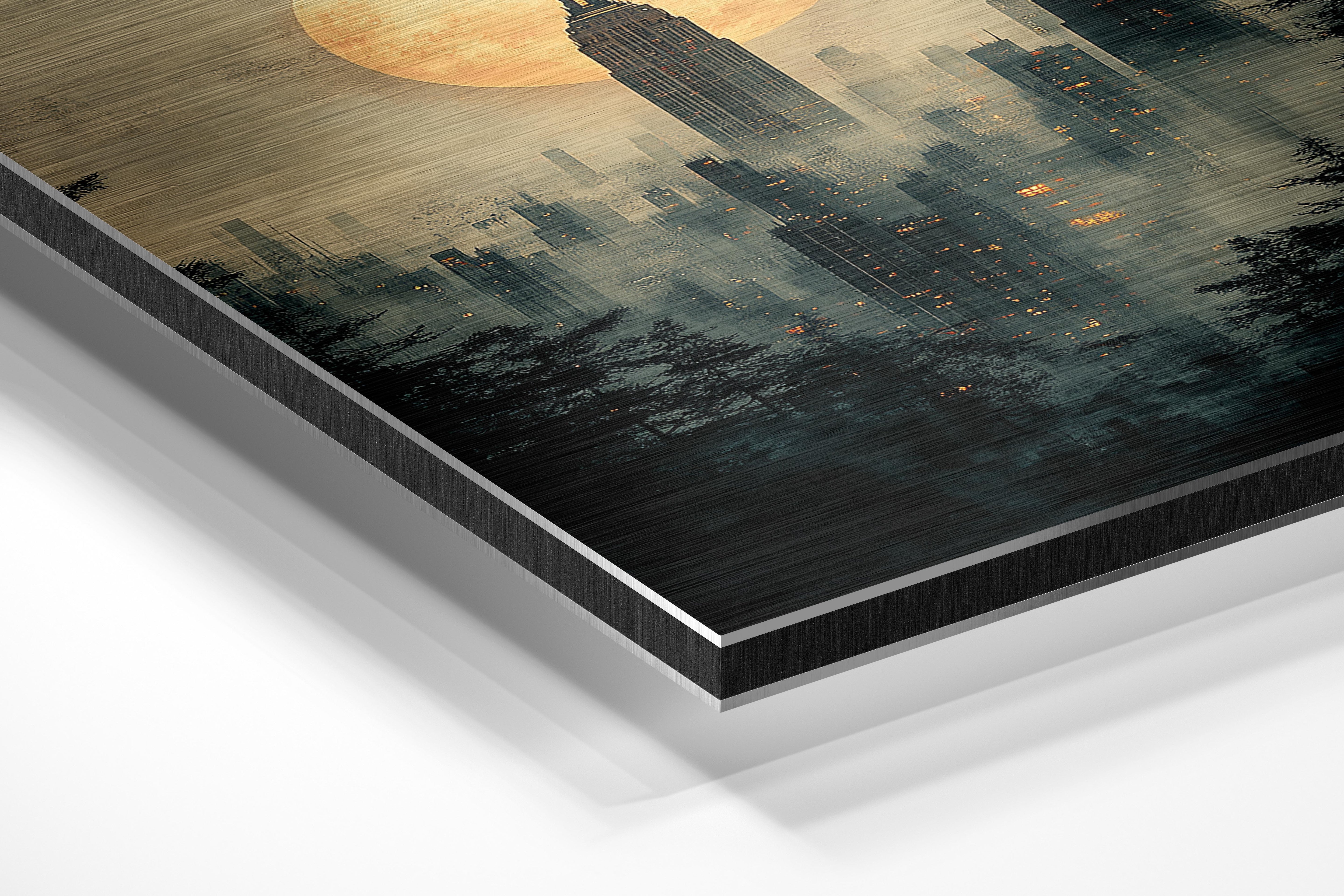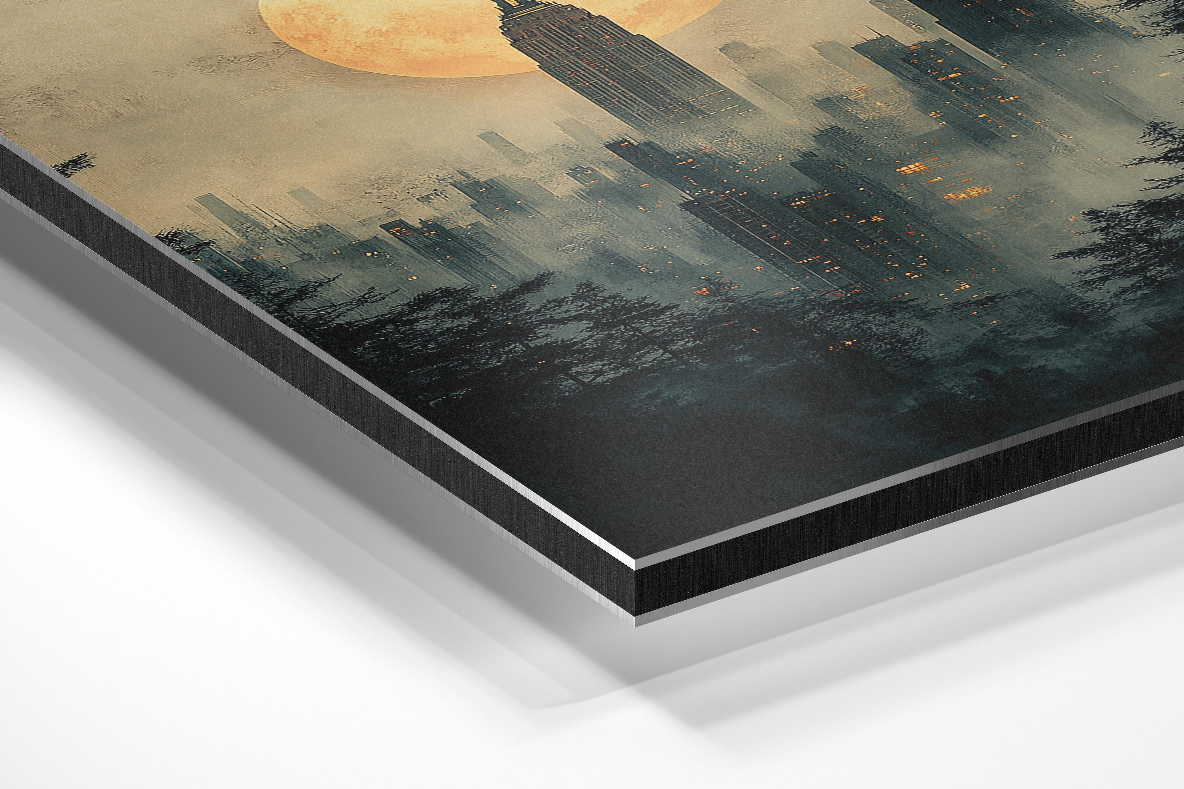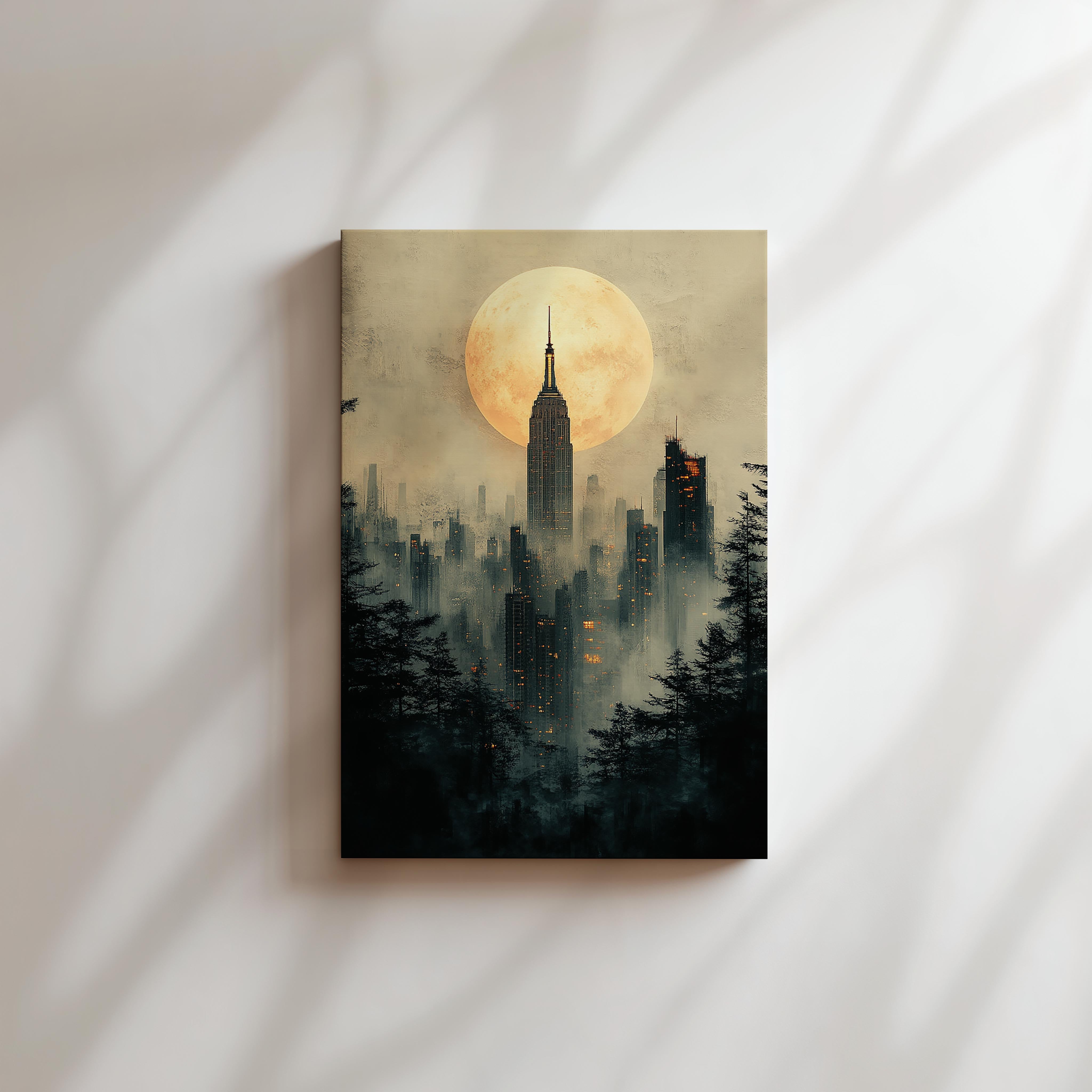 A stunningly cinematic composition of a metropolis partially reclaimed by nature, bathed in the glow of an oversized full moon. The towering skyscrapers blend into the misty forest, creating an eerie yet beautiful contrast between urban civilization and the wild unknown. The deep shadows and warm golden lights add an element of mystique, making this piece perfect for lovers of atmospheric cityscapes. It would enhance a modern loft, an art-driven workspace, or a storytelling-inspired environment, evoking the delicate balance between nature and technology.