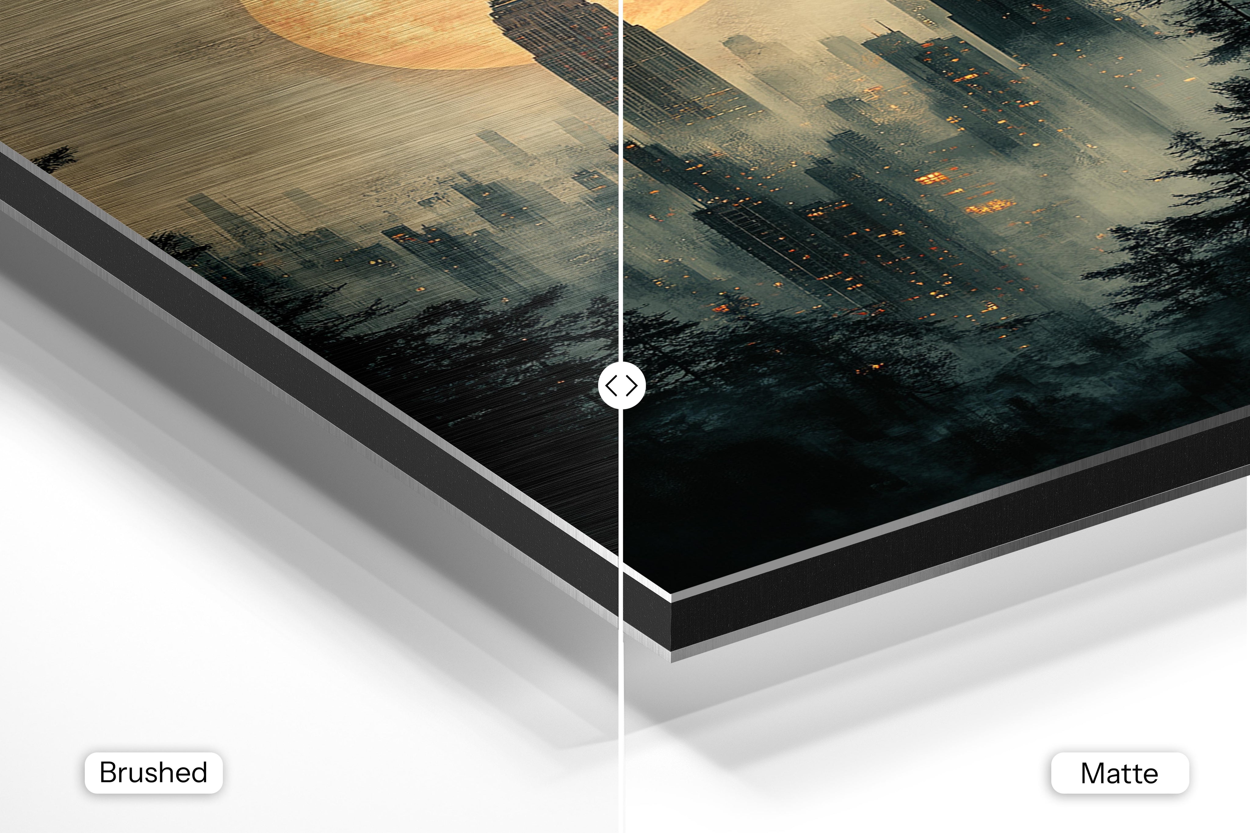 - Brushed Aluminum, on the other hand, features a raw metallic texture with visible brush strokes. Whites and highlights in your image let the silver surface show through, adding a dramatic, shimmering effect. Ideal for black-and-white images, minimalist designs, or abstract art, it creates a bold, industrial vibe with a modern edge.