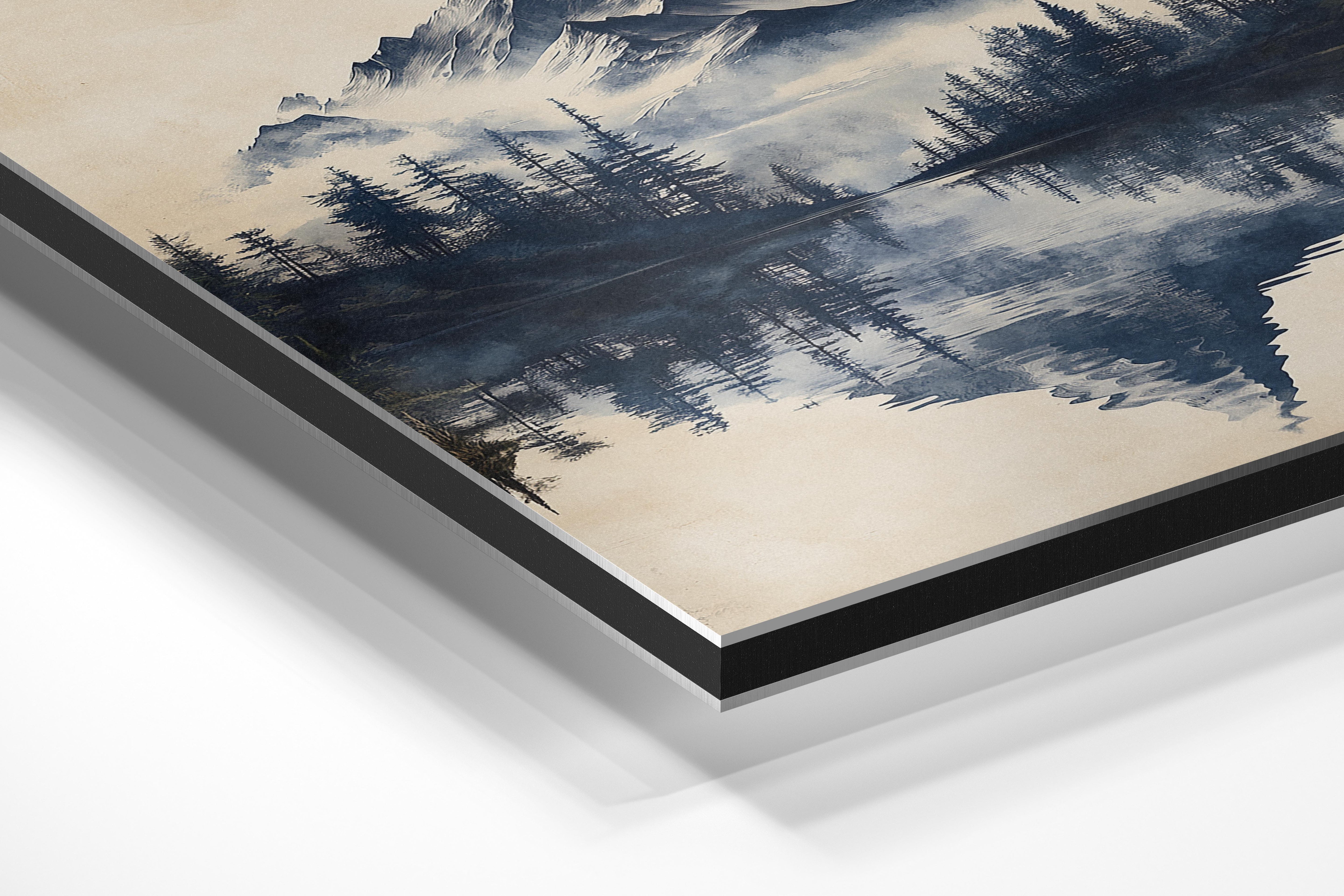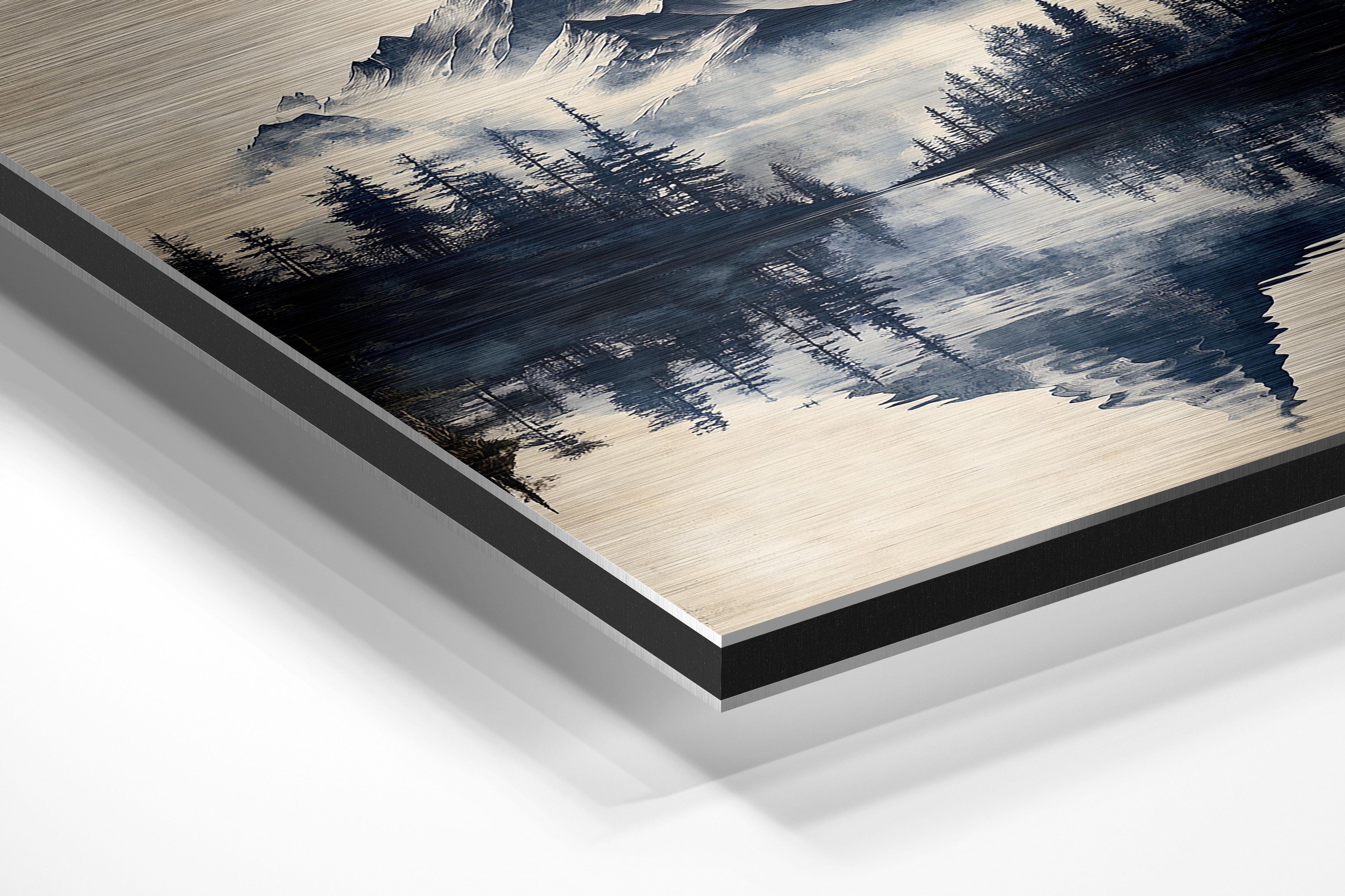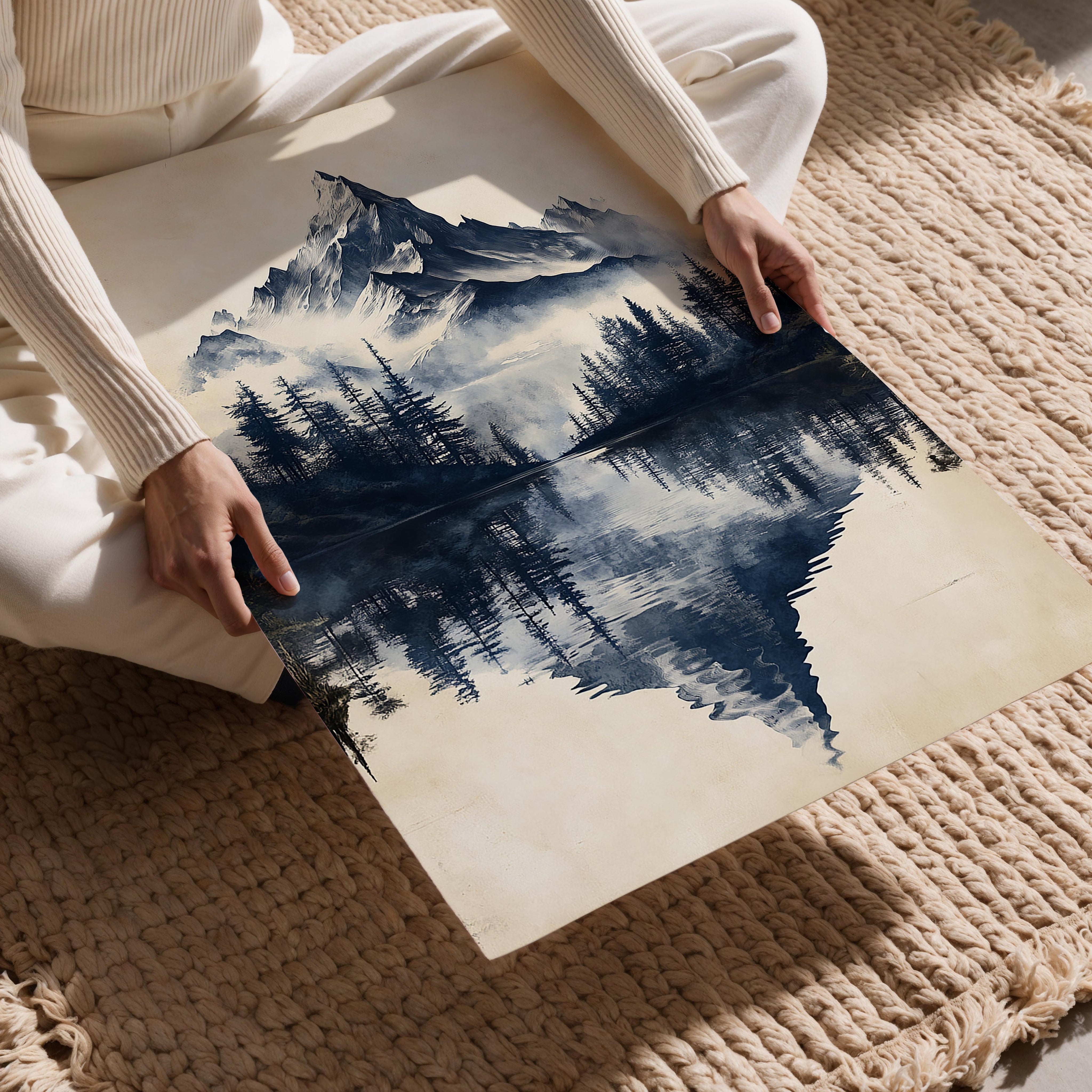 A breathtaking landscape featuring a towering snow-covered mountain perfectly mirrored in the calm lake below. Mist rises gently from the water, adding a mystical touch to the serene scene. The tall pines on the lake’s edges frame the image beautifully, enhancing its natural elegance. The neutral color palette, with soft blues and grays, makes it a tranquil and timeless piece. Perfect for nature lovers, this artwork brings a sense of peace and balance, ideal for meditation rooms, living spaces, or offices in need of a calming touch.