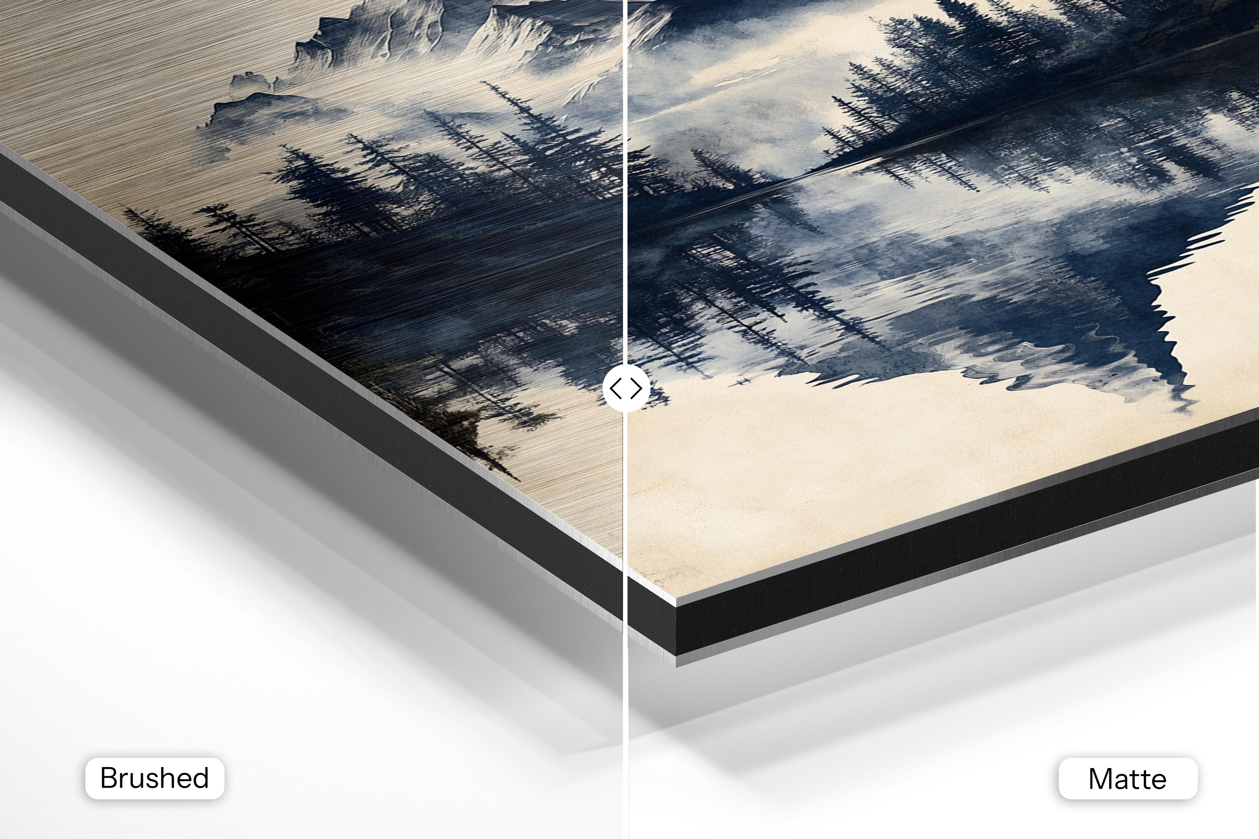 - Brushed Aluminum, on the other hand, features a raw metallic texture with visible brush strokes. Whites and highlights in your image let the silver surface show through, adding a dramatic, shimmering effect. Ideal for black-and-white images, minimalist designs, or abstract art, it creates a bold, industrial vibe with a modern edge.
