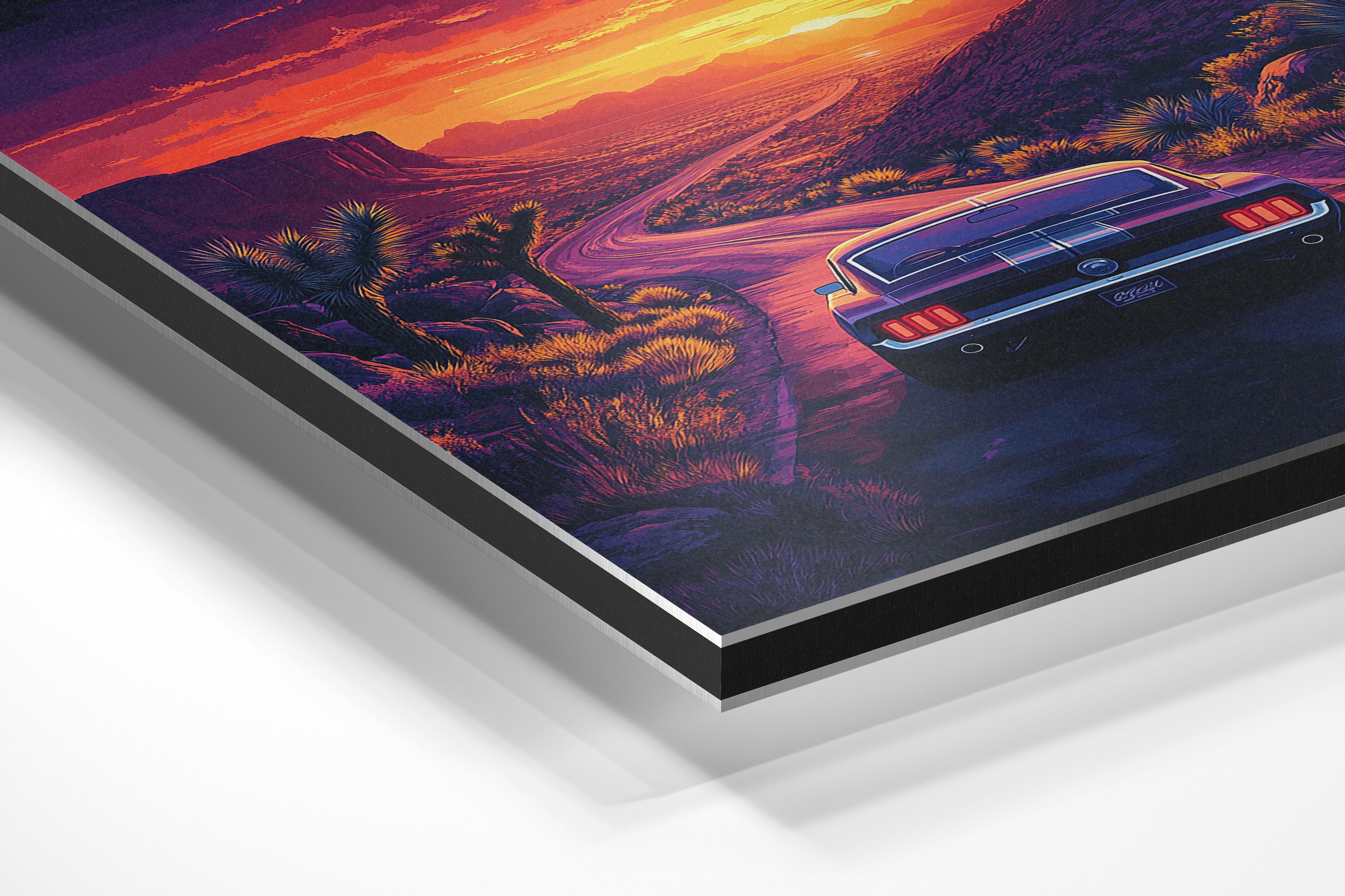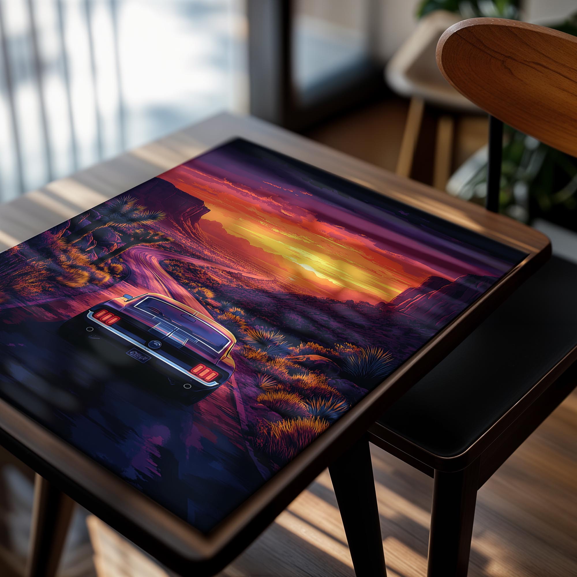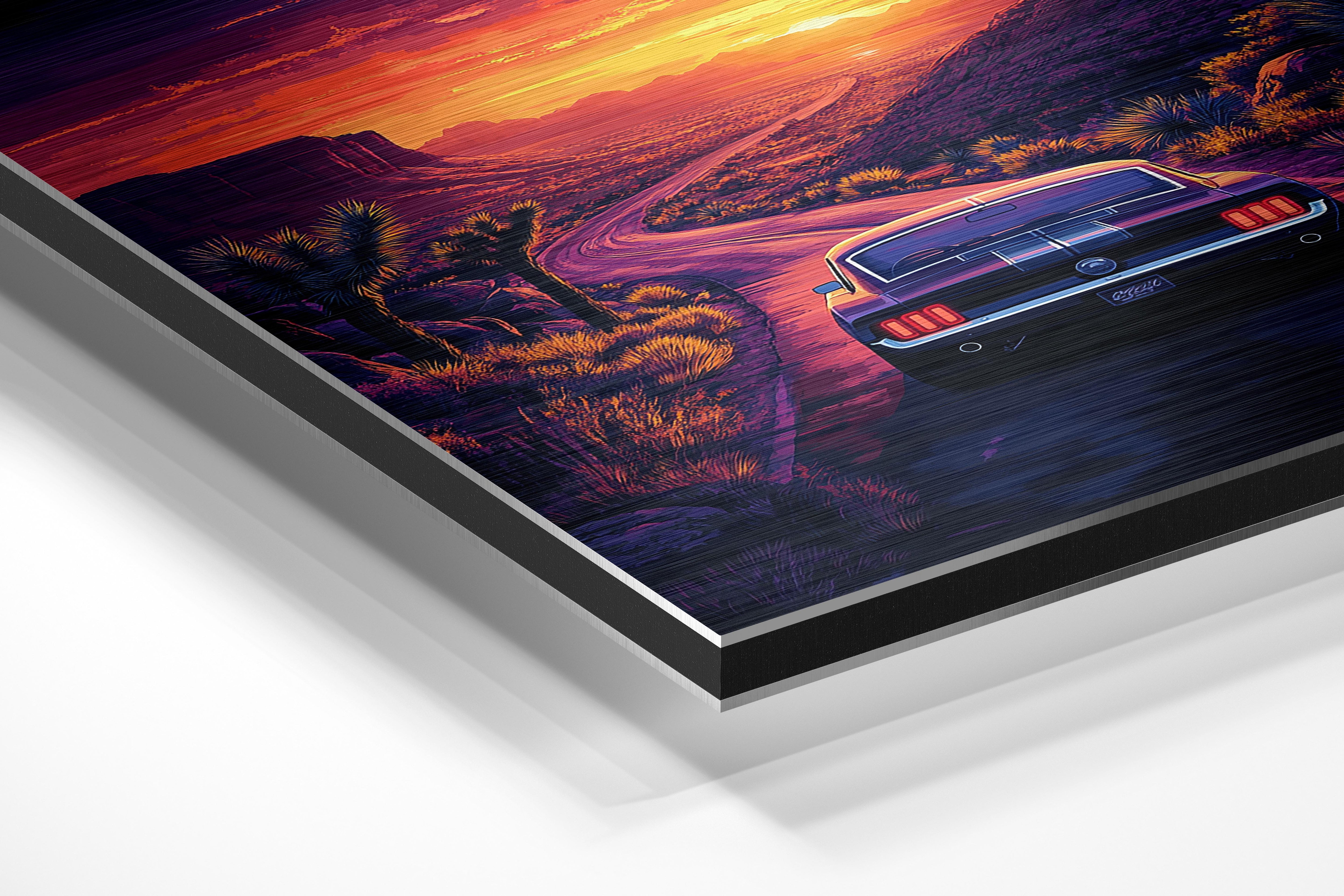A classic Mustang drives into a breathtaking desert sunset, symbolizing freedom and the allure of the open road. The vibrant orange and purple tones make this artwork warm and inviting. It fits beautifully in offices, living spaces, or automotive-themed interiors.